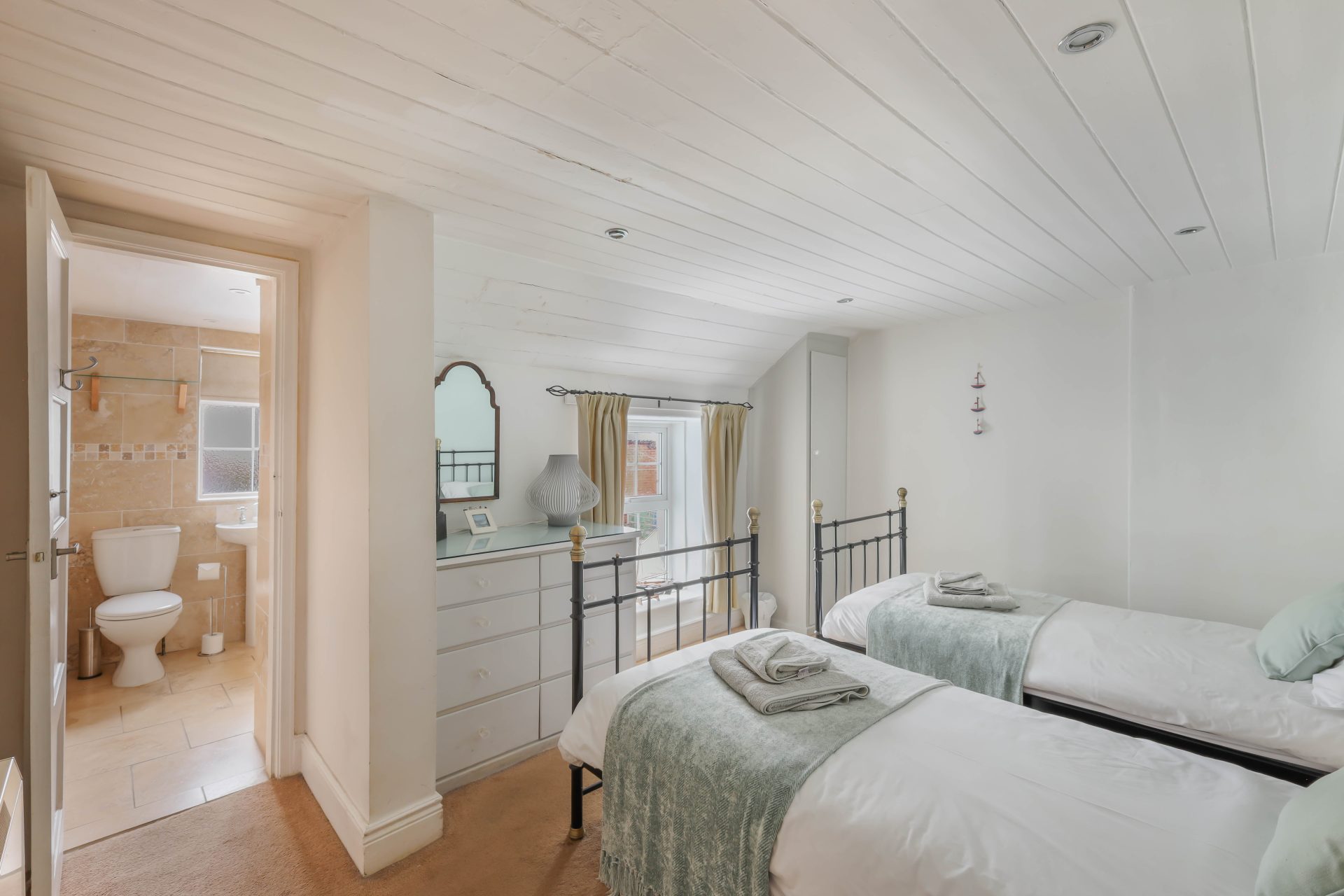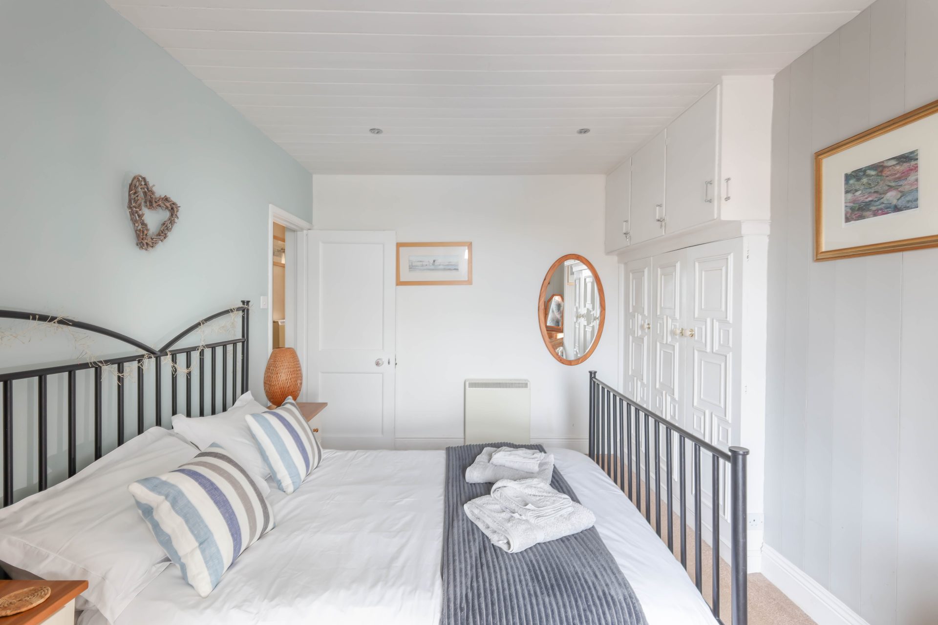 First floor – First floor landing with access to the attic via a pull down ladder | Double bedroom one with fabulous views of the harbour and sea, wood panelled walls, and built in wardrobes/storage | Ensuite with double length shower, wash hand basin, WC and chrome ladder radiator | Double bedroom two bedroom with a built in wardrobe and drawers | Ensuite with corner shower, wash hand basin, WC & heated towel rail.