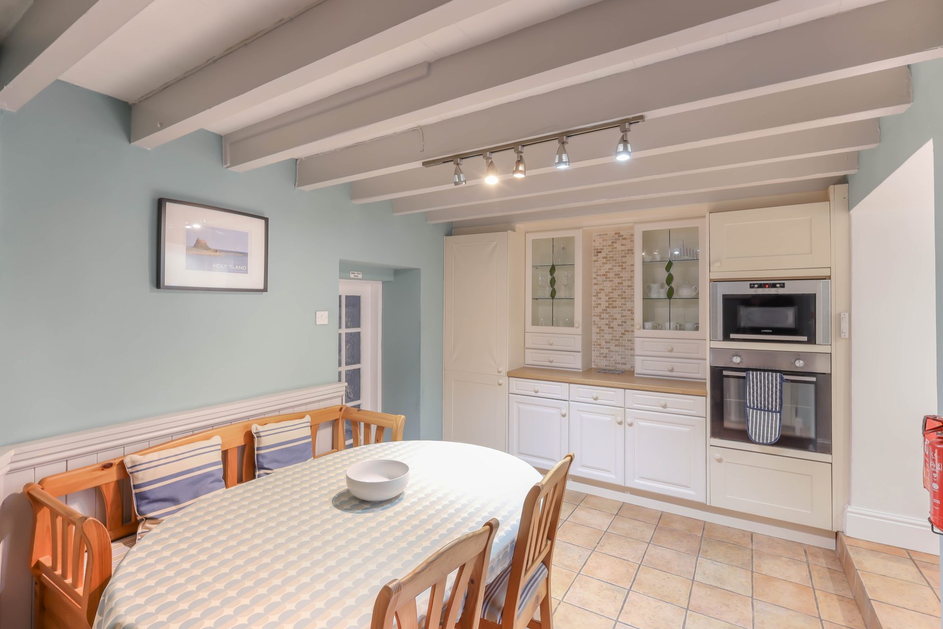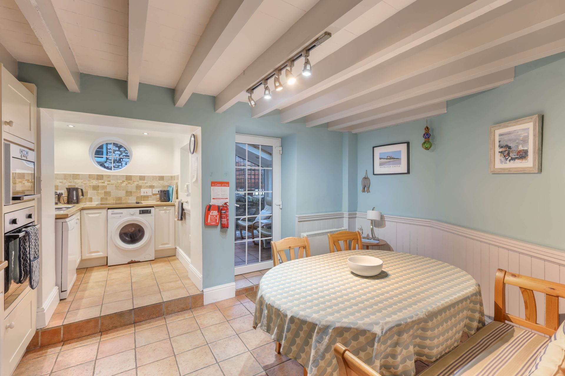 Ground floor – Lovely Sitting room with painted exposed beams and a staircase to the first floor – built in bookshelves and part wood panel walls, and gas fire | Well appointed Kitchen/dining room fitted with a range of cabinets, with integrated oven, microwave, hob, dishwasher, washing machine, fridge/freezer and ample space for a dining table and chairs – the room has painted beams to the ceiling, part wood panel walls, and good natural light from the two windows and feature porthole window to the rear | A glazed door leads from the kitchen to the Garden/Reading room, with a Velux window and door to the rear courtyard garden.