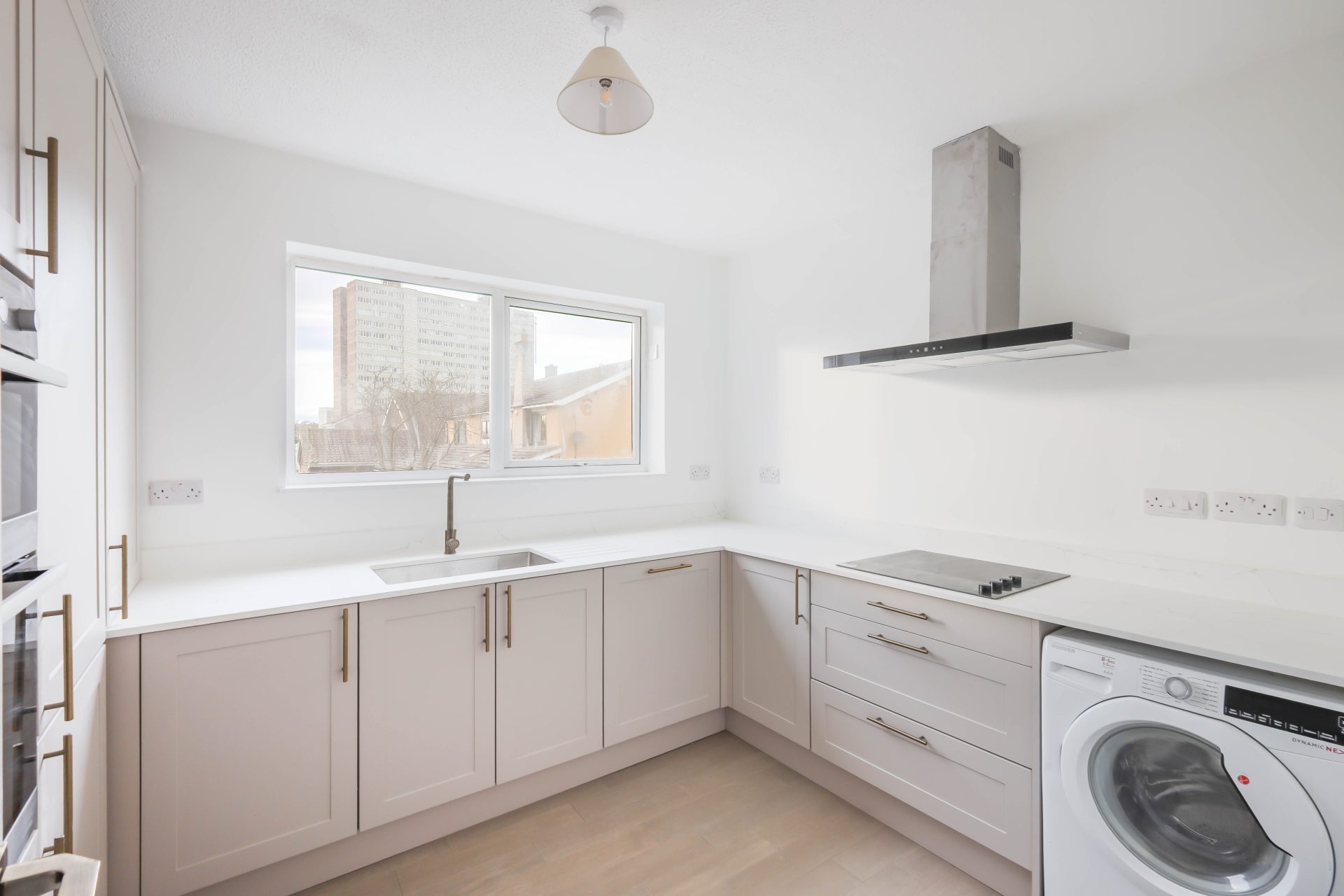 The building is accessed via a secure entry phone system, with communal stairs leading to the first floor where the apartment is located. Upon entering there are two built-in storage cupboards providing practical space, along with a stylishly presented W/C that is partially tiled. The hallway features newly installed engineered wood flooring, creating a modern and cohesive first impression.