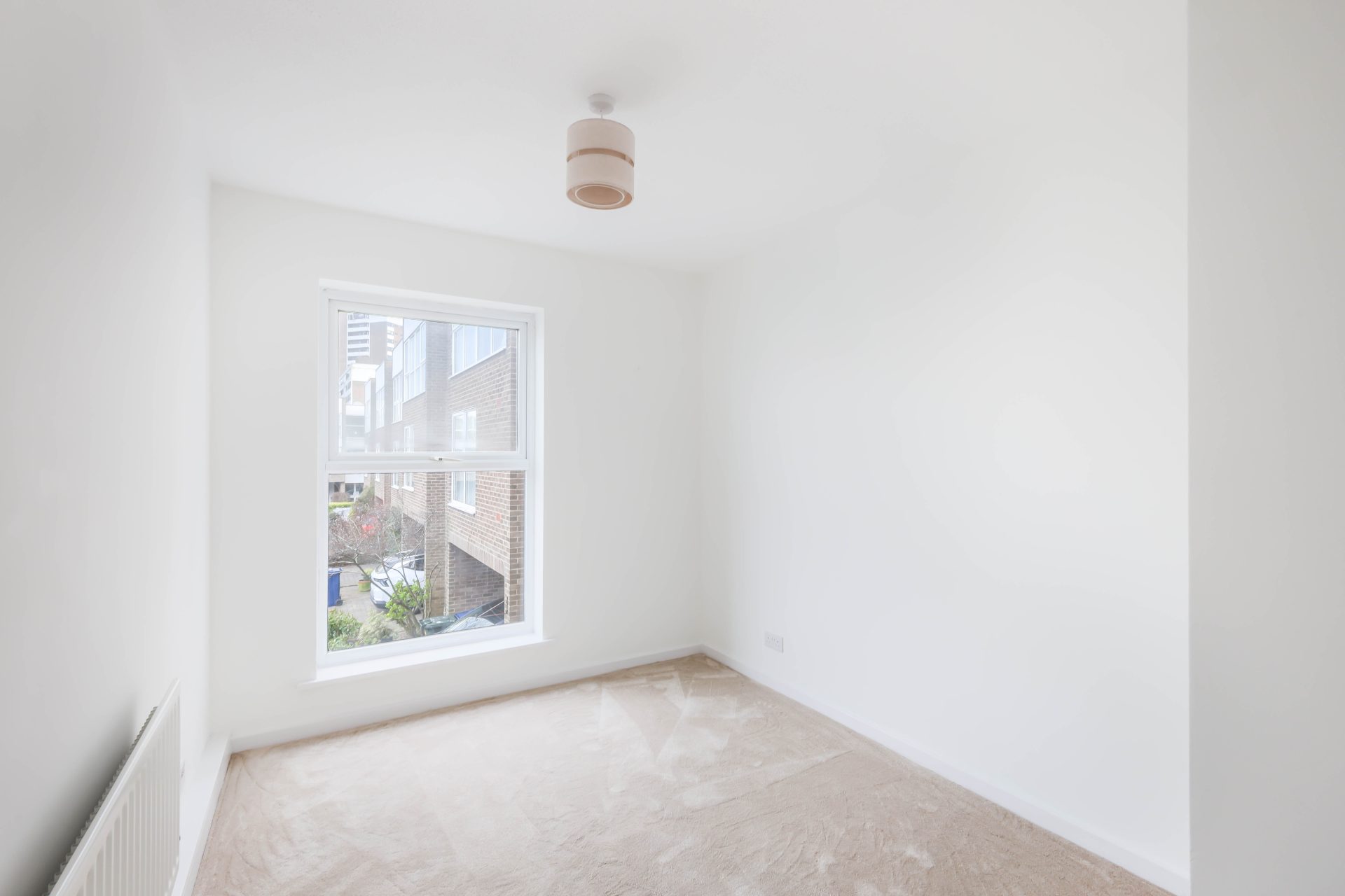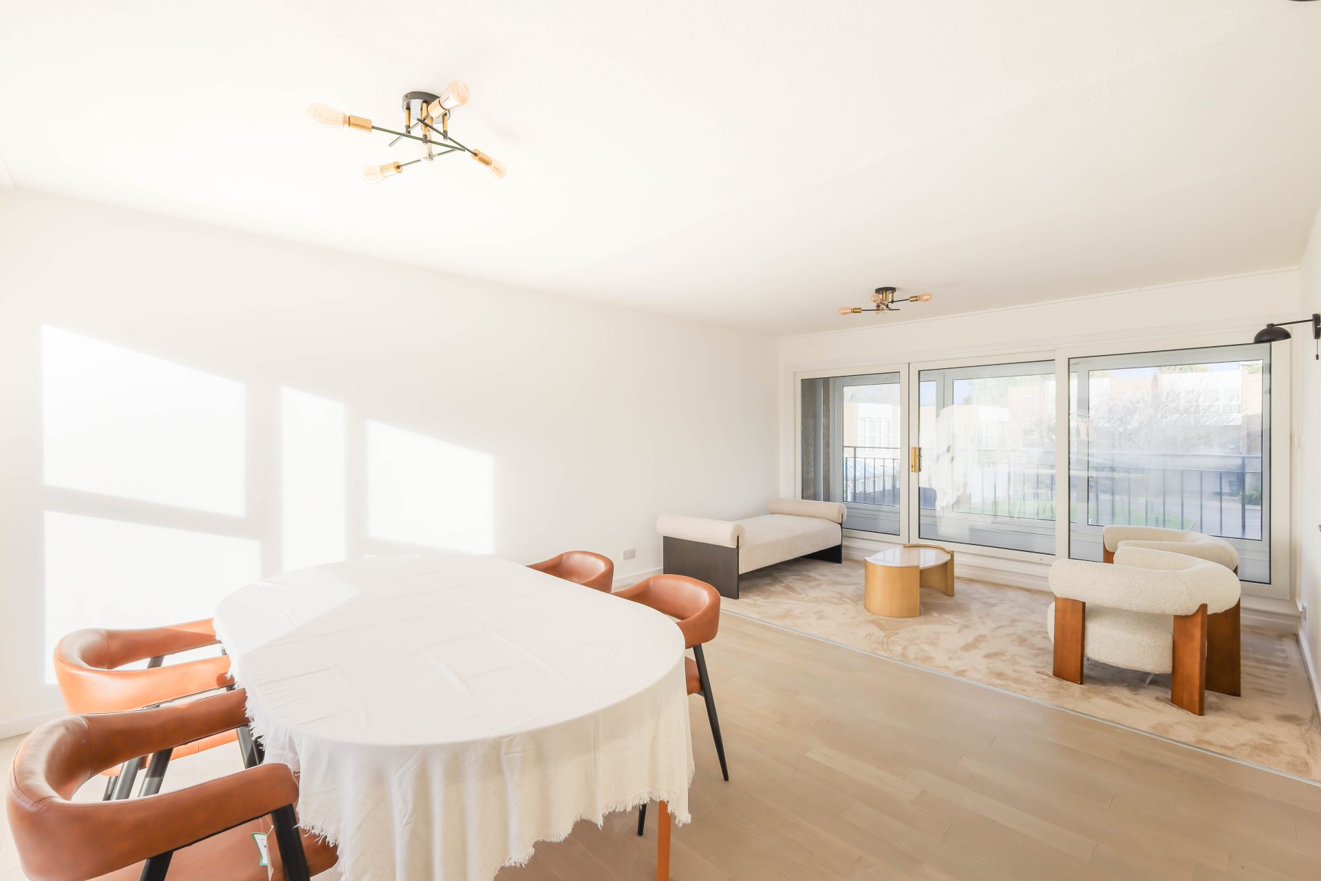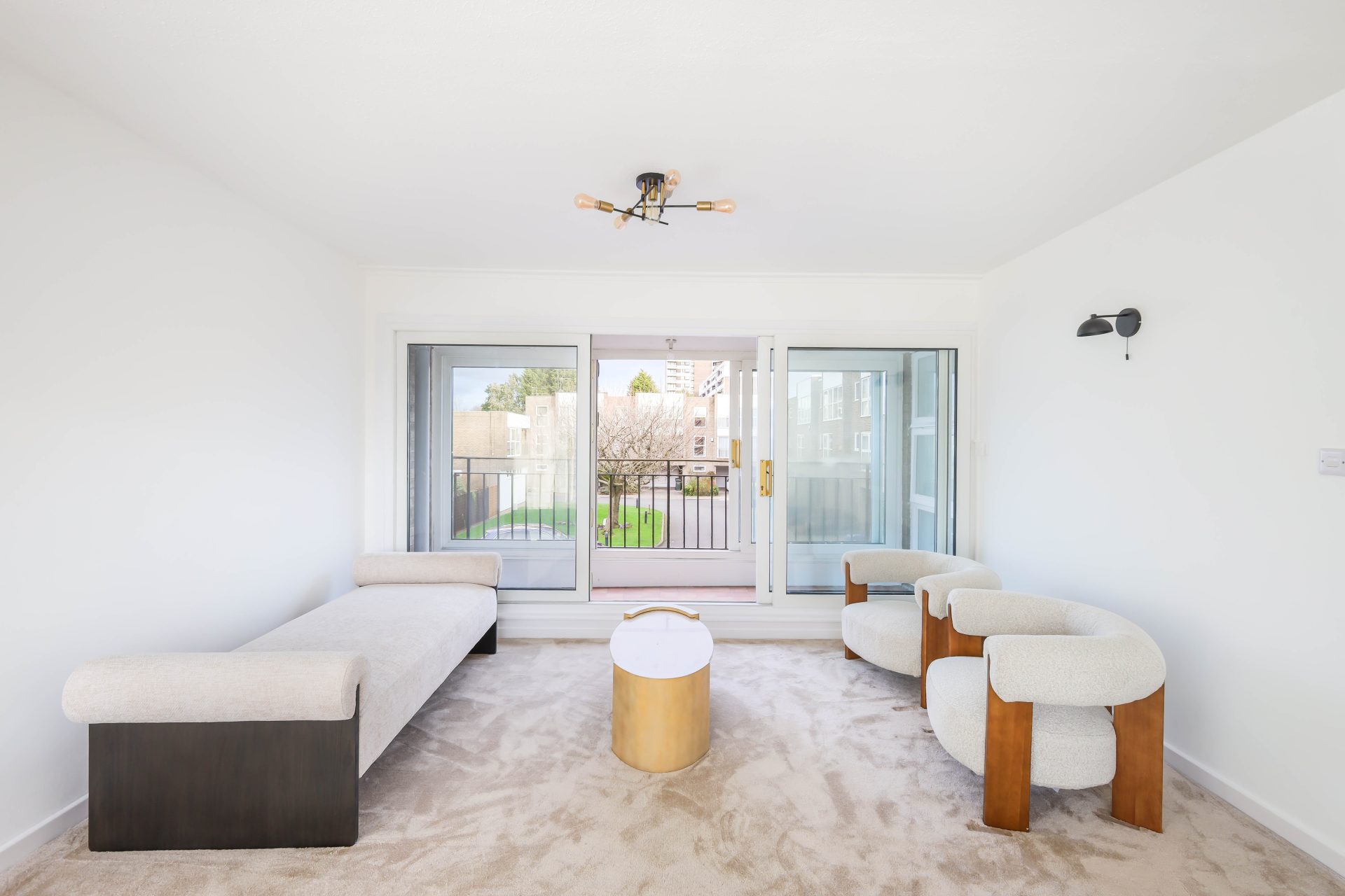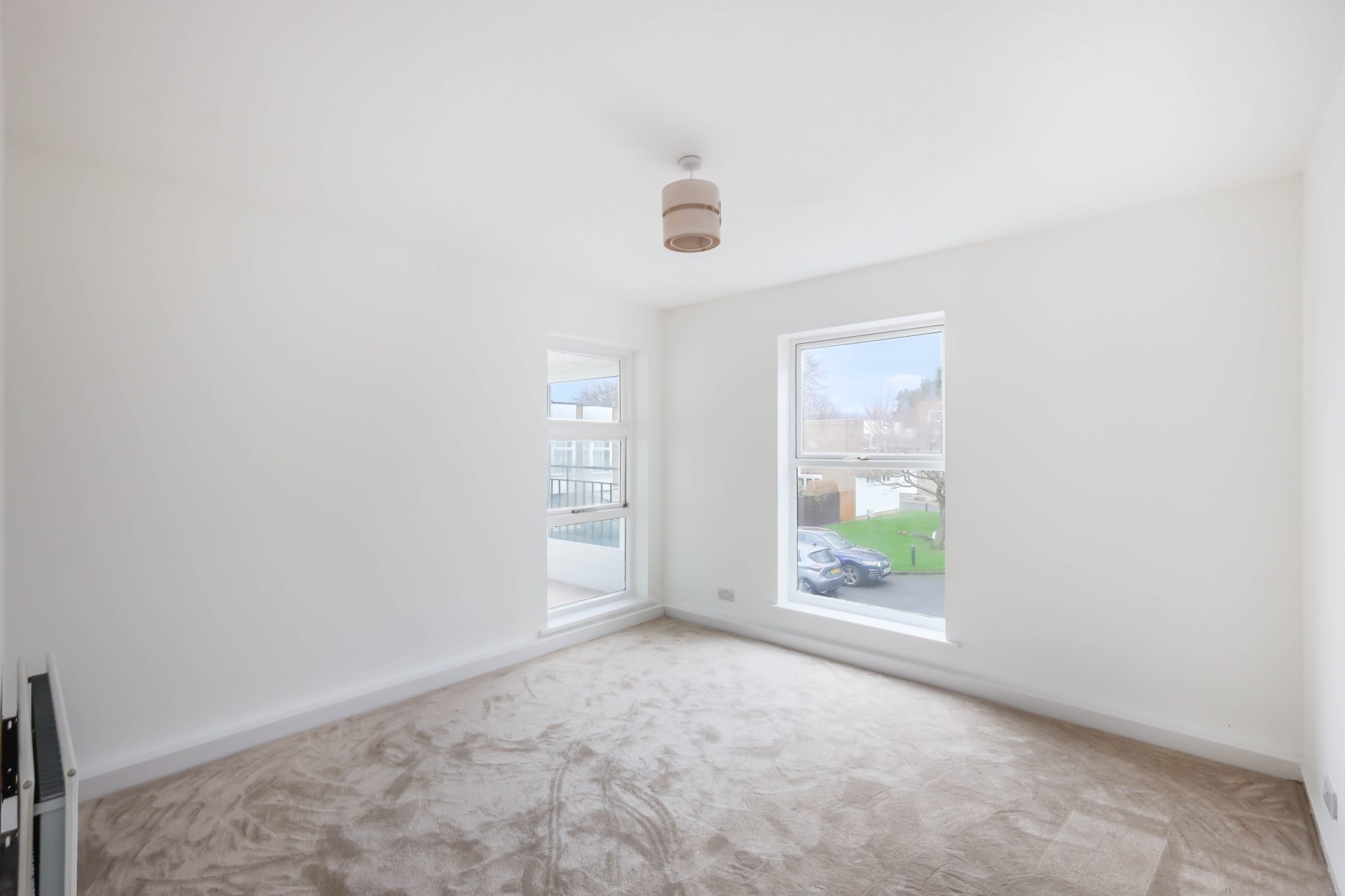 There are two generously proportioned double bedrooms, both newly carpeted, offering comfortable accommodation. The newly fitted bathroom is completed with a contemporary three-piece suite, complemented by tasteful tiling and an electric shower over the bath. The newly installed kitchen is a particular highlight, finished to a high specification with quartz worktops, a range of wall and base units, and integrated AEG appliances including a dishwasher, double oven, washer dryer, induction hob, and fridge freezer. The living and dining area benefits from a dual aspect, allowing for excellent natural light, and provides access to a private balcony overlooking Albany Mews, adding to the overall appeal of the space.