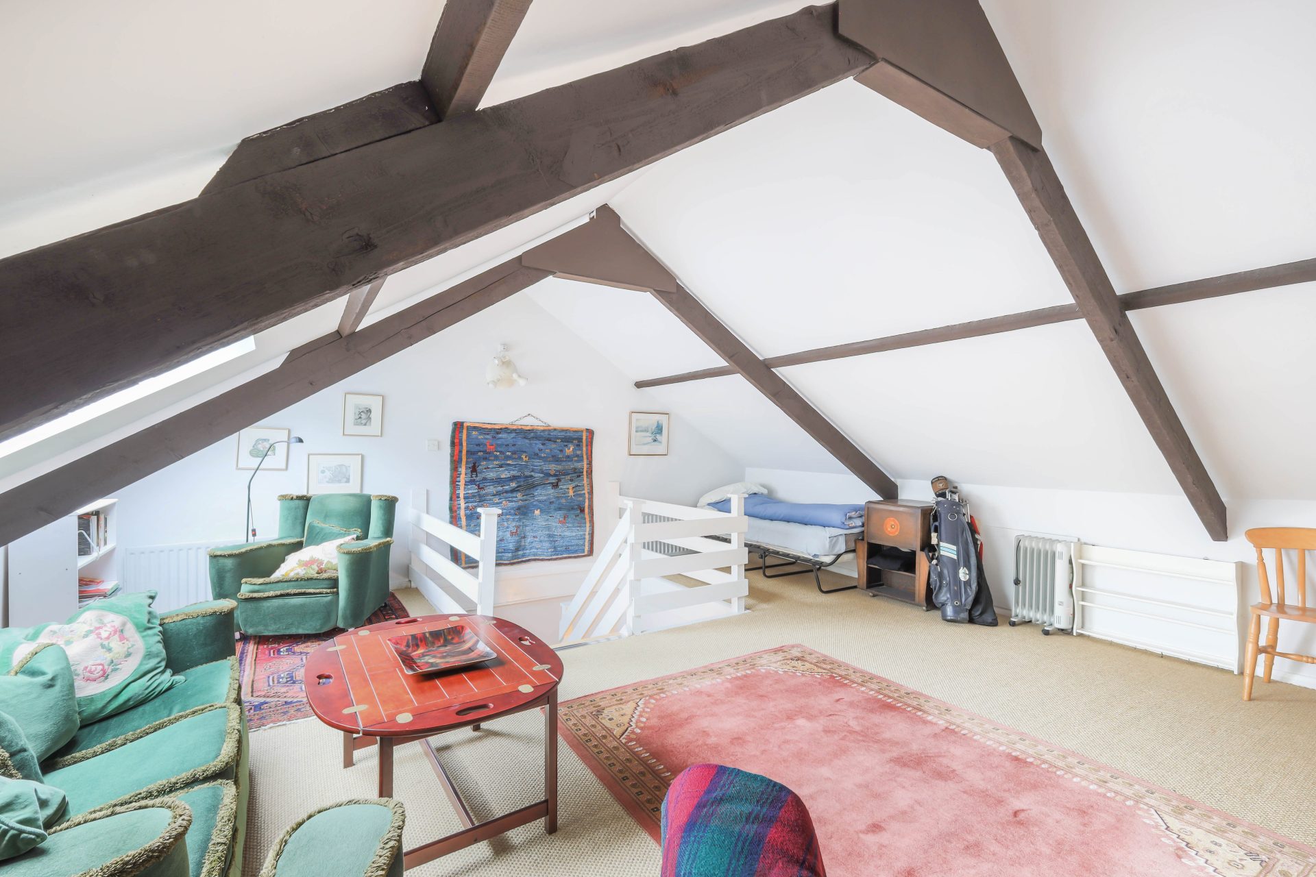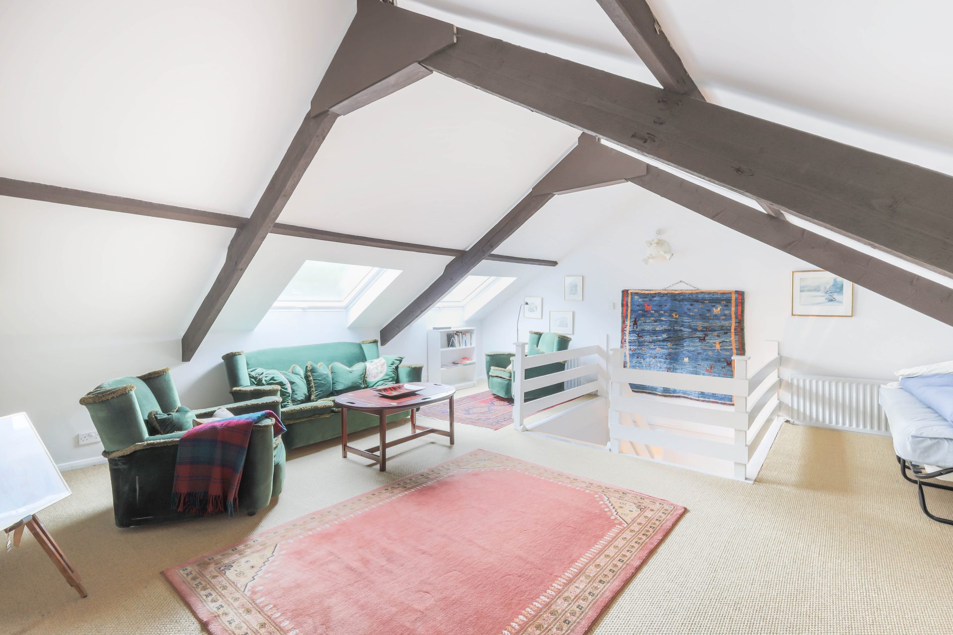 Stairs from the landing ascend to the converted loft, a bright and spacious room flooded with natural light from two large Velux windows. Currently used as an additional lounge, this versatile space could serve equally well as a home office, guest room or studio, with far reaching views over the nearby field.