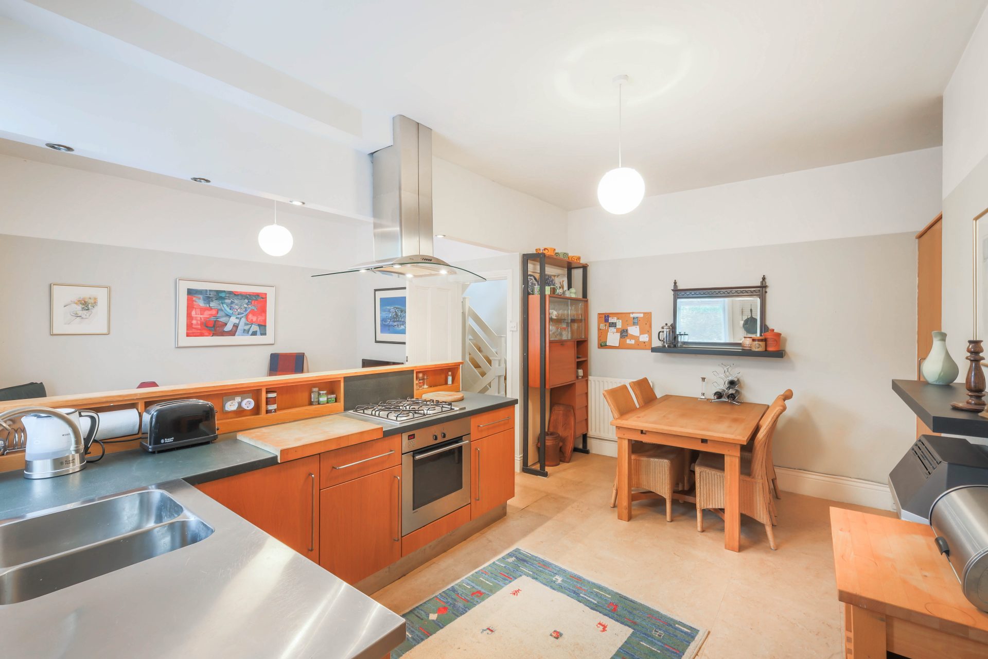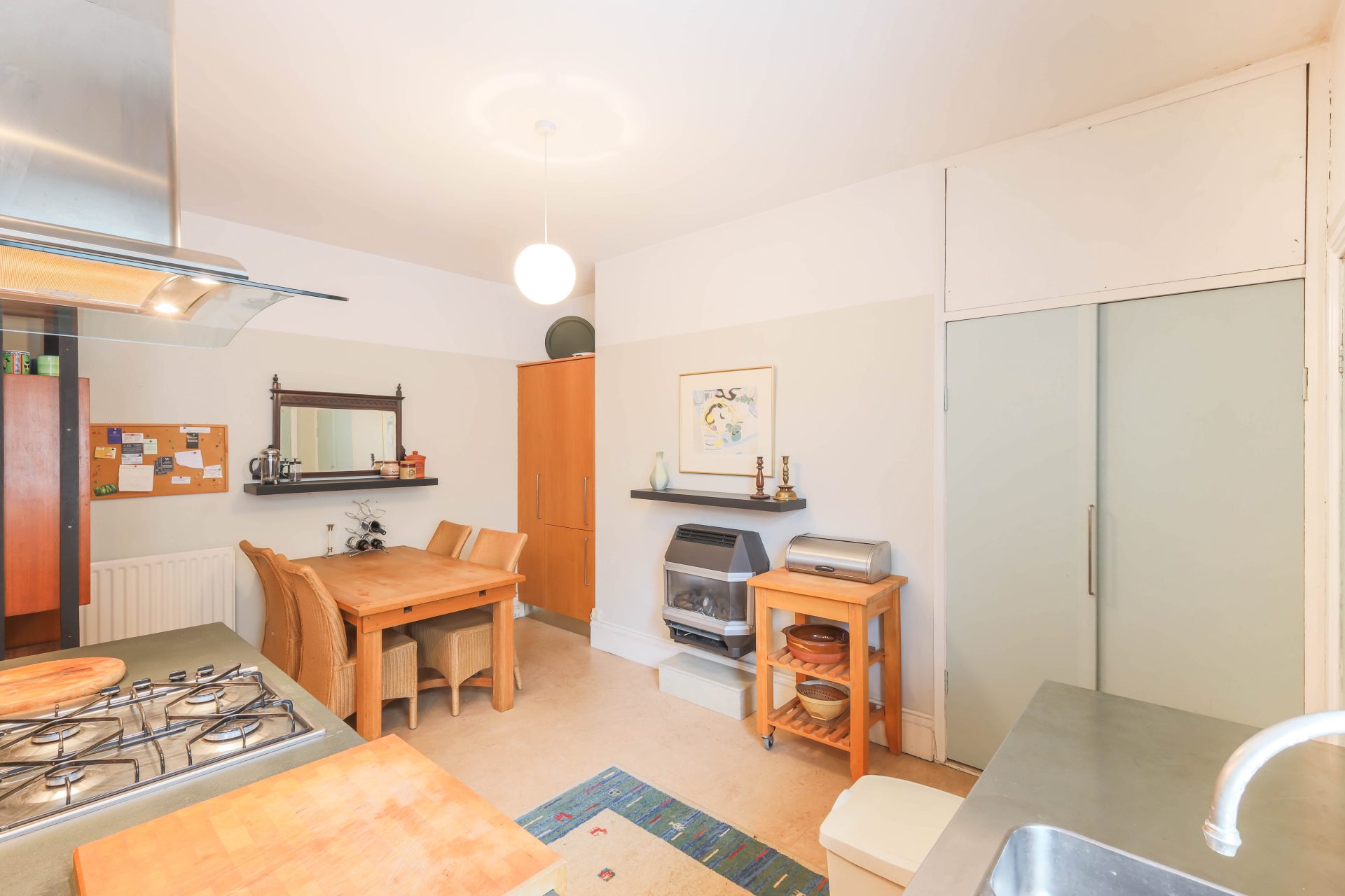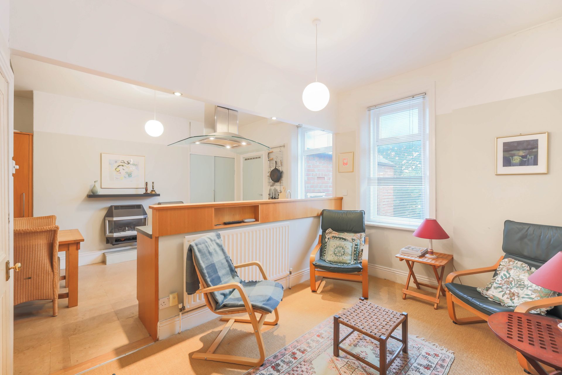 To the rear of the flat lies the impressive open plan kitchen and living area, which has been sympathetically altered by the current owners to create a sociable and inviting space. Part of the dividing wall has been removed to enhance flow and light, resulting in a bright spacious environment ideal for both everyday living and entertaining. The kitchen, fitted by Newcastle Furniture, is of high quality and features a gas hob, oven, integrated fridge freezer and plenty of space for a dining table and chairs. A door from the kitchen leads through to a useful utility area housing the boiler and providing additional storage. Beyond this lies a tiled four piece bathroom suite complete with underfloor heating. From the utility, a rear door provides access to a private yard with a garage door, offering convenient outdoor and storage space.