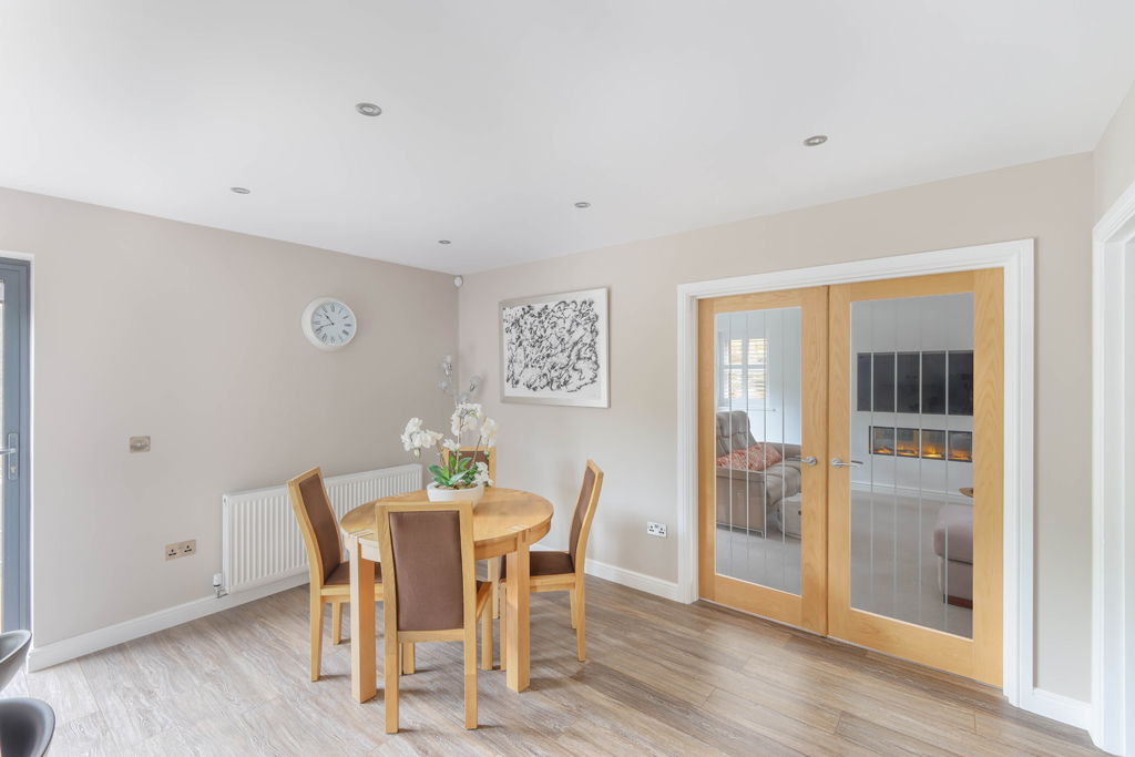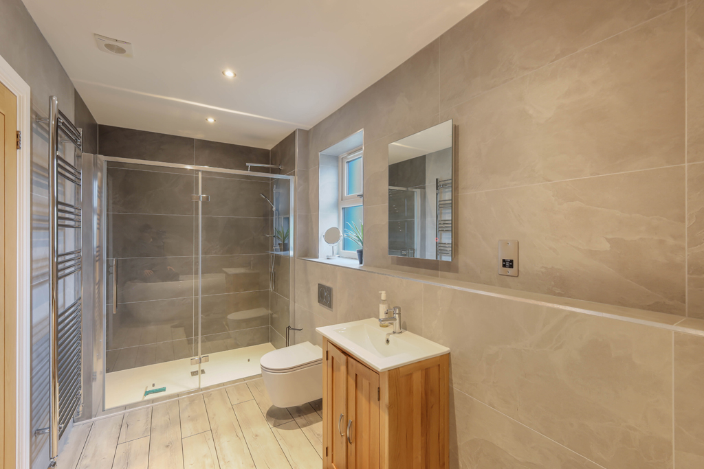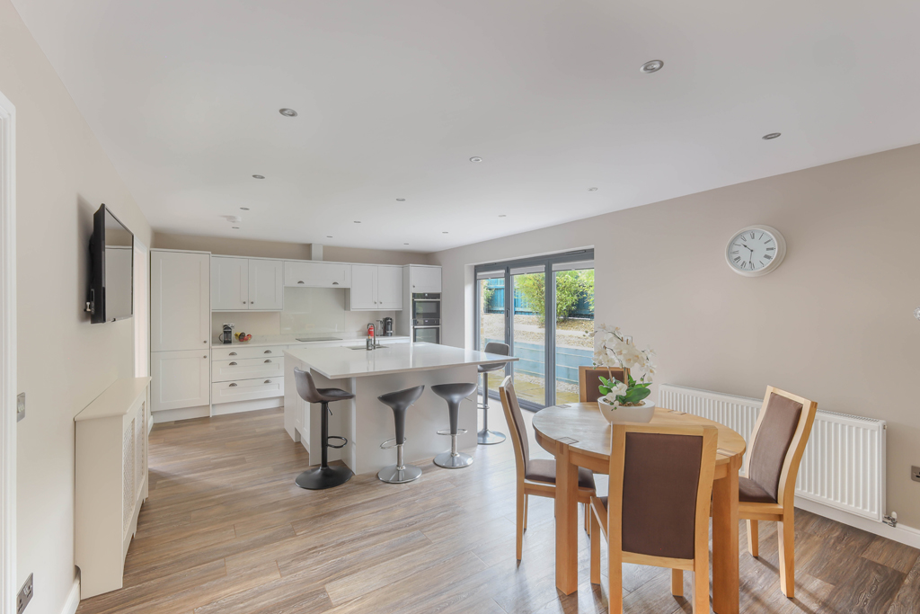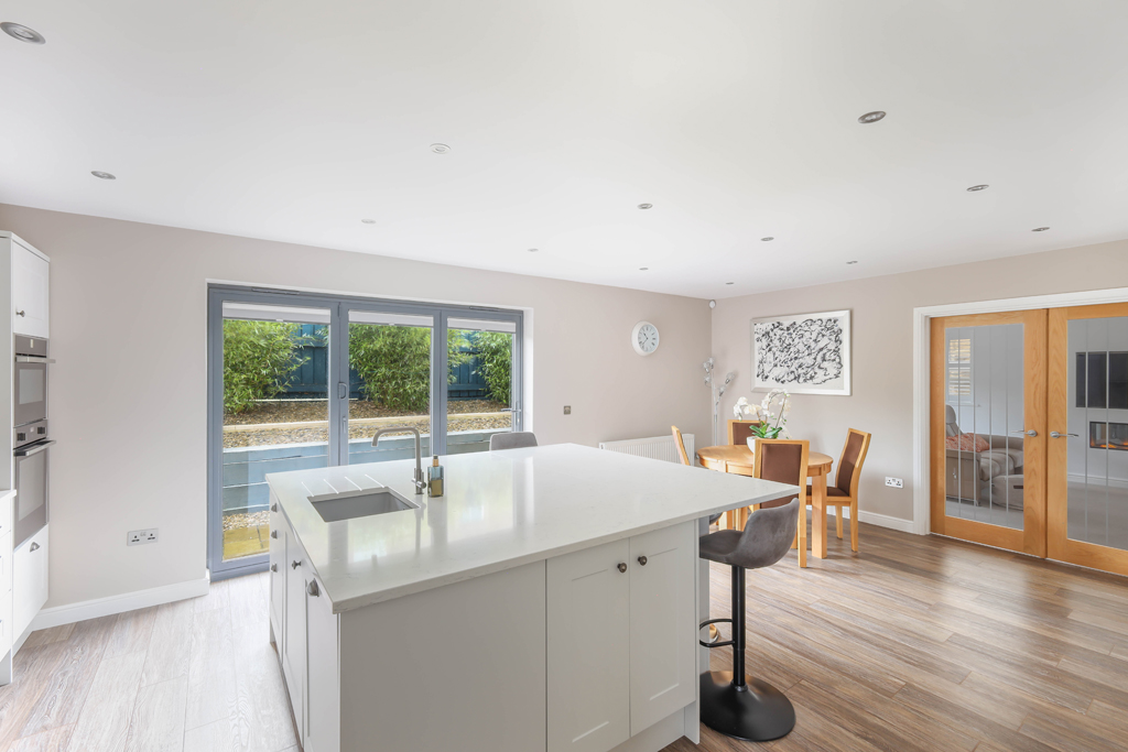 Ground floor – Reception hallway | Cloakroom/wc | Living room with feature contemporary fire and bi-fold doors to the garden | Magnificent open plan kitchen/dining room with large central island, integrated appliances and bi-fold doors to the garden – appliances include hob & extractor, oven, microwave, fridge/freezer, dishwasher and wine fridge | Utility room | Ground floor double bedroom with double door built in wardrobe | Ensuite with enclosed shower, WC and wash hand basin.