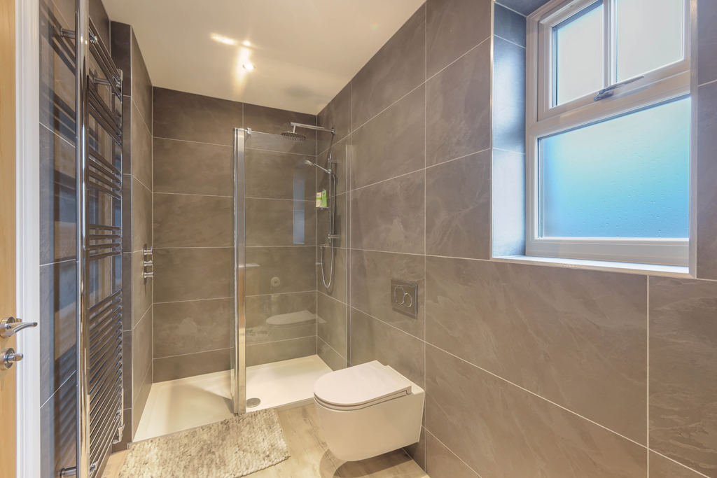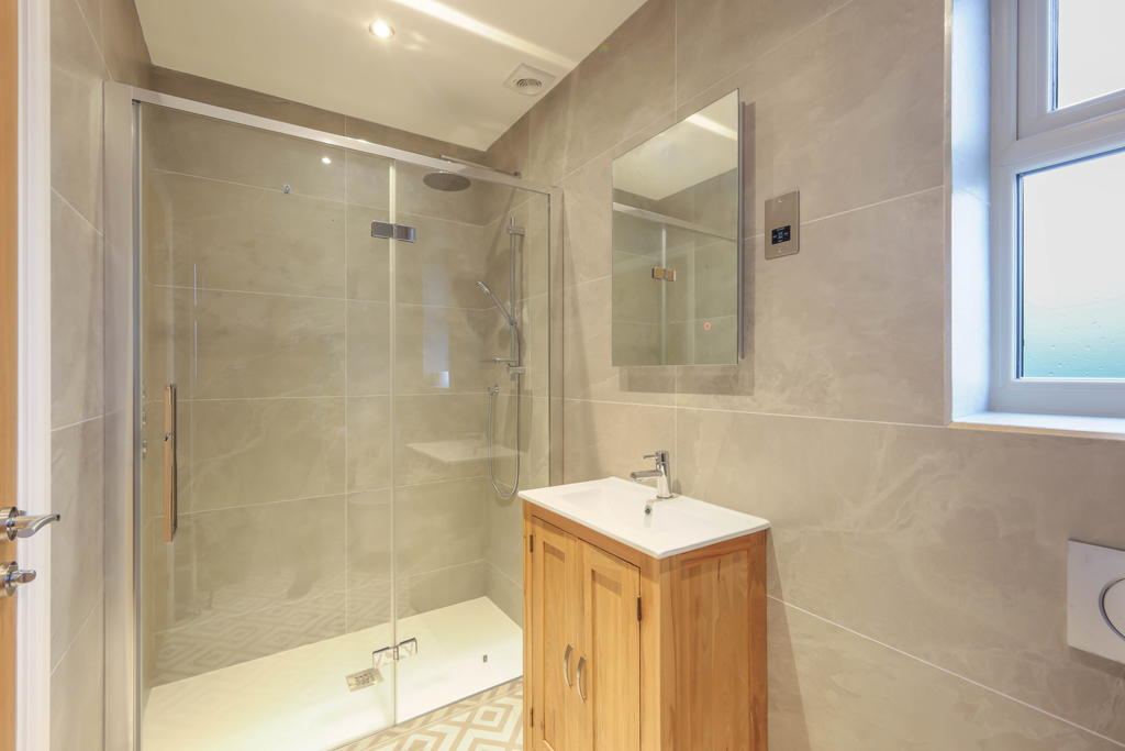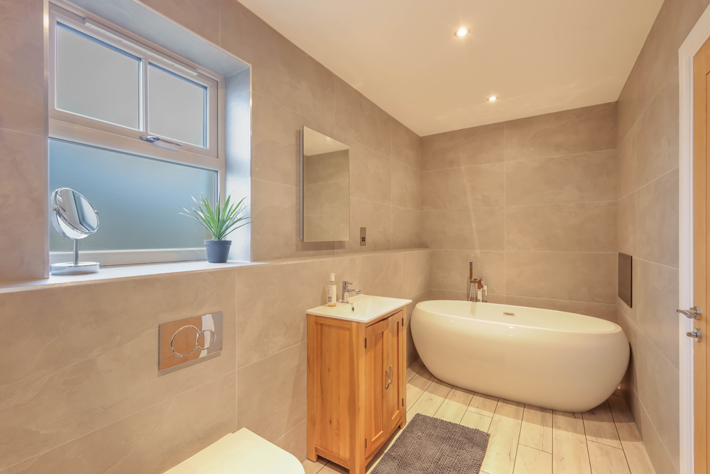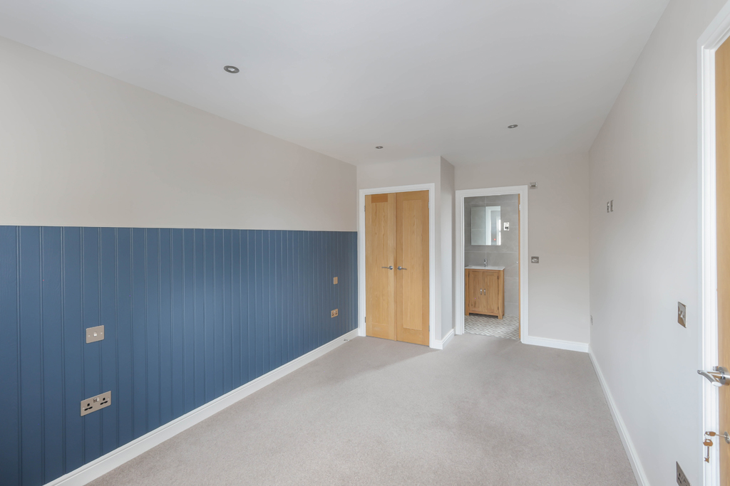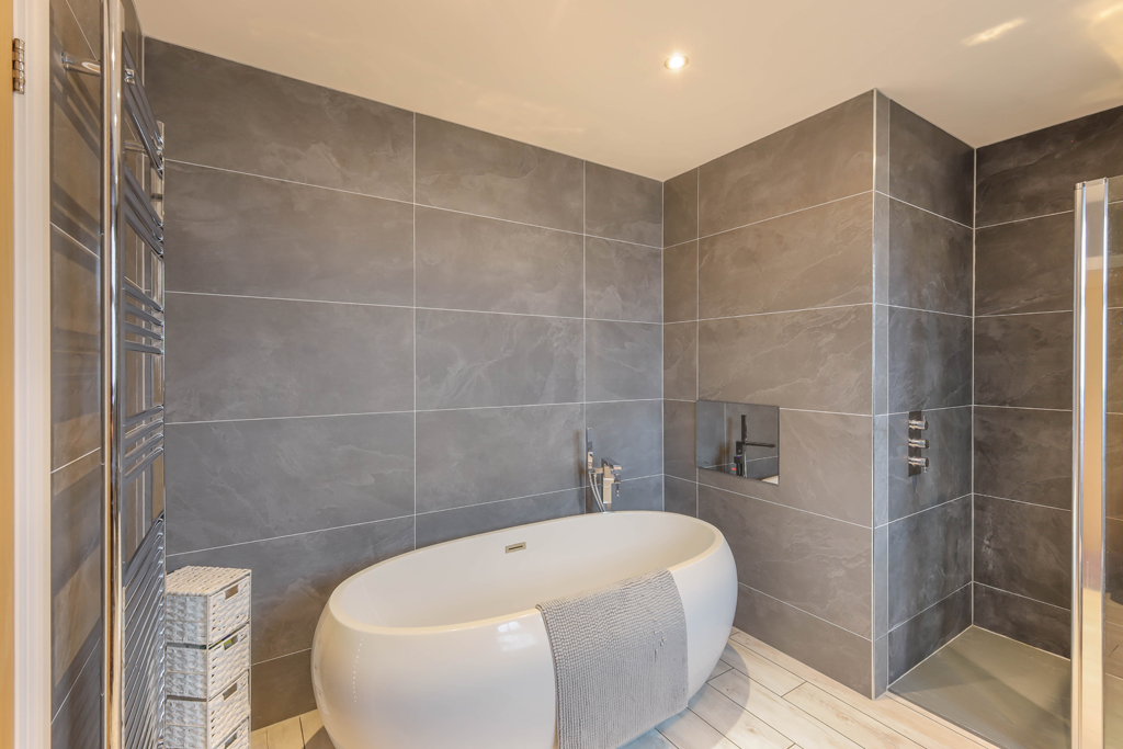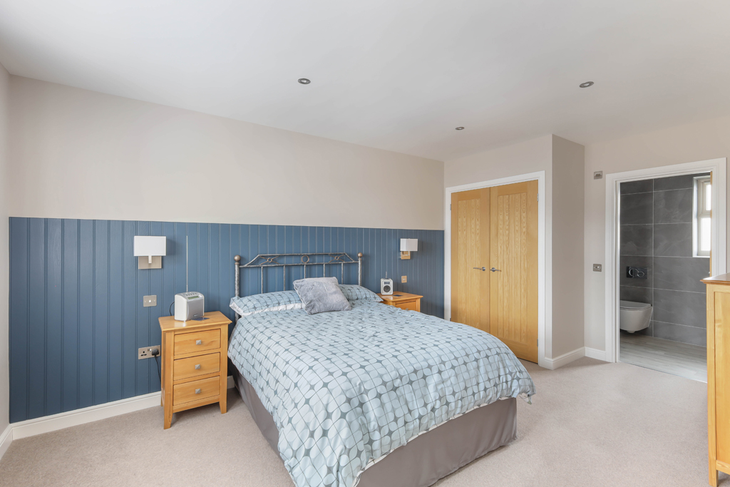 First Floor – Generous first floor landing with excellent natural light from the Velux window, and large storage cupboard | Impressive master bedroom with two sets of double door built in wardrobes | Luxury ensuite with double ended bath, separate walk in shower, integral TV, WC and wash hand basin | Double bedroom two with a built in wardrobe | Ensuite bathroom with double ended bath, separate shower, WC and wash hand basin | Double bedroom three with a built in wardrobe | Ensuite with enclosed shower, WC and wash hand basin.