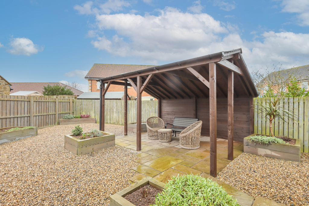 Externally – Attractive landscaped gardens designed for easy maintenance, with raised gravel beds with planting, stone pathways and terraced areas | To the side, there is a large timber gazebo seating area ideal for barbecues and outside entertaining | The block paved driveway leads to the detached garage, with electric roller door and door to the side giving access to the garden | Excellent security and privacy is provided by the two gates to each side of the house.