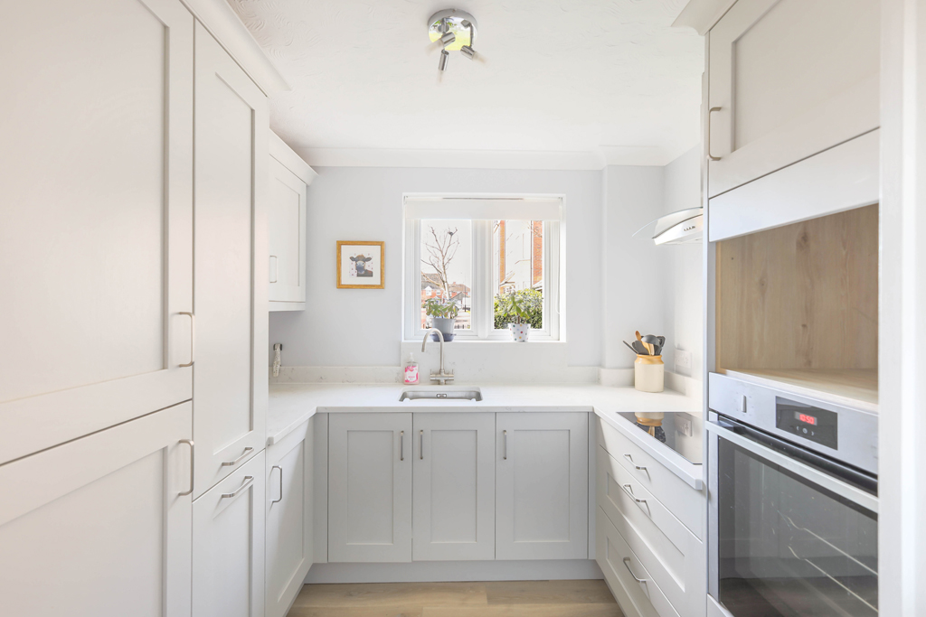 12 Broadway Court is ideally positioned on the ground floor and offers generously proportioned accommodation. The west facing aspect allows for wonderful natural light, particularly in the afternoon and evening. The entrance hallway is spacious and inviting, leading through to the kitchen and living area. The kitchen is both modern and thoughtfully designed, featuring a Neff oven, Smeg hob and elegant quartz worktops. There is also an integrated fridge/freezer and a west facing window that fills the space with natural light. The living room is a particularly attractive feature of the property, a bright spacious room with door opening onto a private patio area.