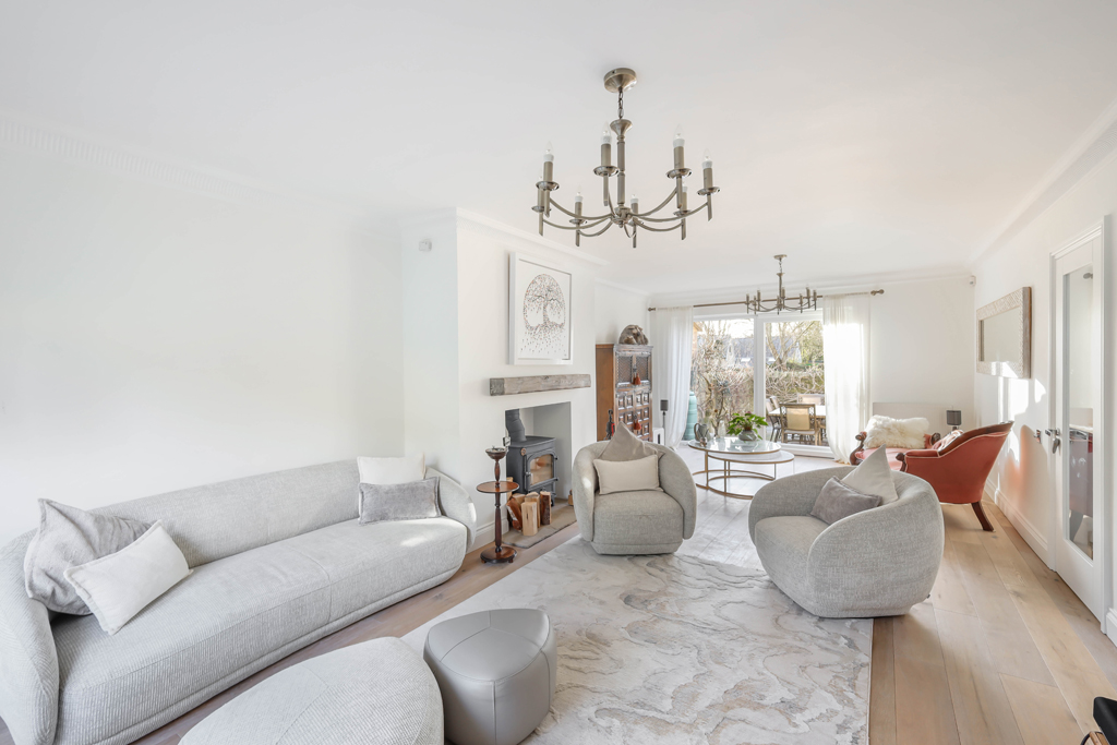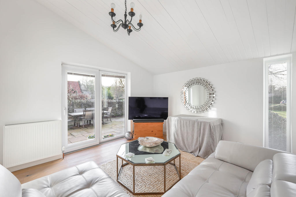 The principal living area is a generously proportioned and elegantly presented room, featuring patio doors opening onto the rear garden. A centrally positioned log burner creates a warm and inviting focal point, while sliding doors provide access to the front courtyard. In addition, there is a secondary lounge situated at the front of the property, which benefits from an impressive high vaulted ceiling and also enjoys sliding doors leading out to the courtyard. Completing the ground floor accommodation is a well presented, half tiled downstairs WC.