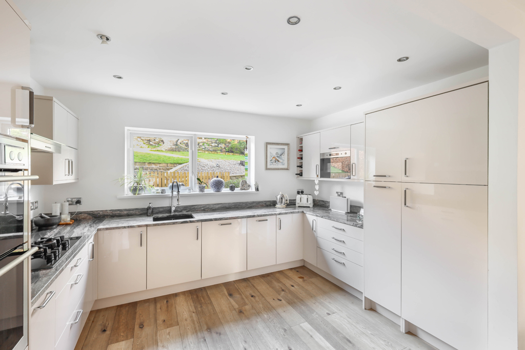 The kitchen and dining area form a fantastic light filled space, fitted with a high quality kitchen incorporating a built in fridge, microwave, double oven, gas hob, integrated dishwasher. The outlook from the sink over the rear garden is particularly attractive and offers a high degree of privacy. A door from the kitchen leads to the utility room, which provides space and plumbing for a washing machine, tumble dryer and fridge freezer. From here, access is gained to an external utility area, with space for a fridge, freezer and a large chest freezer, which in turn leads into the double garage, offering ample storage and benefiting from an electric door. A further door from the outer utility opens directly onto the rear garden.