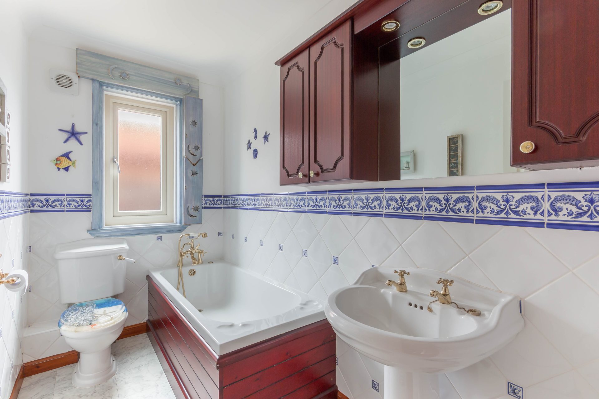 Lower ground floor – Stairs lead down to two bedrooms, a bathroom and access to the double garage & Utility area | Double bedroom with space for freestanding bedroom furniture | Twin bedroom four | Bathroom with white bath with antique style shower attachment, wash hand basin, WC and a window with shutters | Large double garage/games with a utility area with plumbing for a washing machine, space for a tumble dryer and housing the oil boiler.