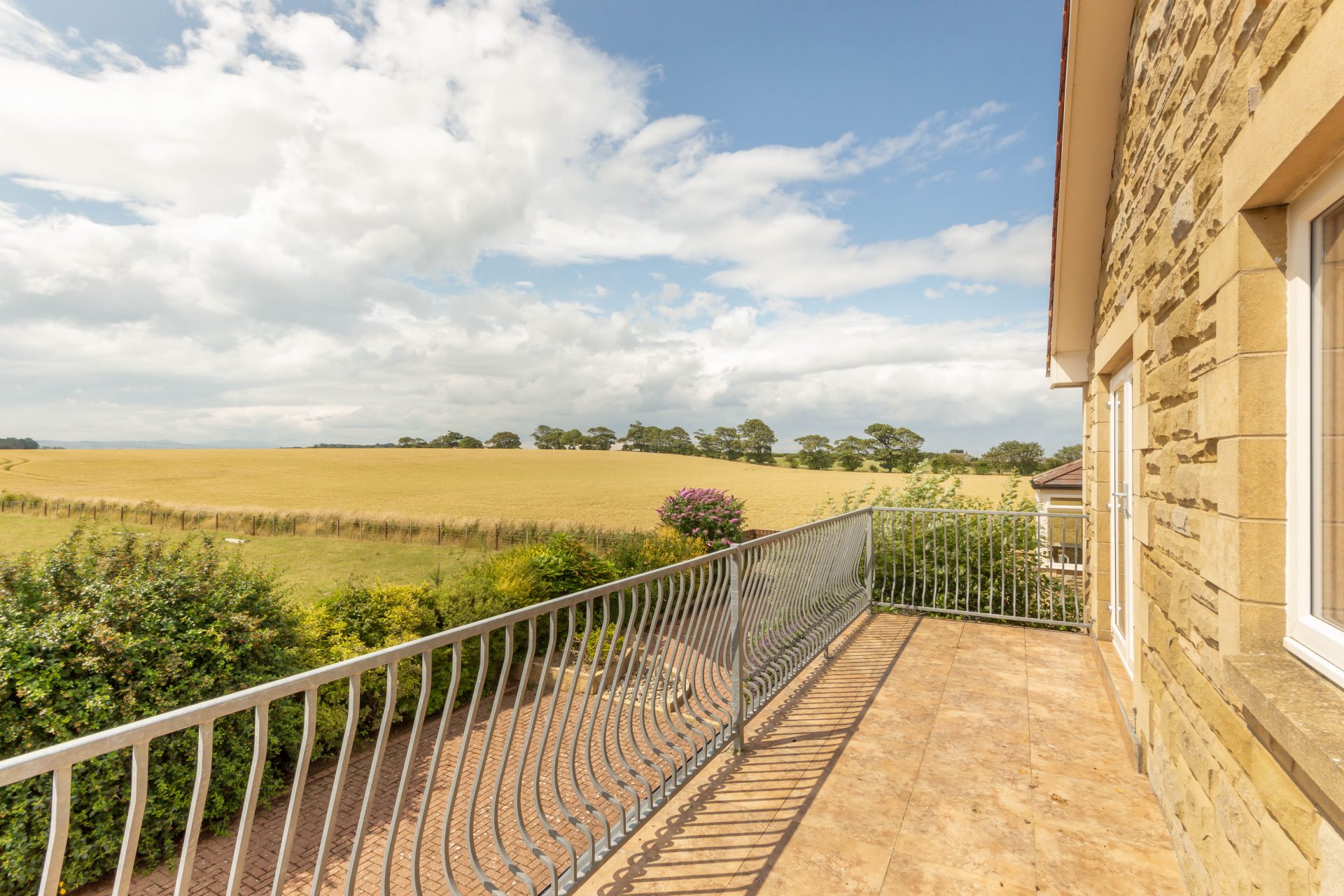 First floor – First floor landing with a built in linen/airing cupboard and loft access | Fabulous master bedroom with dual aspect windows and French doors opening to the balcony, giving stunning west facing views towards the Cheviots – the balcony is the full width of the bedroom, with a tiled floor and wrought iron balustrade railings – built in double door wardrobe and ensuite | Ensuite with a walk in shower with body jets and a seat, and a wash hand basin and WC in a vanity cabinet | Two further double bedrooms, each with built in double door wardrobes | Family shower room with a walk in shower with a rainfall head, rectangular basin in a vanity cabinet, WC and window with shutters.