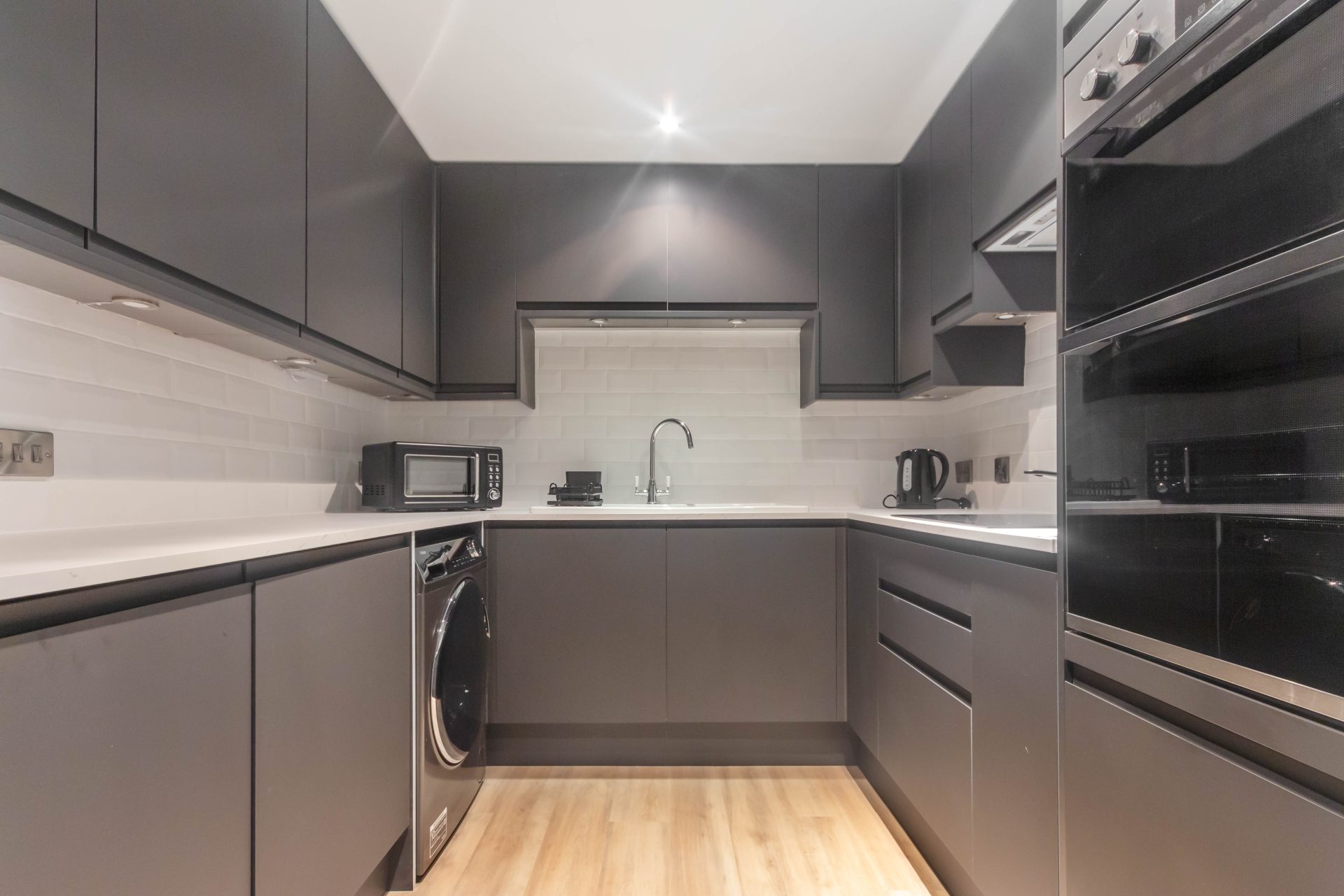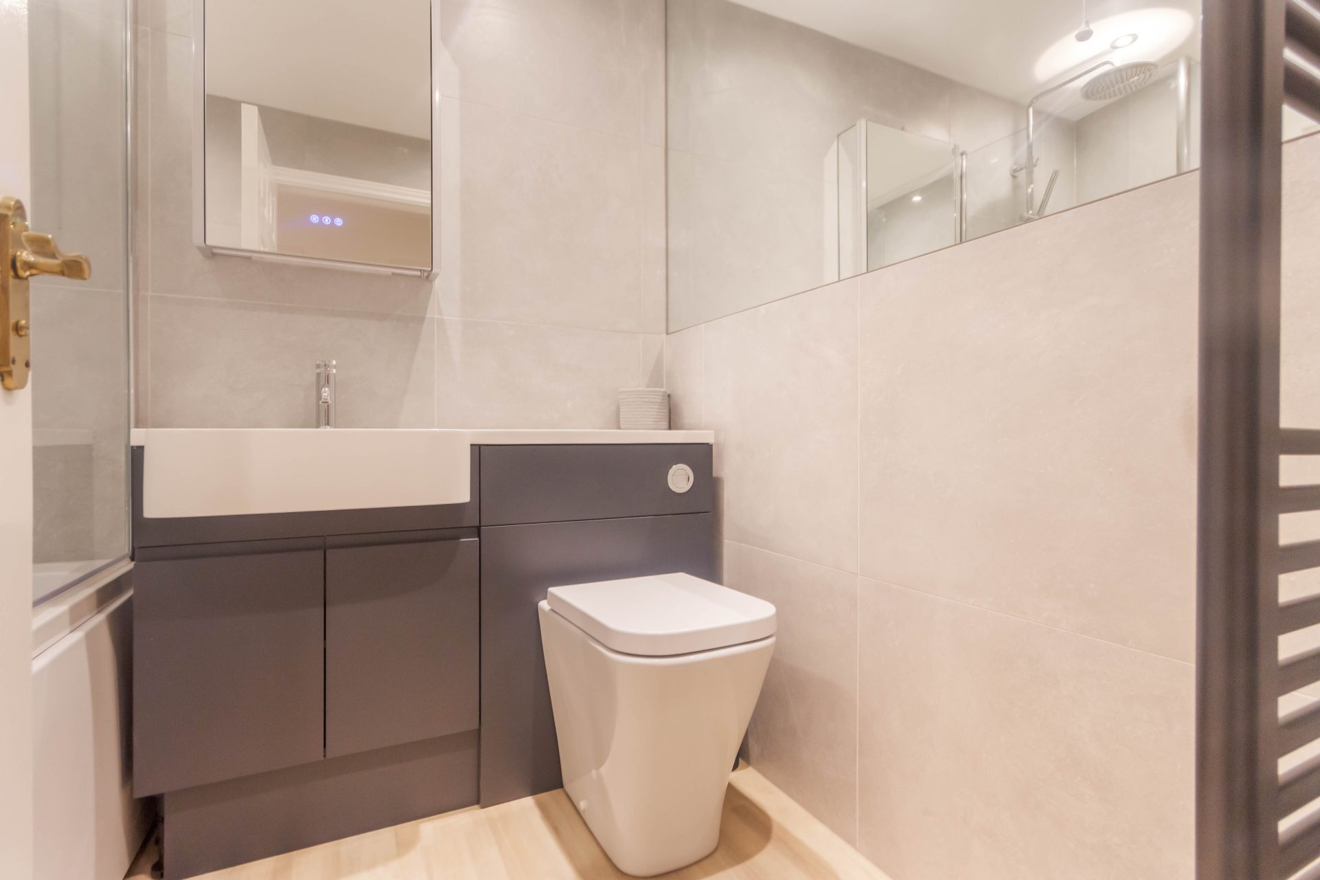 Comprising : reception hallway with two cupboards one housing the tank and the other with storage and hanging space | stylish fitted bathroom with shower over bath, wc , vanity unit, heated towel rail and cabinet with built in Bluetooth for android connections | open plan lounge/dining leading off into the contemporary kitchen with built in appliances to include fridge, freezer, washer/dryer, induction hob and double oven along with a range of upper and lower cabinets | master bedroom with ensuite shower room and wardrobes | additional double bedroom