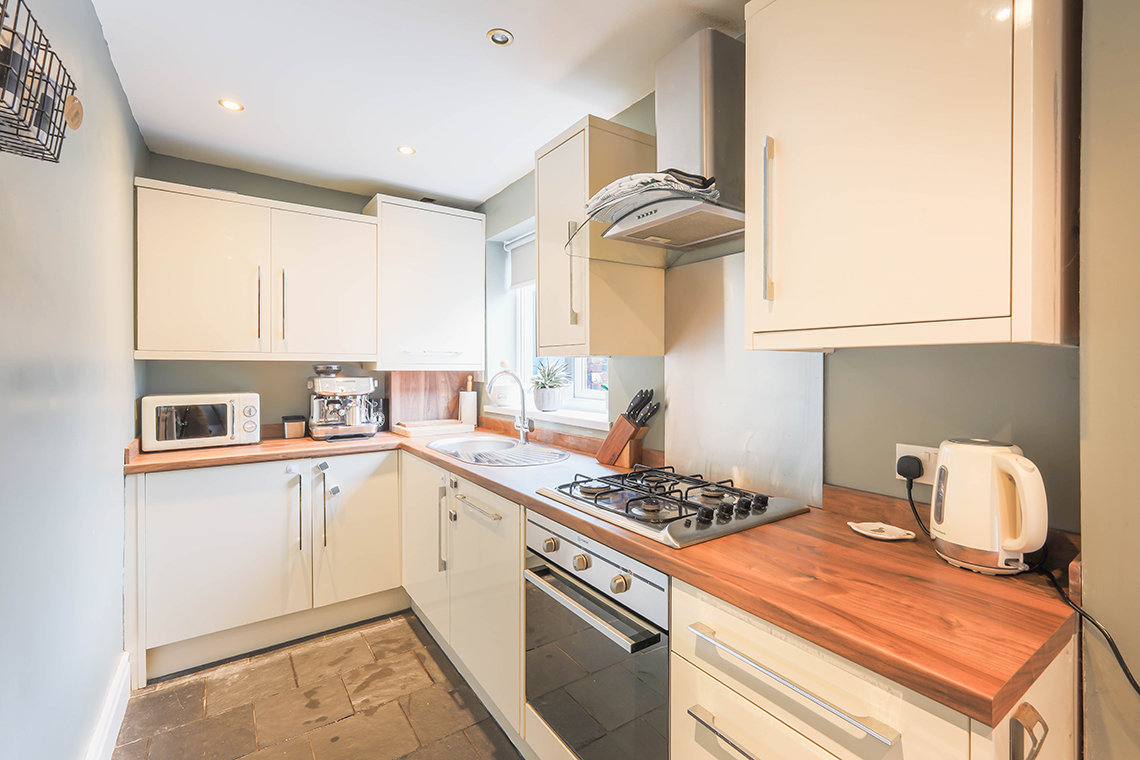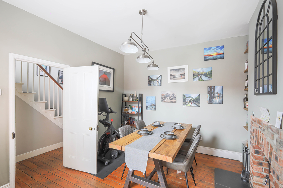 The internal accommodation comprises; Entrance hall with staircase leading to the first floor | Generous front living room with feature log burning stove and alcove shelving | Rear dining room, with lovely brick fire surround, log burning stove and alcove shelving | Galley style kitchen with modern cabinetry and worktops, integrated appliances and French doors leading to the rear courtyard.
