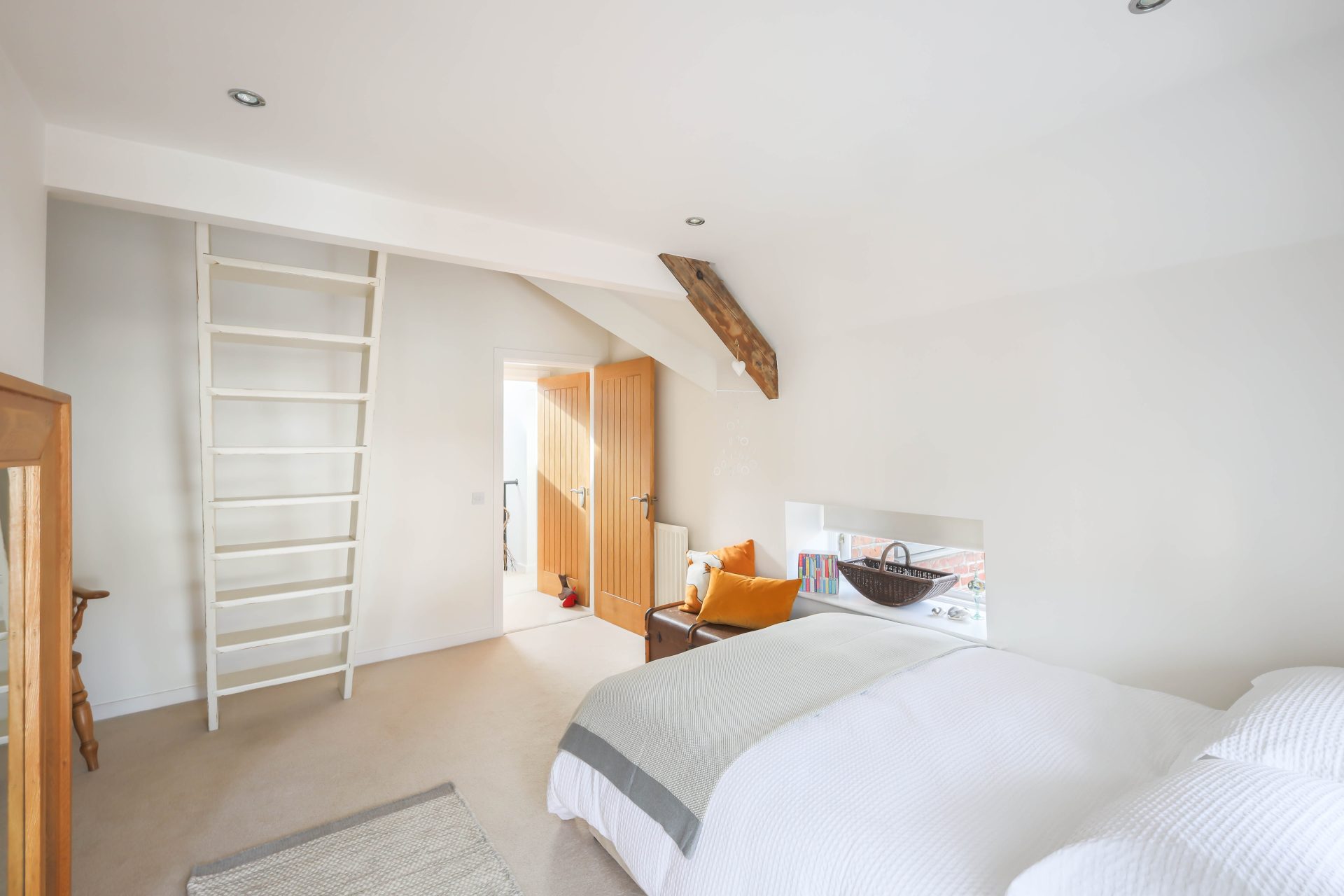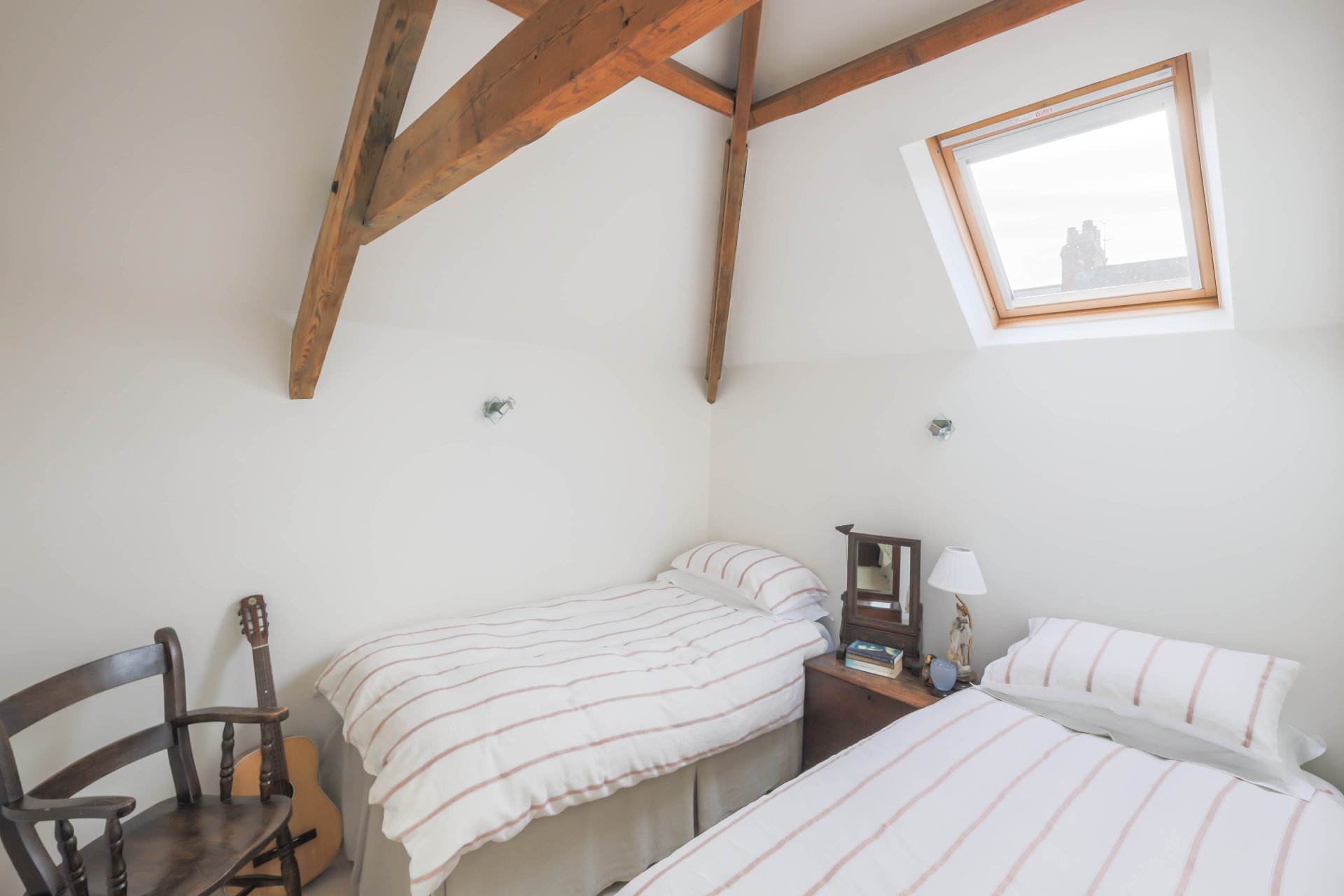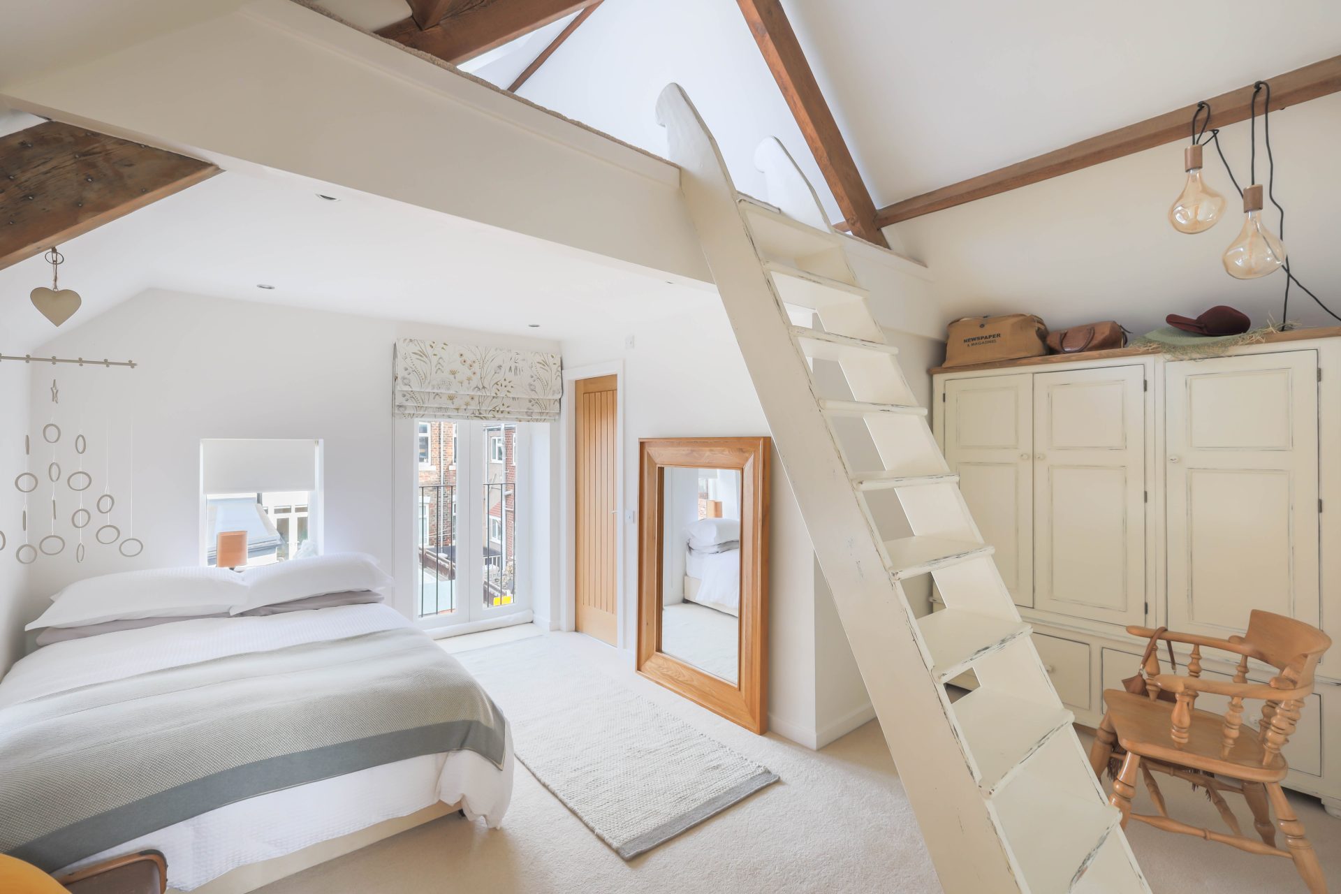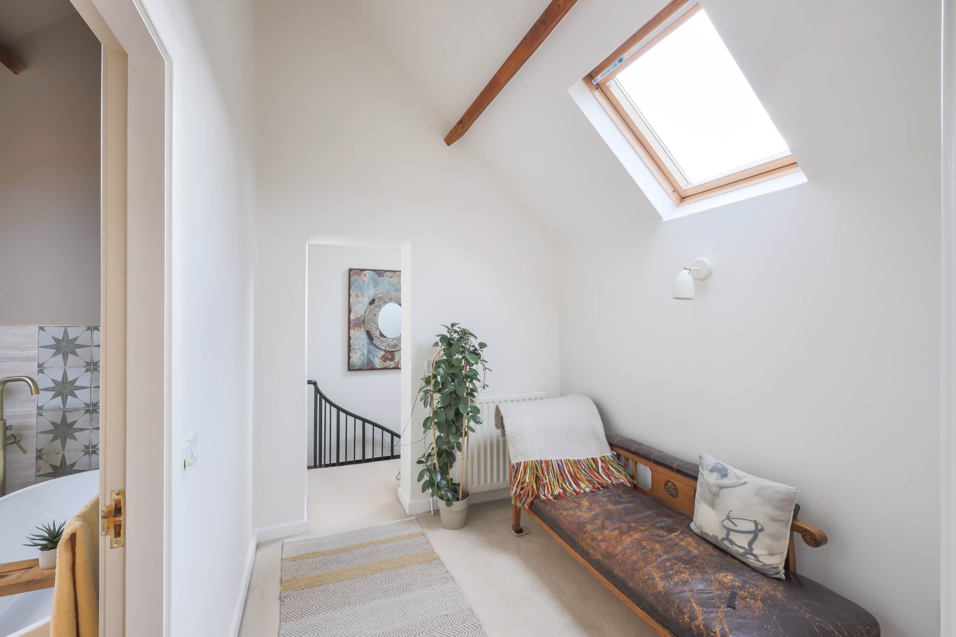 First floor – Good size first floor landing, ideal as a study area, with natural light from the Velux window to the stairs and the landing | Bedroom one is a large loft bedroom with a full height vaulted ceiling with exposed beams, two Velux windows to the roof and two smaller windows | The family bathroom has been newly refurbished with a freestanding double ended bath with WC, bath/shower mixer tap, wash hand basin and vanity cabinets – the bathroom has a Velux window to the roof, window to the front, lovely decorative tiles, and ladder radiator | Lovely double bedroom two with French doors to a Juliet balcony overlooking the rear lane, ladders leading up to a mezzanine sleeping area | Ensuite shower room with a walk in rainfall head shower, WC, small wash hand basin and ladder radiator | Bedroom three is a double bedroom, currently housing twin beds, with a Velux window to the roof and exposed beams.