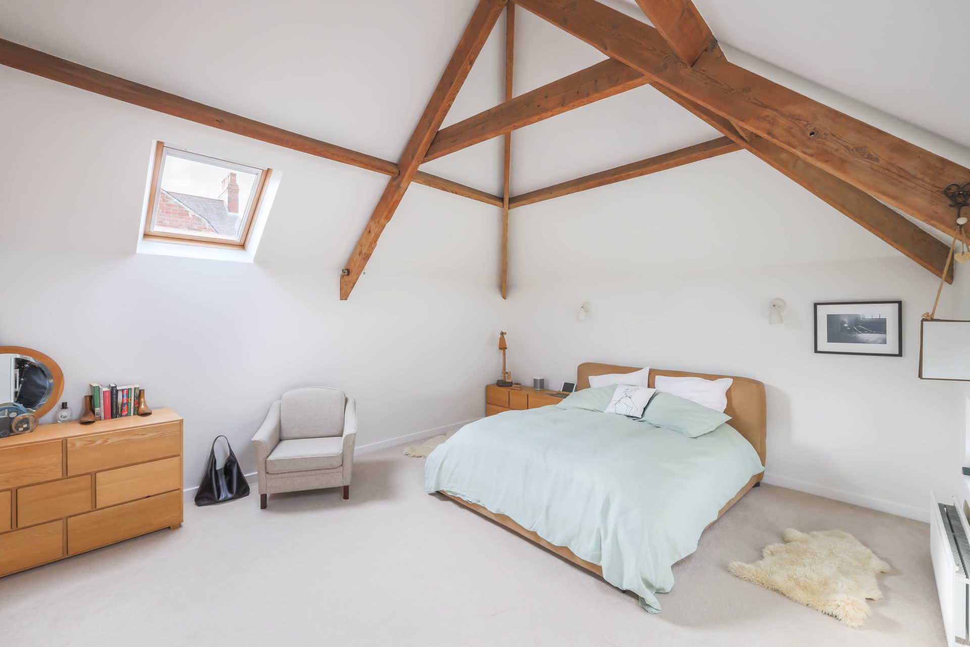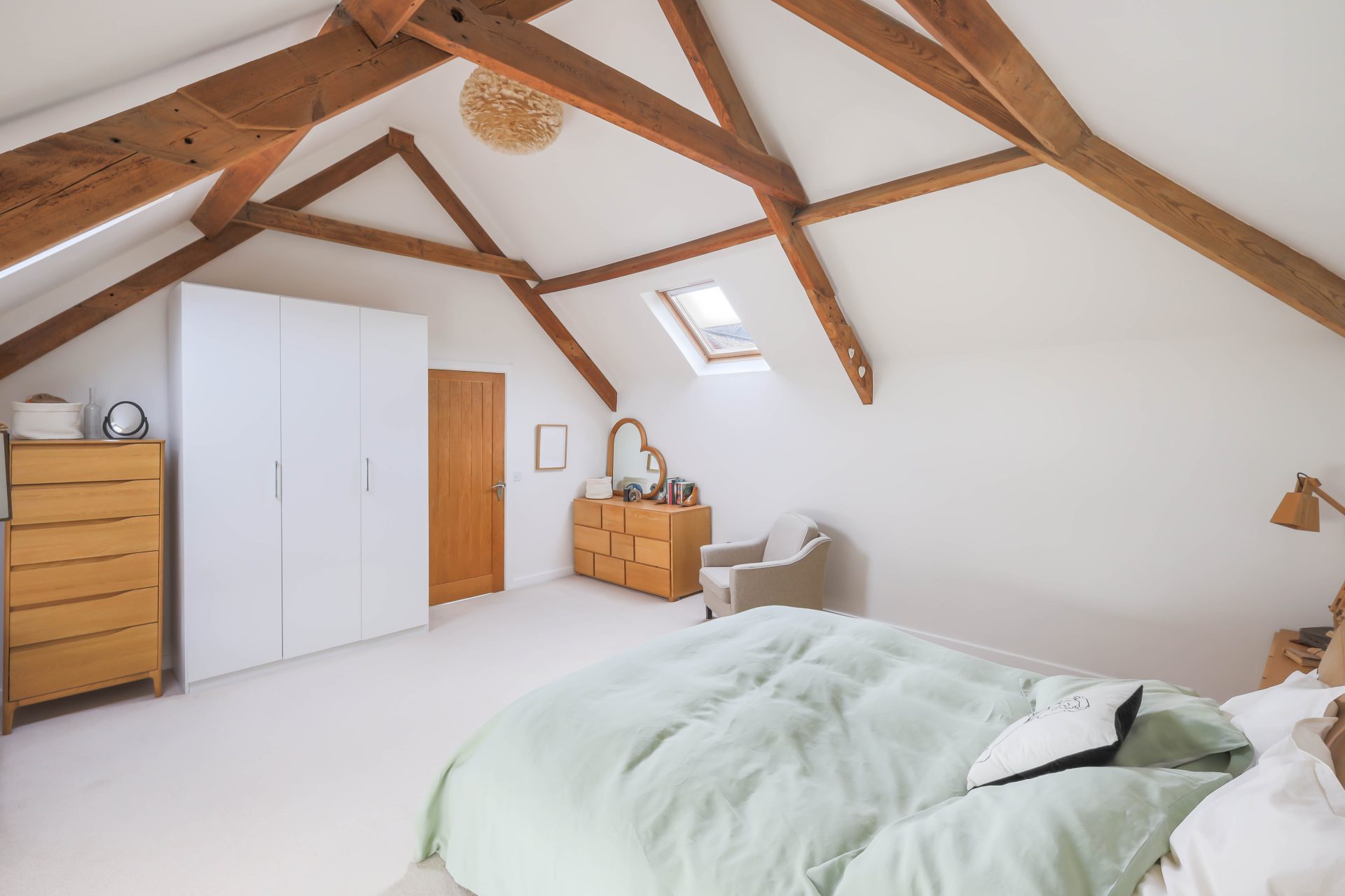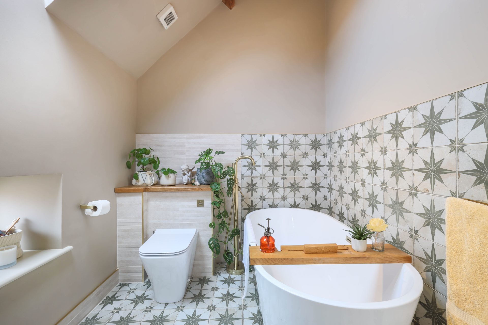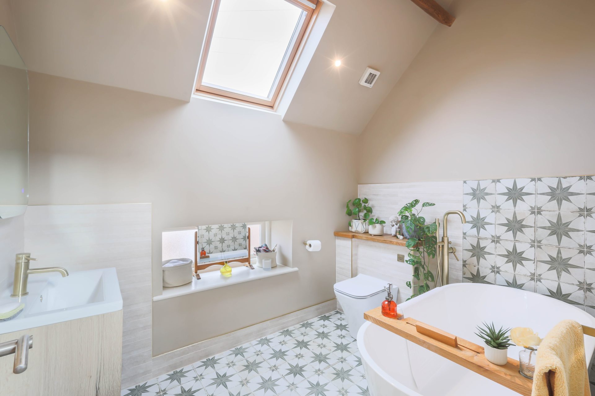 First floor – Good size first floor landing, ideal as a study area, with natural light from the Velux window to the stairs and the landing | Bedroom one is a large loft bedroom with a full height vaulted ceiling with exposed beams, two Velux windows to the roof and two smaller windows | The family bathroom has been newly refurbished with a freestanding double ended bath with WC, bath/shower mixer tap, wash hand basin and vanity cabinets – the bathroom has a Velux window to the roof, window to the front, lovely decorative tiles, and ladder radiator | Lovely double bedroom two with French doors to a Juliet balcony overlooking the rear lane, ladders leading up to a mezzanine sleeping area | Ensuite shower room with a walk in rainfall head shower, WC, small wash hand basin and ladder radiator | Bedroom three is a double bedroom, currently housing twin beds, with a Velux window to the roof and exposed beams.