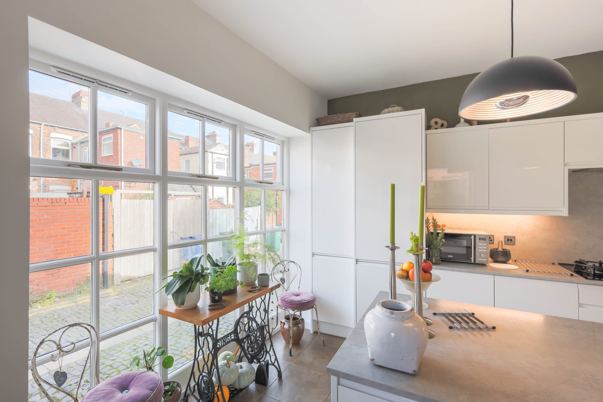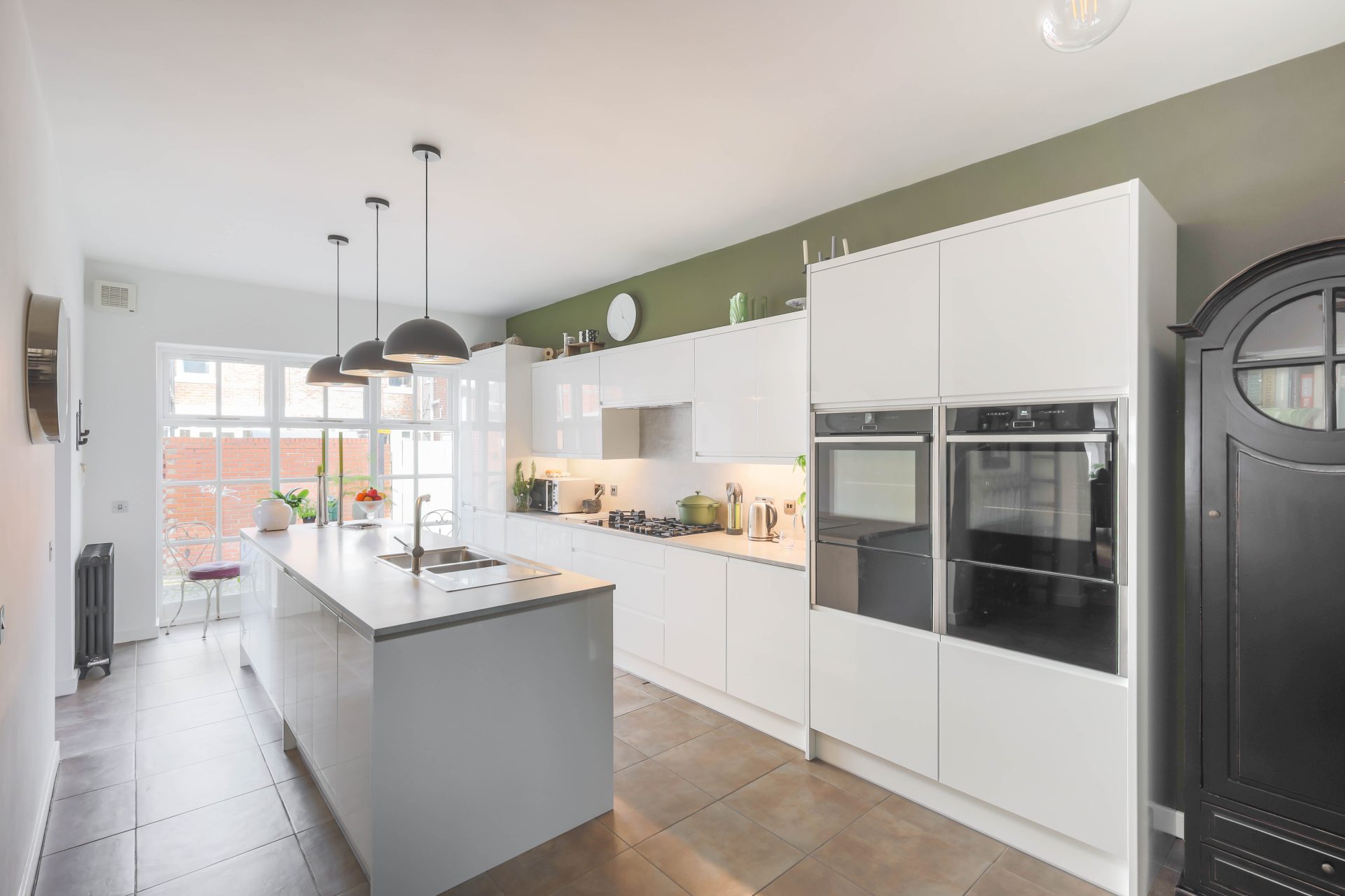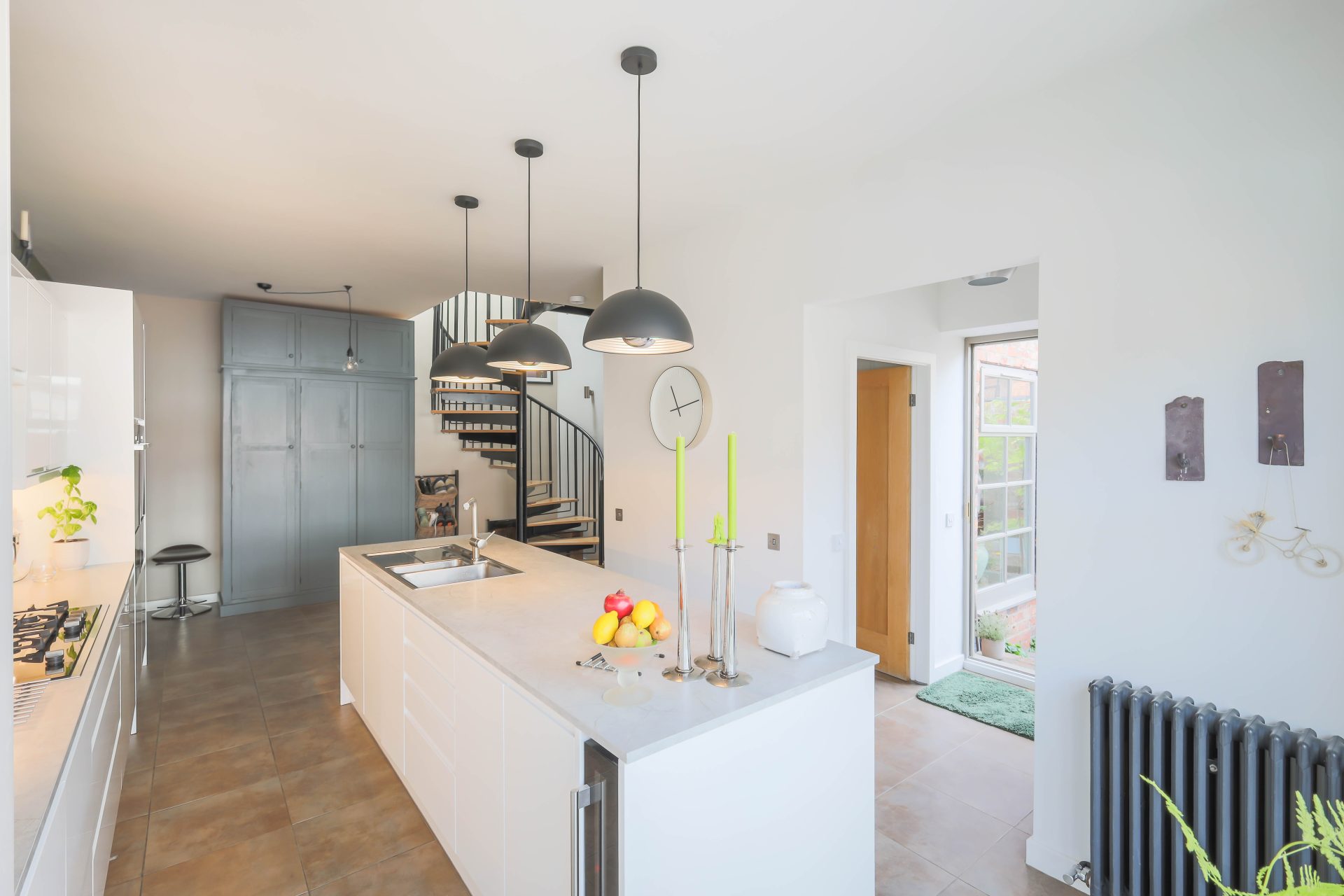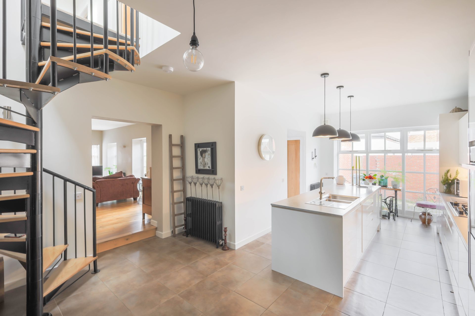 Ground floor – Entrance vestibule with a large laundry cupboard with plumbing for a washing machine, space for dryer/small chest freezer/additional fridge, and cabinets to the wall | Ground floor WC and wash hand basin | Superb open plan kitchen/breakfast room with a contemporary kitchen fitted (2021) with a range of high gloss cabinets, with a long feature central island incorporating a five ring gas hob and extractor over, integrated fridge/freezer, dishwasher, double oven, two warming drawers and slimline wine cooler – the kitchen design has a large feature picture window from the kitchen to the cobbled lane | The open tread spiral staircase leads from the kitchen breakfast room up to the first floor bedroom accommodation | A magnificent sitting room with excellent natural light from the two windows and door to the courtyard – a really good flexible living space with oak flooring and great high ceiling.