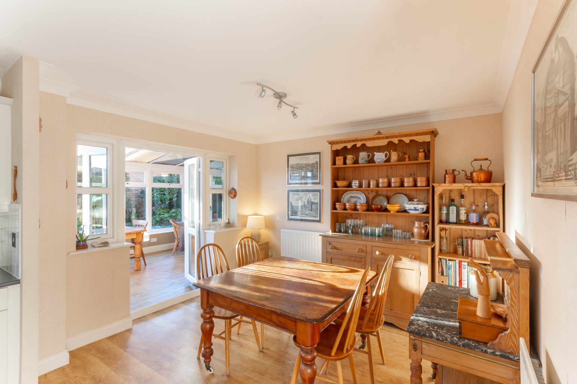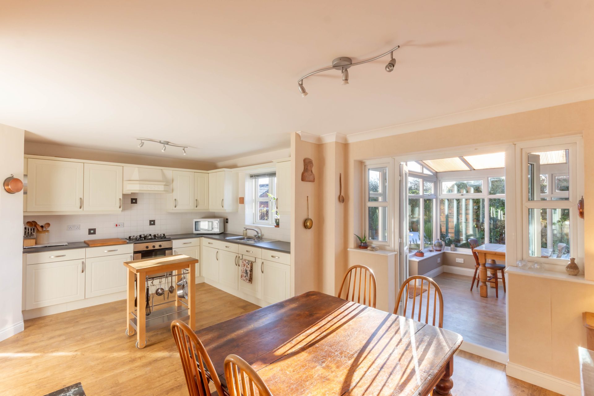 – Reception hallway with stairs to first floor | Ground floor WC | Small Study/home office to the front overlooking the Green | Generous sitting room, running from the front to the rear, with a feature fireplace, and French doors opening to the Conservatory | Fabulous open plan kitchen/dining room with French doors opening to the Conservatory | Excellent size Conservatory with a polycarbonate roof and door to the garden | Family kitchen/dining room with a range of cream cabinets, integrated appliances including induction hob and extractor, double oven, washing machine and full size Fridge and Freezer.