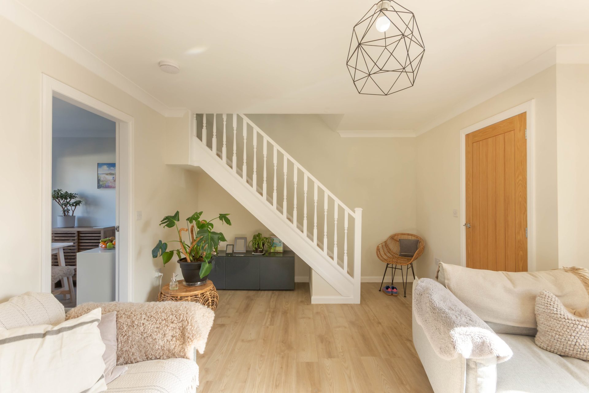 Ground floor – Vestibule | Ground floor WC | Superb open plan living room with stairs to the first floor and excellent natural light from the large window to the front | Fabulous new fitted kitchen/dining room with a door leading out to the rear garden – the kitchen is fitted with a range of cabinets, with Silestone worktops and space for a range style cooker, with extractor over, integrated dishwasher and space for a freestanding fridge/freezer.
