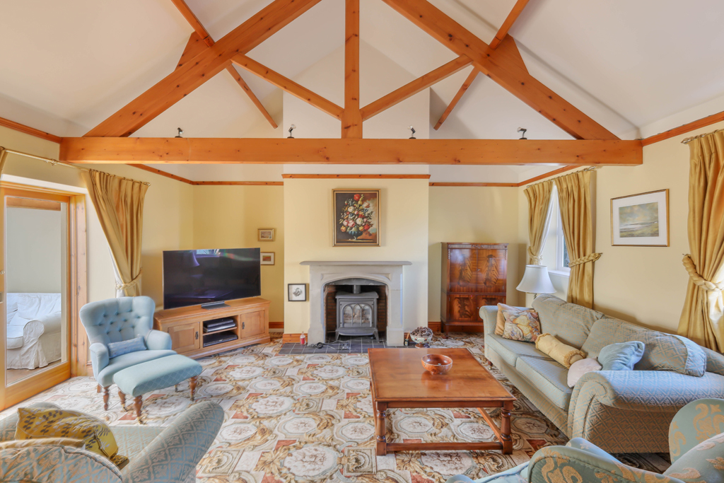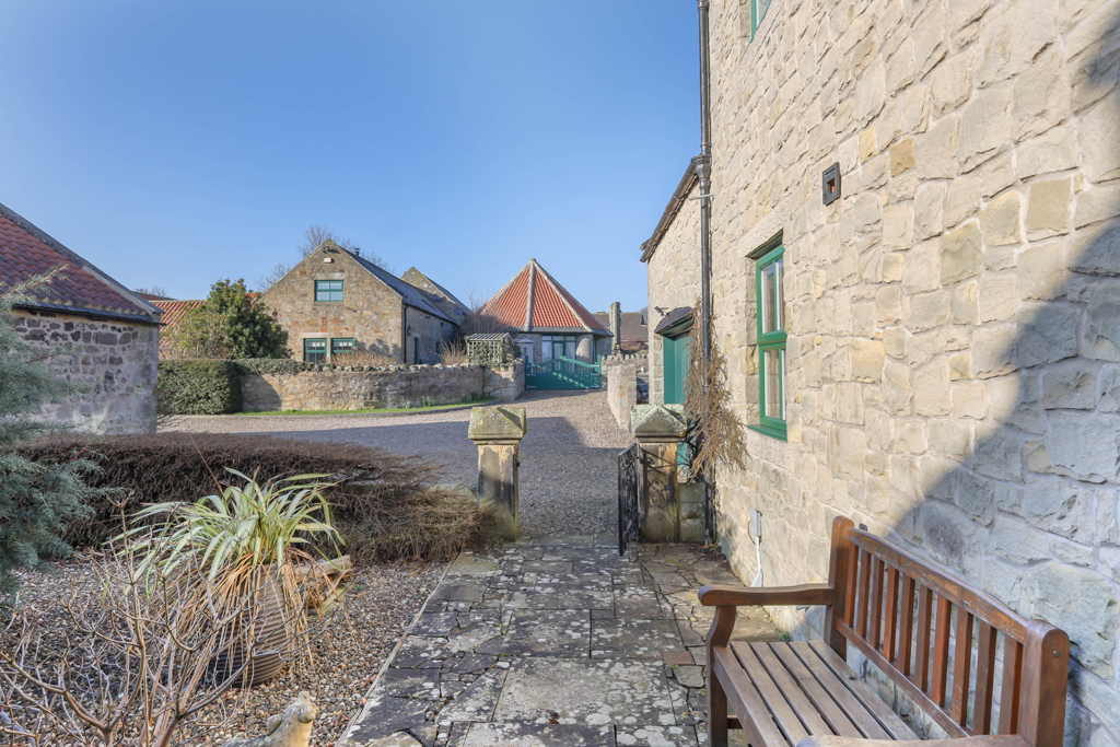 Externally – Friary House is approached via a private shared gravel driveway, leading into Friary Farm, with driveway parking to the front of the house and to the double garage | Integral double garage with a sliding timber door, power and lighting | Lovely mature garden, running the south and east of the house, with extensive lawns, paved and gravel beds, mature planted borders and a small burn and footbridge to the southern boundary | Small enclosed paddock to the eastern boundary | L-shaped Stable block with three loose boxes | 3 acre field beyond the burn to the south.