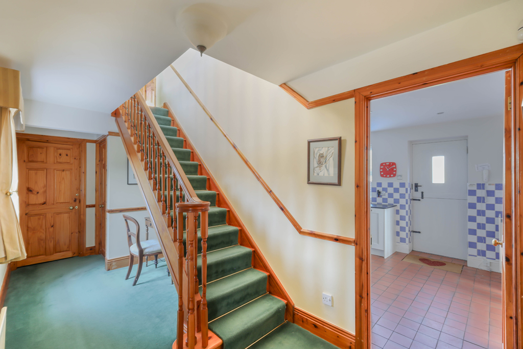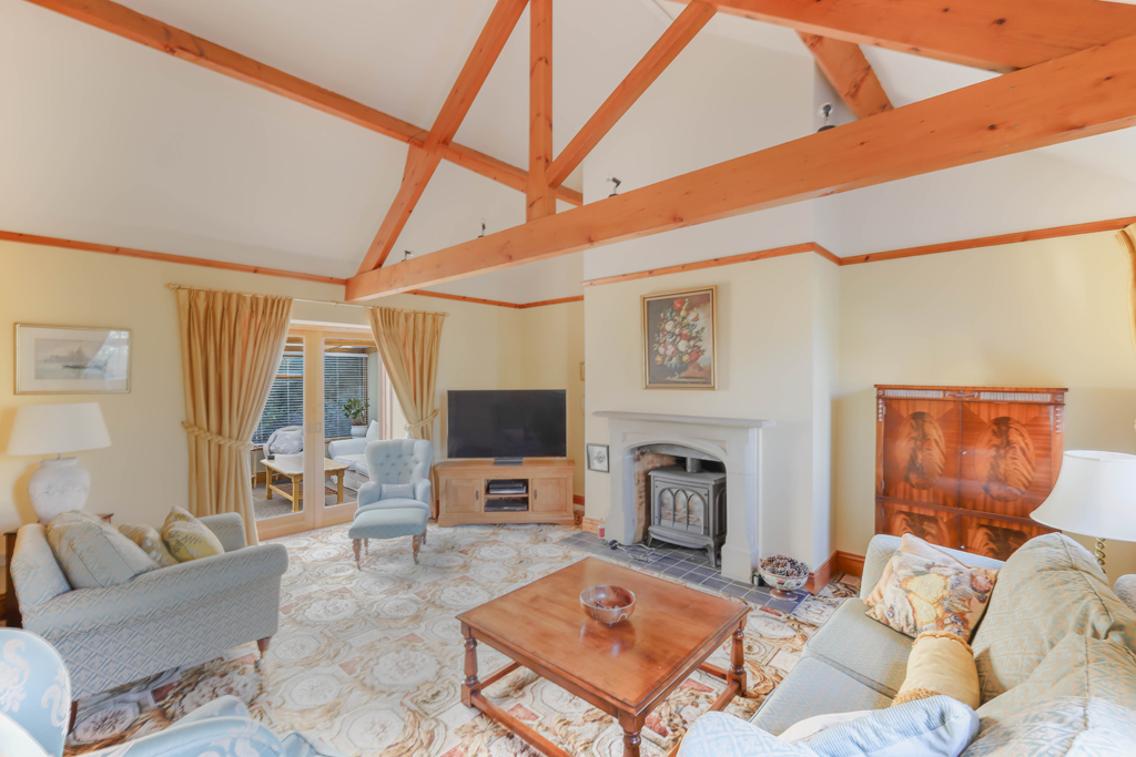 Ground floor – Vestibule with glazed French doors to the hallway | Hallway with a staircase to the first floor, and small under stair study area | Ground floor WC | Double doors open to the sitting room – an impressive main reception room with full height vaulted and beamed ceiling, stone fireplace with a gas fire ( bottled gas), built in storage cupboard and sliding doors opening to the Conservatory | Lovely Conservatory with double glazed timber windows and doors overlooking the garden, and a stone flagged floor | Versatile second reception, used as a formal dining room, with windows overlooking the garden | Superb open plan kitchen and breakfast room with views over the gardens to the fields and a barn style door opening to the garden – the well appointed kitchen, newly fitted around 2-3 years ago, has a range of cabinets with integrated appliances; two AEG ovens, hob, dishwasher and fridge/freezer | Breakfast room with dual aspect windows and built in storage | Generous utility/boot room with fitted cabinets, a large built in cloaks cupboard, plumbing for a washing machine and space for a tumble drier and fridge/freezer – doors lead to the double garage and small study | Study with a window to the front.