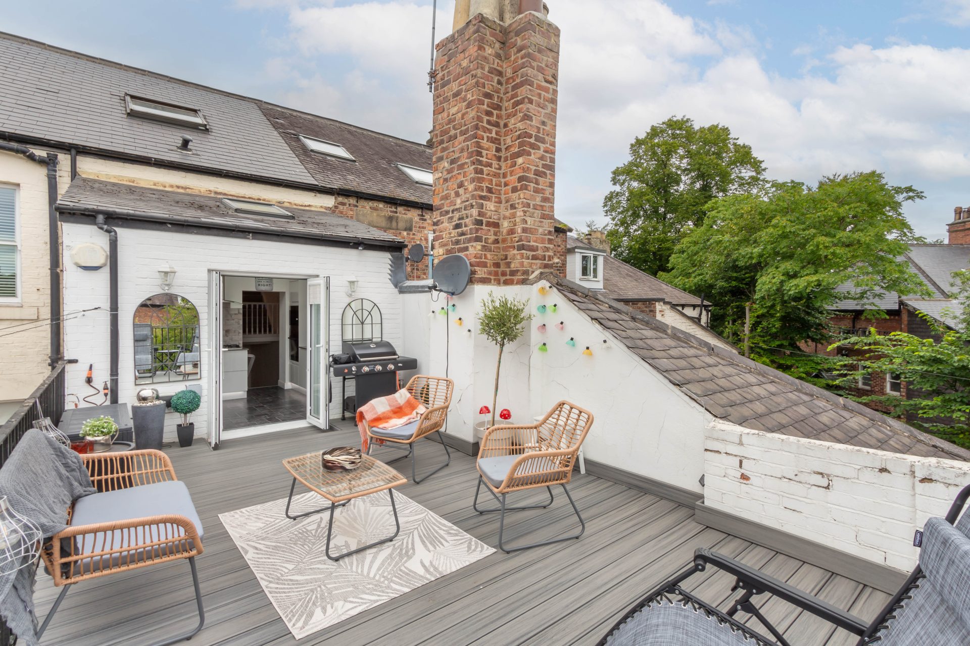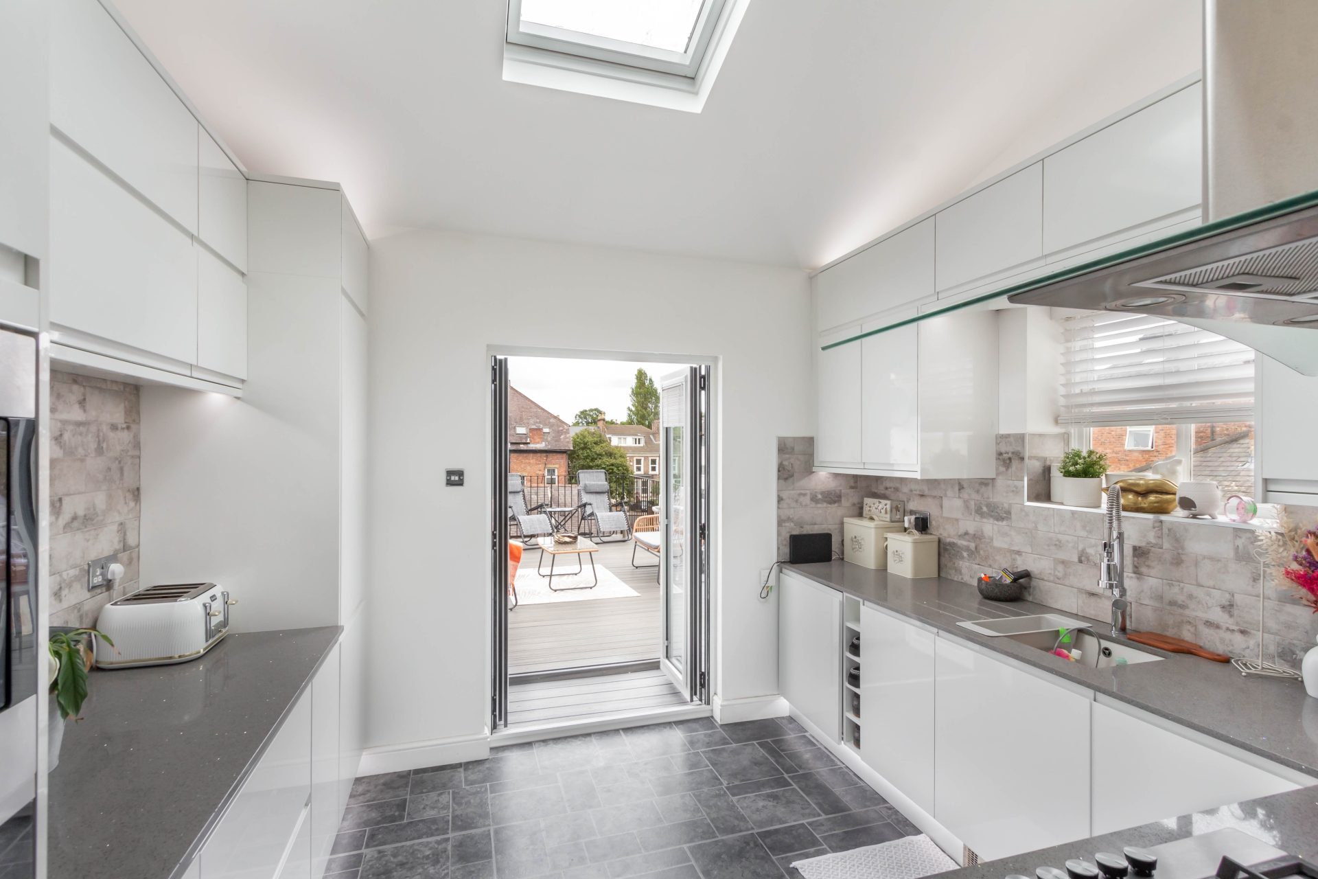 Externally, this stunning apartment offers a private decked roof terrace measuring over 21ft in length and is ideal for outdoor entertaining in the warmer months | Off street parking for one vehicle to the rear.