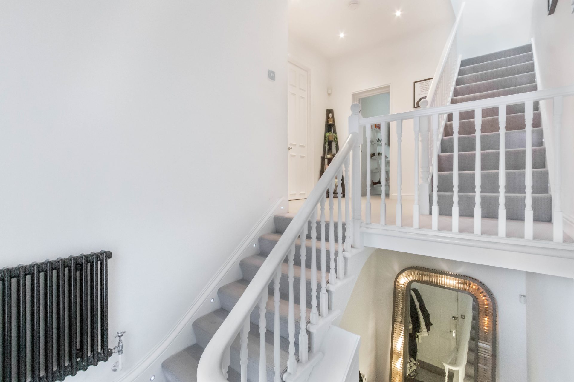 The stairs then lead up to the top floor and give access to two further bedrooms | Bedroom two is a further generous double bedroom with double Velux windows and walk in wardrobe | Bedroom one is the final double bedroom, also with Velux window and walk in wardrobe | Bedrooms one and two share access to a Jack and Jill bathroom with a modern three piece suite.