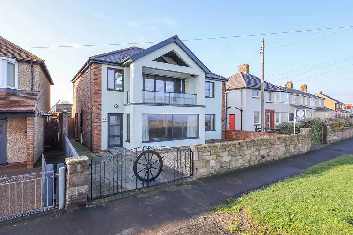 An impressive, three bedroom/three bathroom, architect designed detached house, with fantastic open aspect views to the sea and stunning coastline – the superb family home, completed around 6 years ago, has generous accommodation set over two floors with a fabulous covered balcony leading from the first floor sitting room, gated driveway parking and a south west facing, paved garden to the rear – NO UPWARD CHAIN