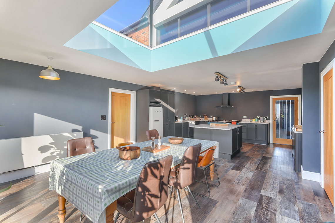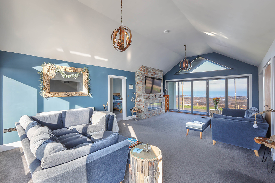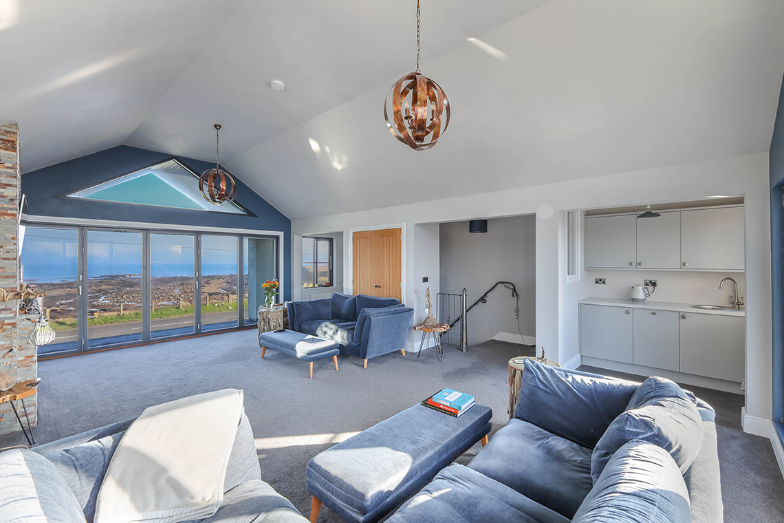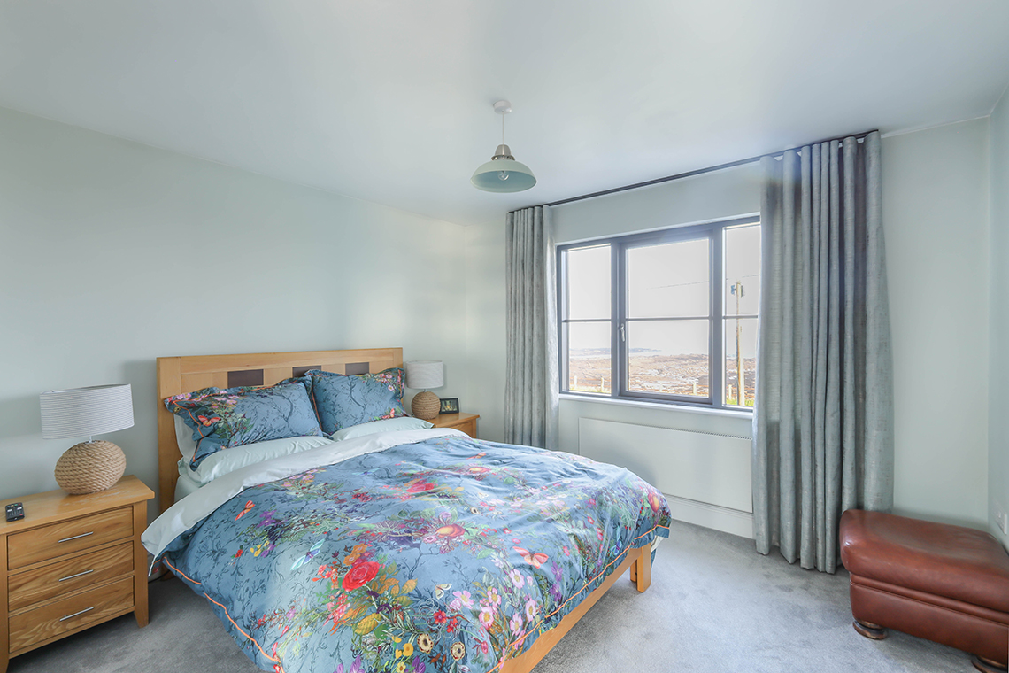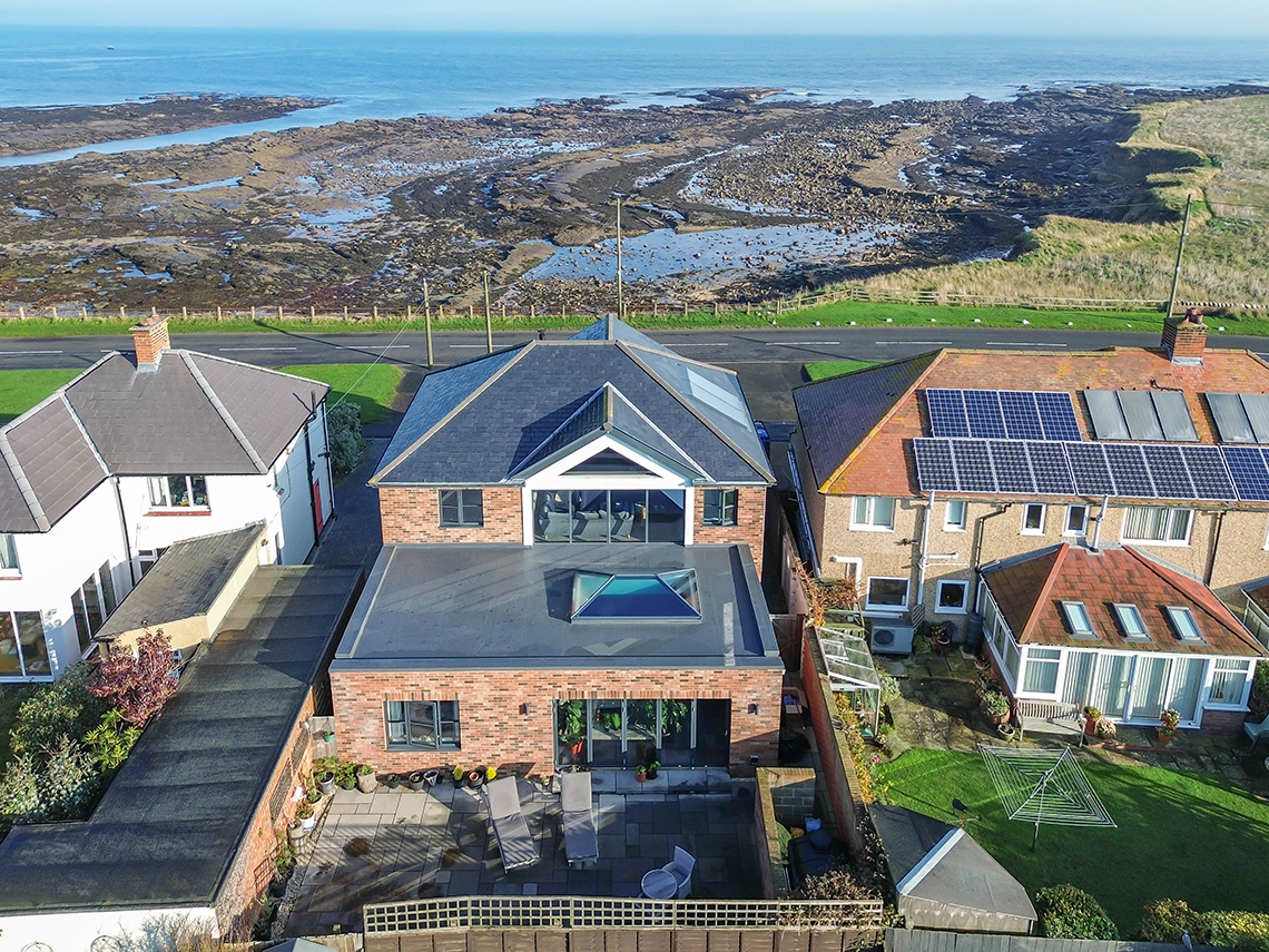 This superb individually designed house was built in 2019, with aluminium triple glazed windows, oil central heating and has a large roof lantern set within the kitchen/diner. The first floor covered balcony area was completed in 2025, with a new glass enclosure.
