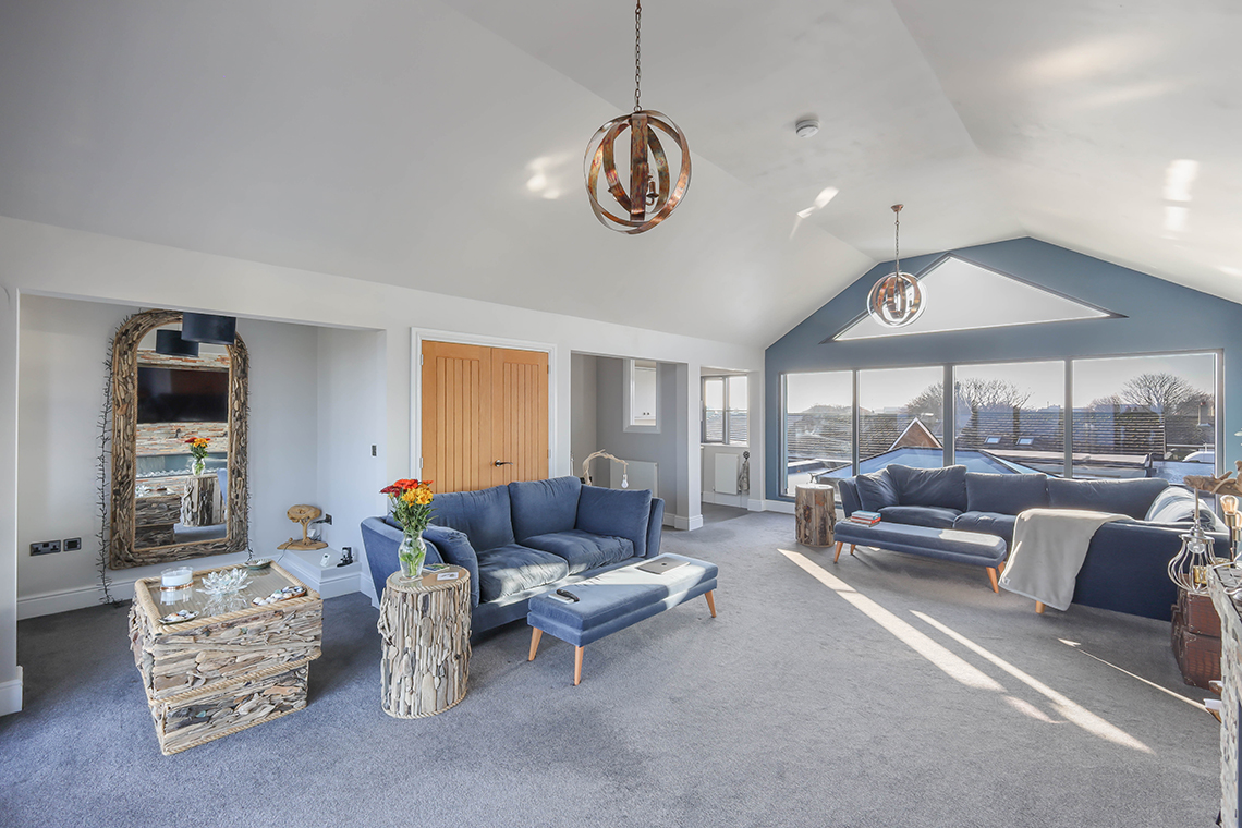 First Floor – A magnificent open plan, dual aspect vaulted ceiling sitting room, with fabulous elevated sea views and bi-fold doors to the front opening to the covered balcony and a large picture window to the rear overlooking the village | There is a versatile recess area to the front, ideal for a home office affording a sea view, and a useful second small kitchen bar area to the rear, with built in cabinets, fridge and dishwasher | The impressive master bedroom has a fitted dressing room with open hanging and shelves | Master ensuite bathroom comprising; bath, separate shower, WC and wash hand basin.