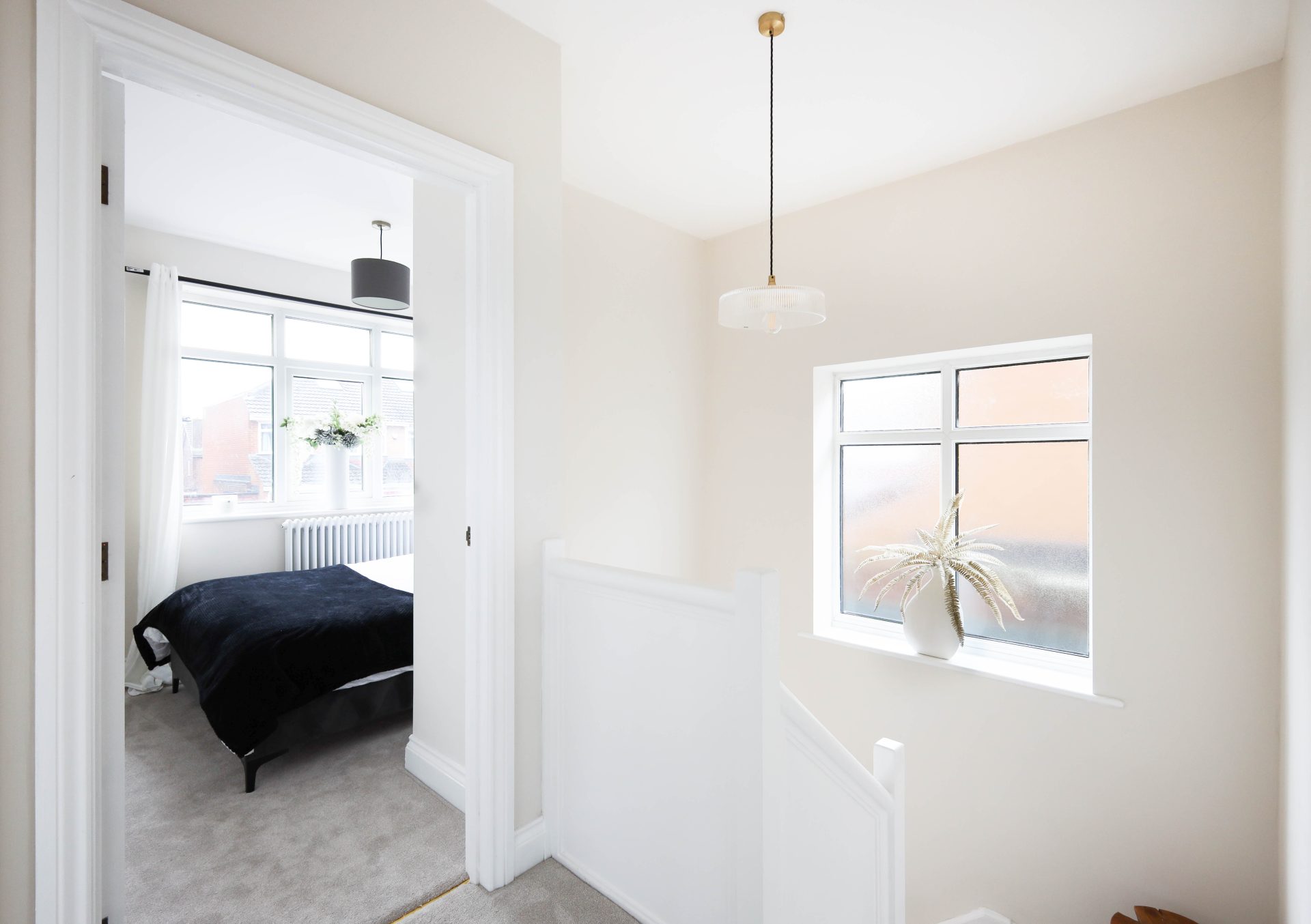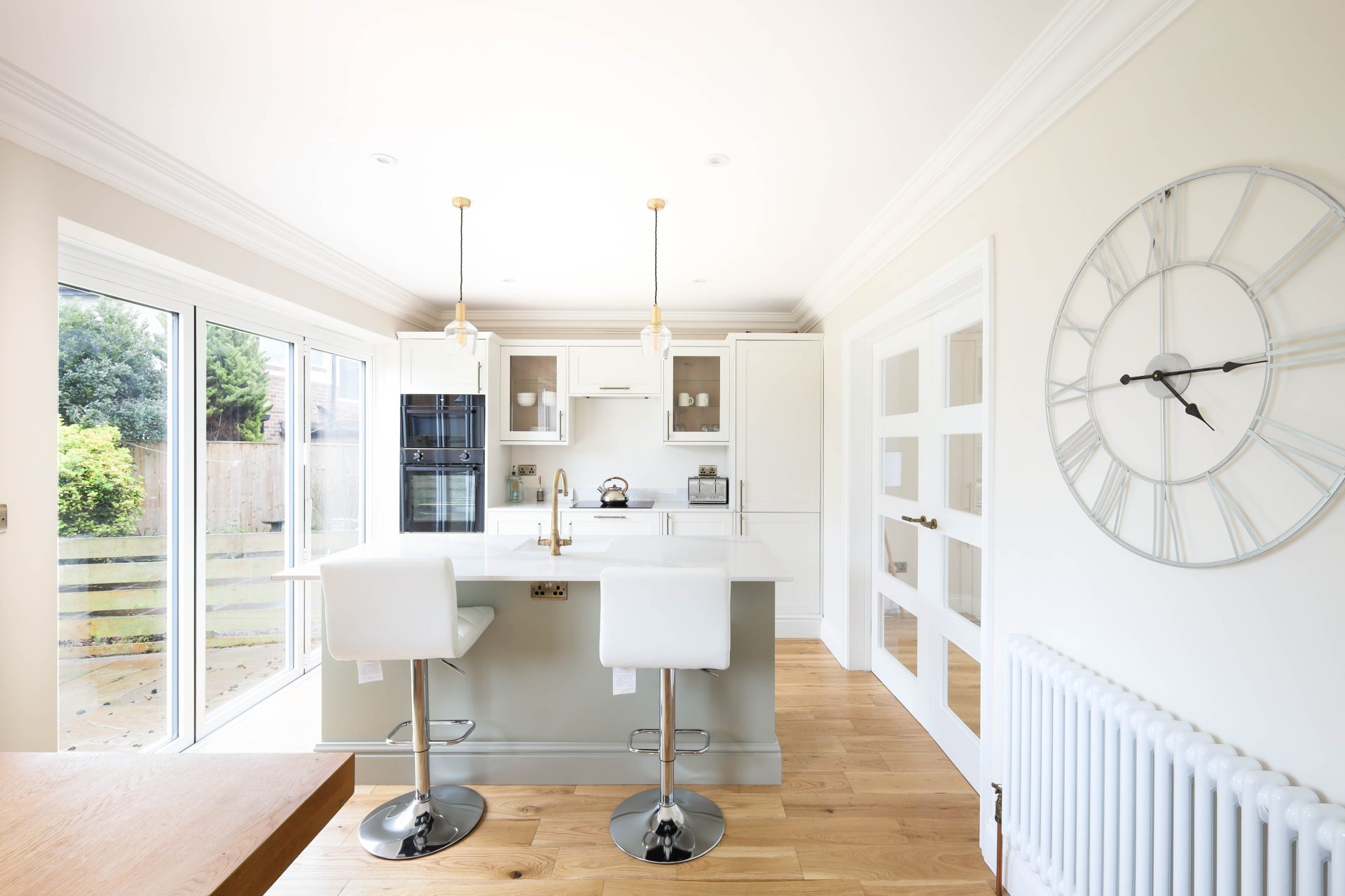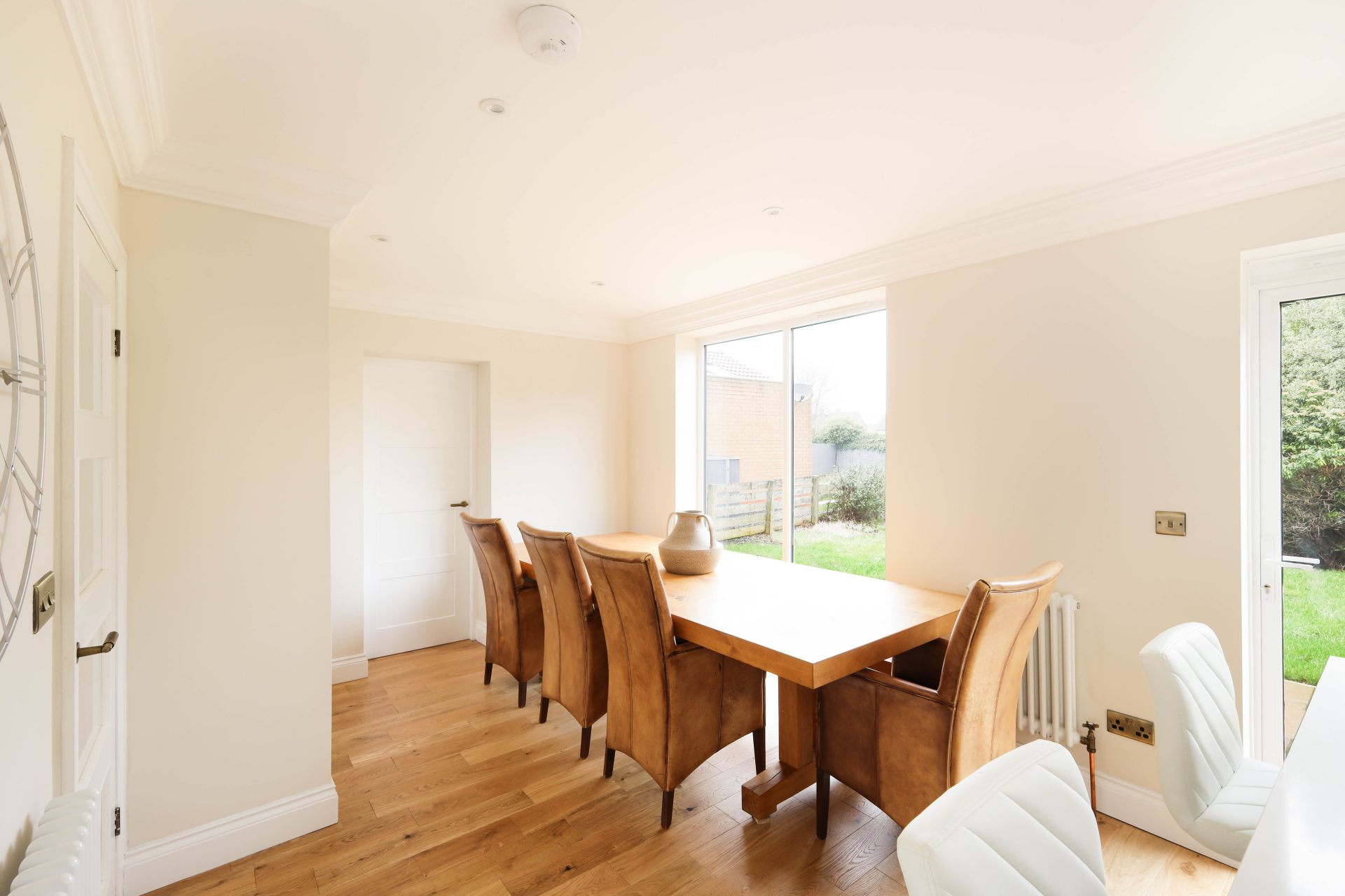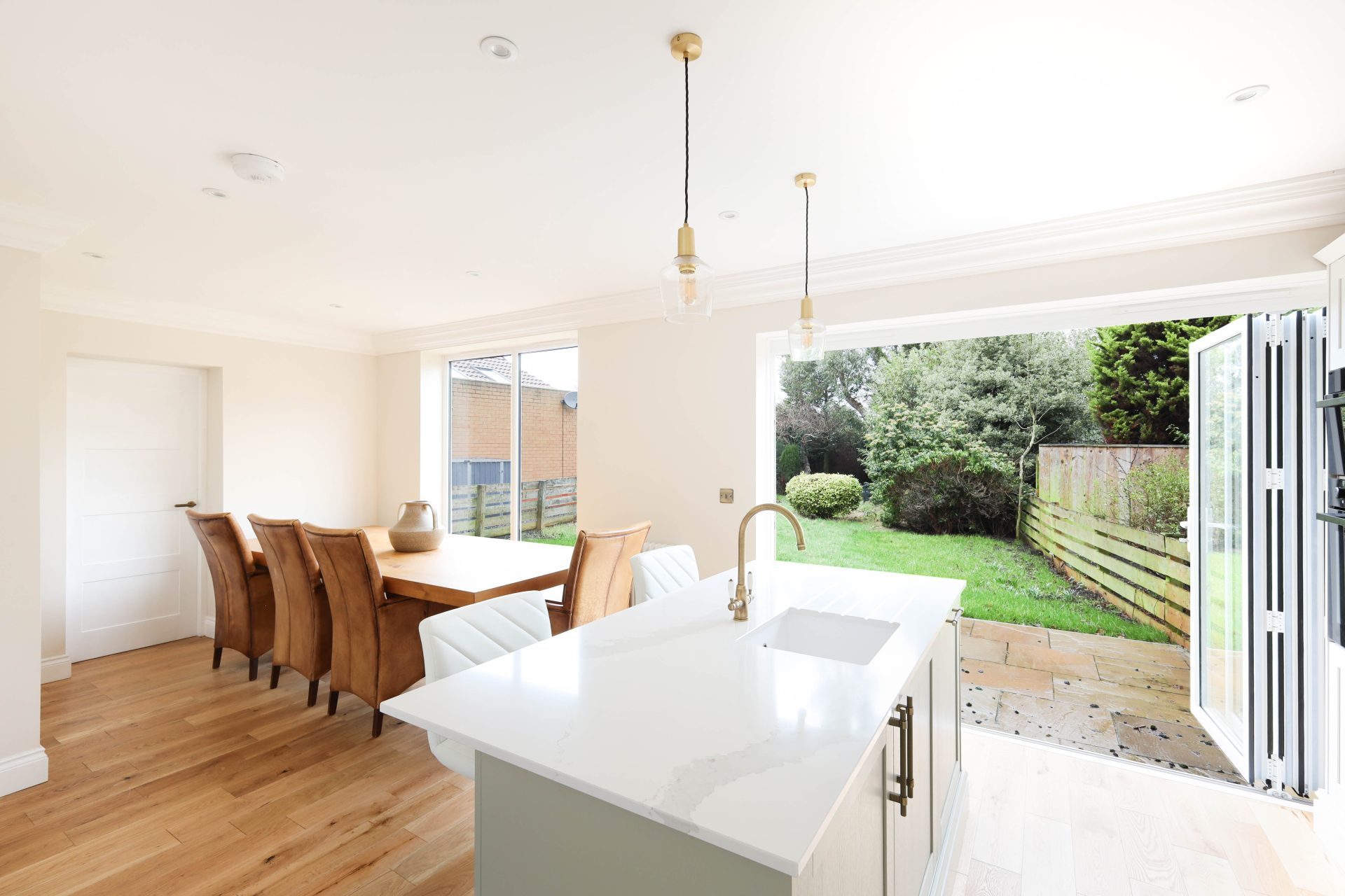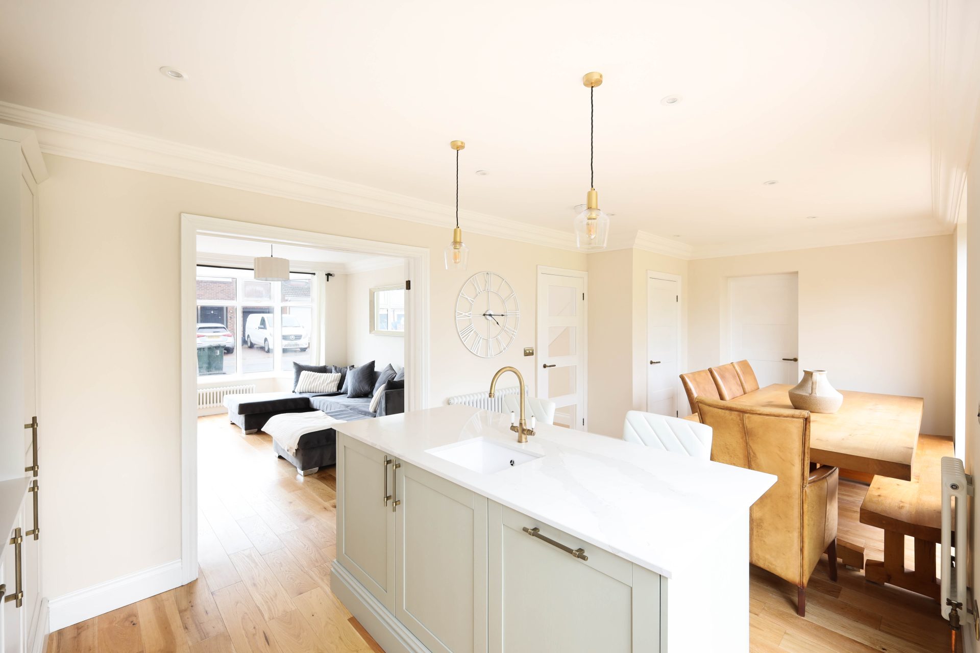 Upon entering the property, a welcoming and spacious reception hallway sets the tone for the quality found throughout the home. This leads seamlessly into the beautifully designed open-plan living, dining and kitchen space. The living room is bathed in natural light from its dual-aspect outlook and bay window, creating an inviting setting. Glass-panelled doors allow for flexible open-plan living, connecting the space effortlessly to the kitchen and dining area.
