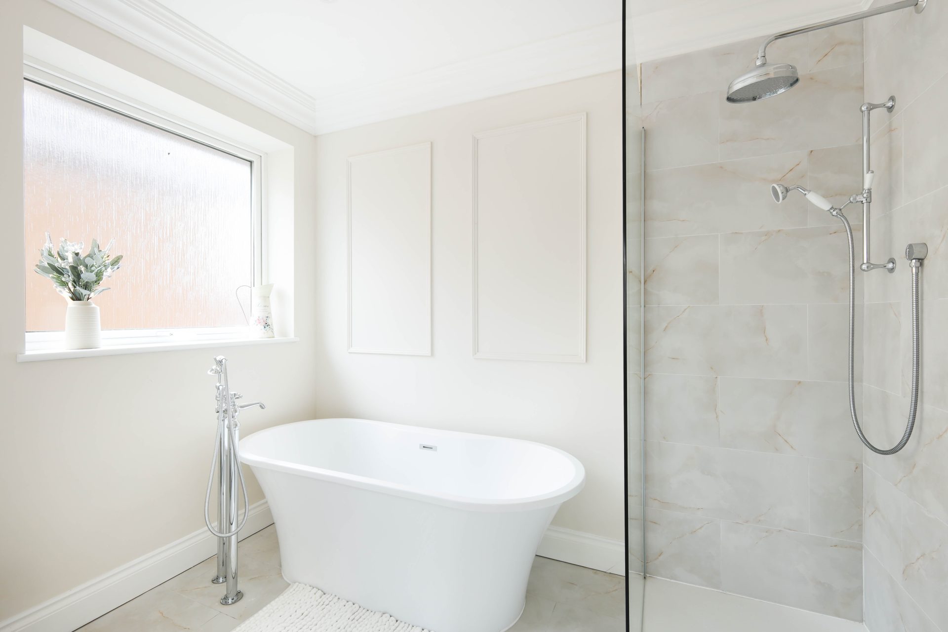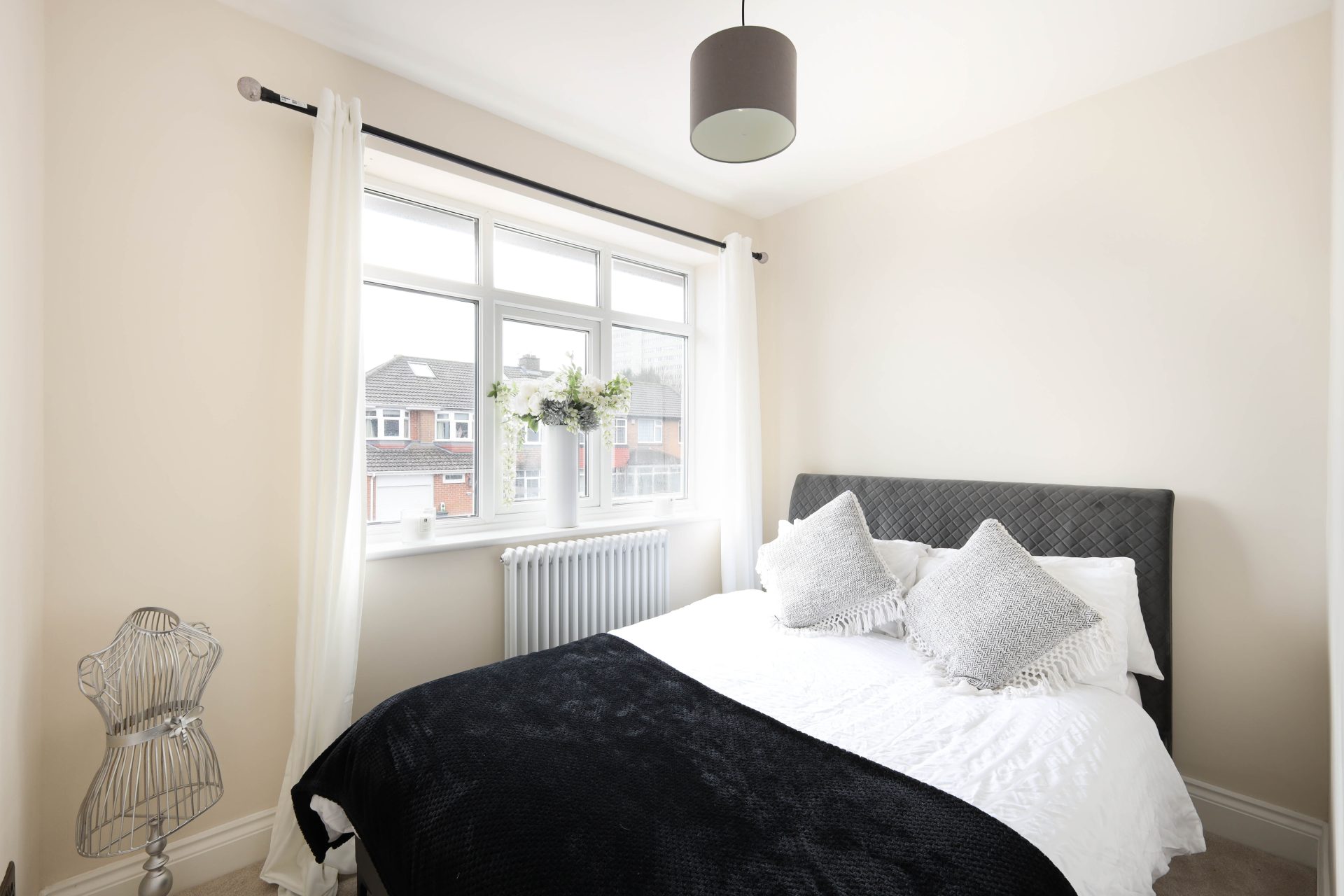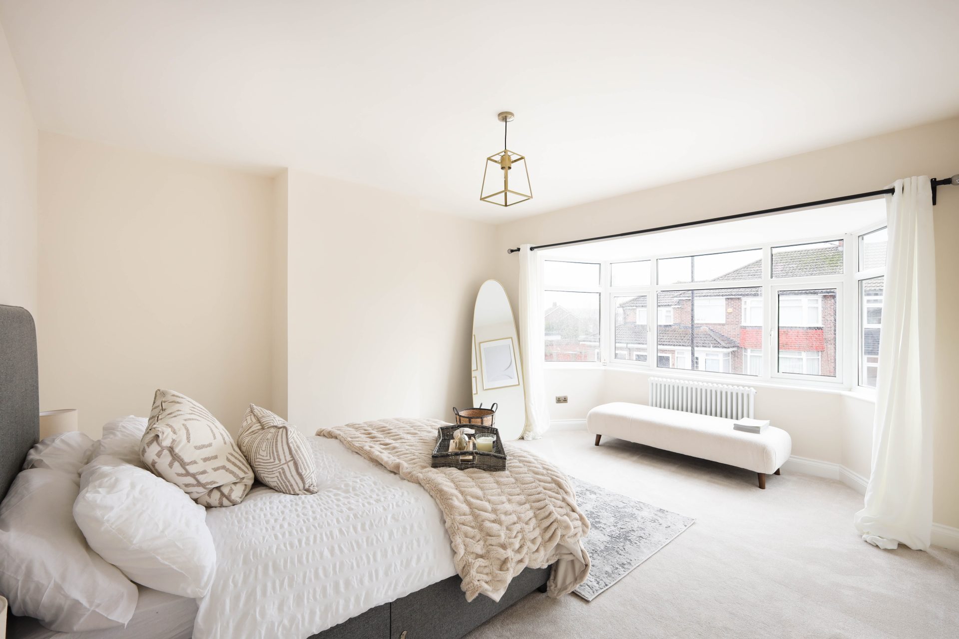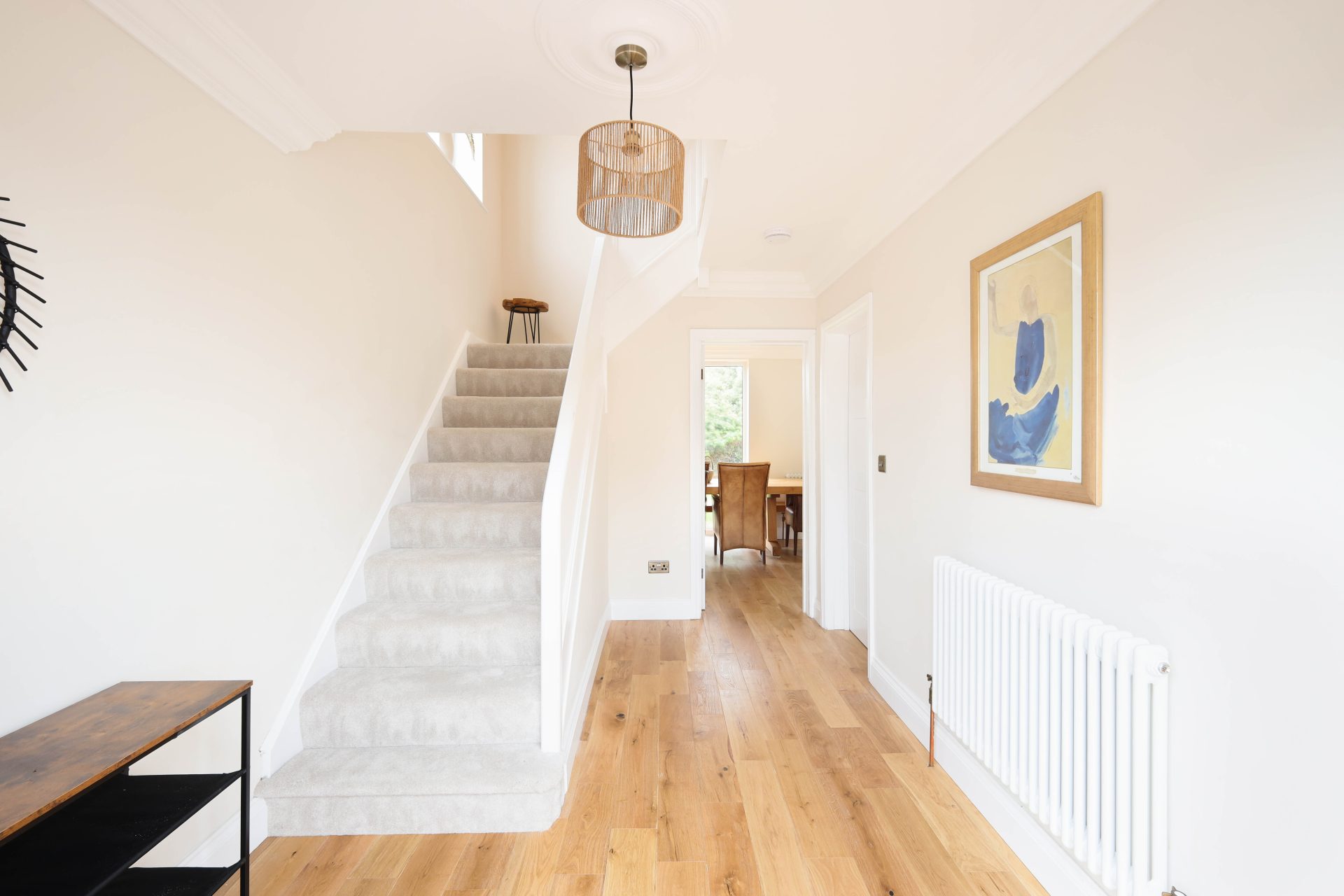 To the first floor are three large double bedrooms. The principal bedroom is positioned to the front of the property and features a charming bay window, flooding the room with natural light. A further front-facing third bedroom offers versatility as a guest room, nursery or home office. The second bedroom, overlooking the rear garden, is a spacious double room. The stylish family bathroom serves all bedrooms and is appointed with a contemporary four-piece suite, including a separate shower enclosure finished with porcelain tiling and elegant panelling, adding a refined touch.