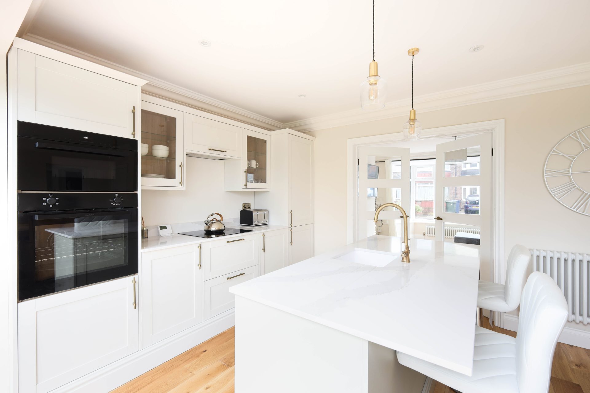 The contemporary kitchen has been thoughtfully designed and finished to a premium standard, featuring quartz worktops, sleek wall and base cabinetry, and a central island with breakfast bar seating, ideal for both everyday living and entertaining. Included are integrated appliances and newly installed bifolding doors open onto the rear garden. There is generous room for a substantial dining table or an additional snug-style seating area. A separate utility room offers practical laundry space and internal access to the garage. Additionally, there is a downstairs W/C for added convenience.