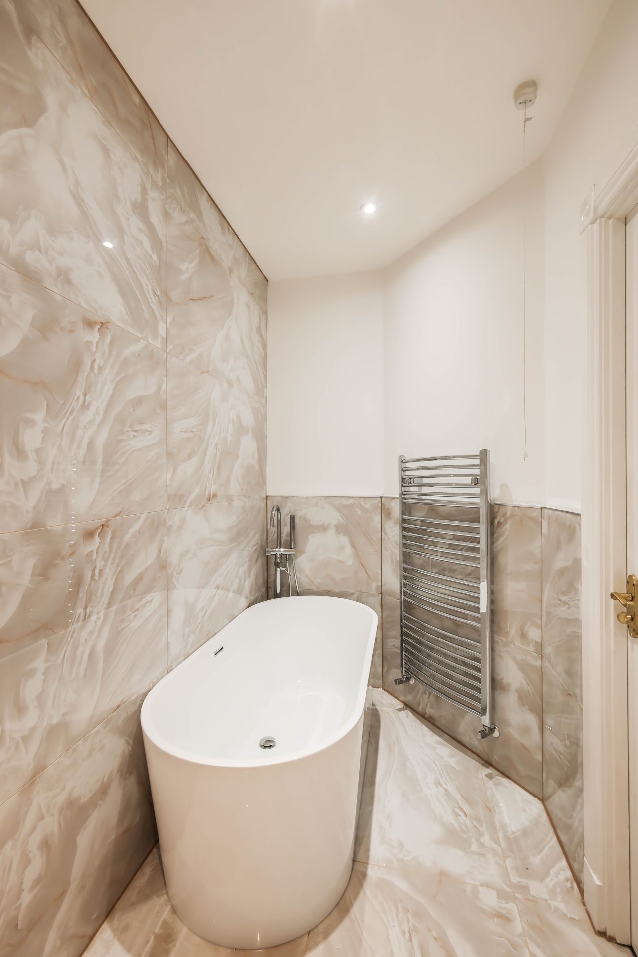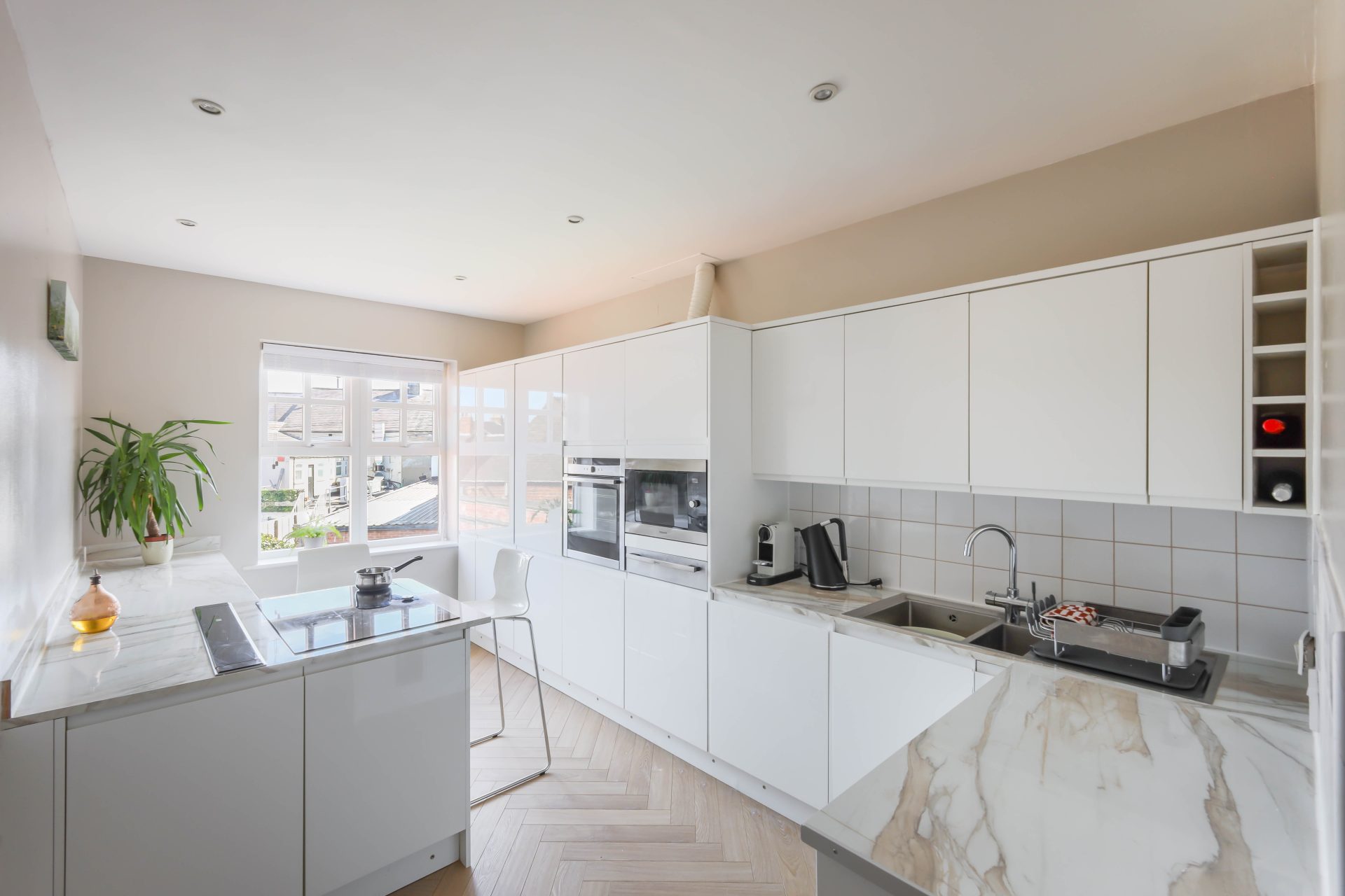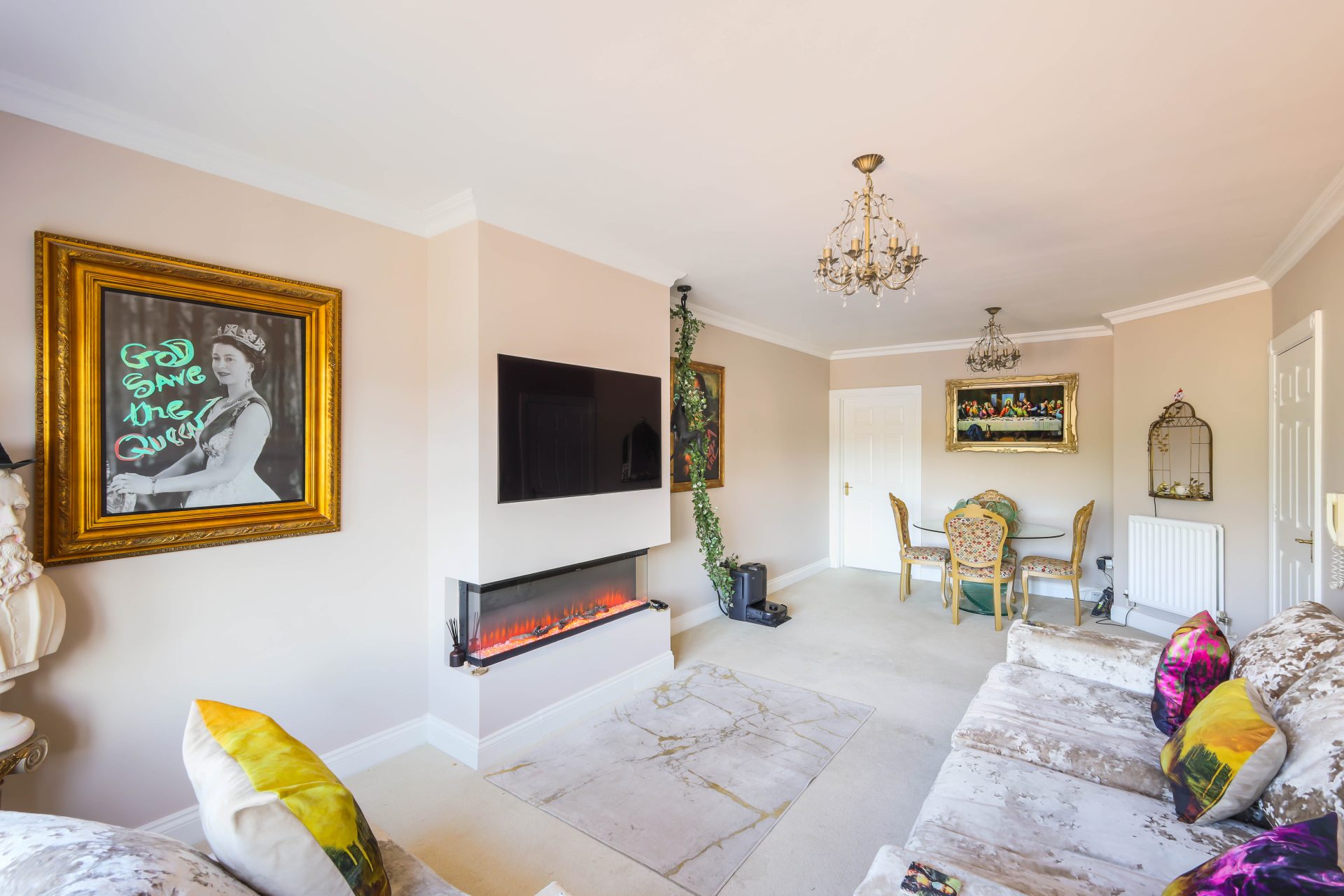 The internal accommodation comprises: Secure communal entrance with stair access to all floors | Private entrance positioned to the first floor | Reception hallway with useful store cupboard | Spacious double reception room with feature media wall, electric fireplace and westerly aspect | Beautiful refitted kitchen/breakfast room boasting contemporary cabinets and worktops, integrated appliances throughout and breakfast bar | Principal double bedroom with access onto a well appointed ensuite shower room/WC | Bedroom two is a further double room, with fitted storage | Refitted contemporary bathroom with three piece suite, including standalone tub | Pull down ladder loft space above.