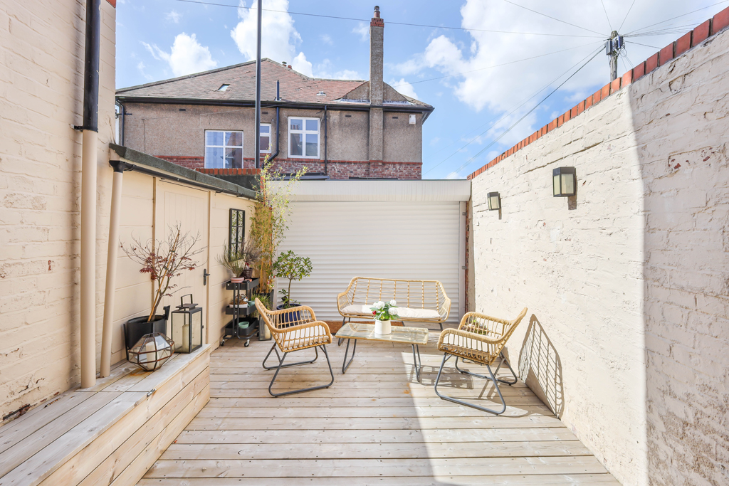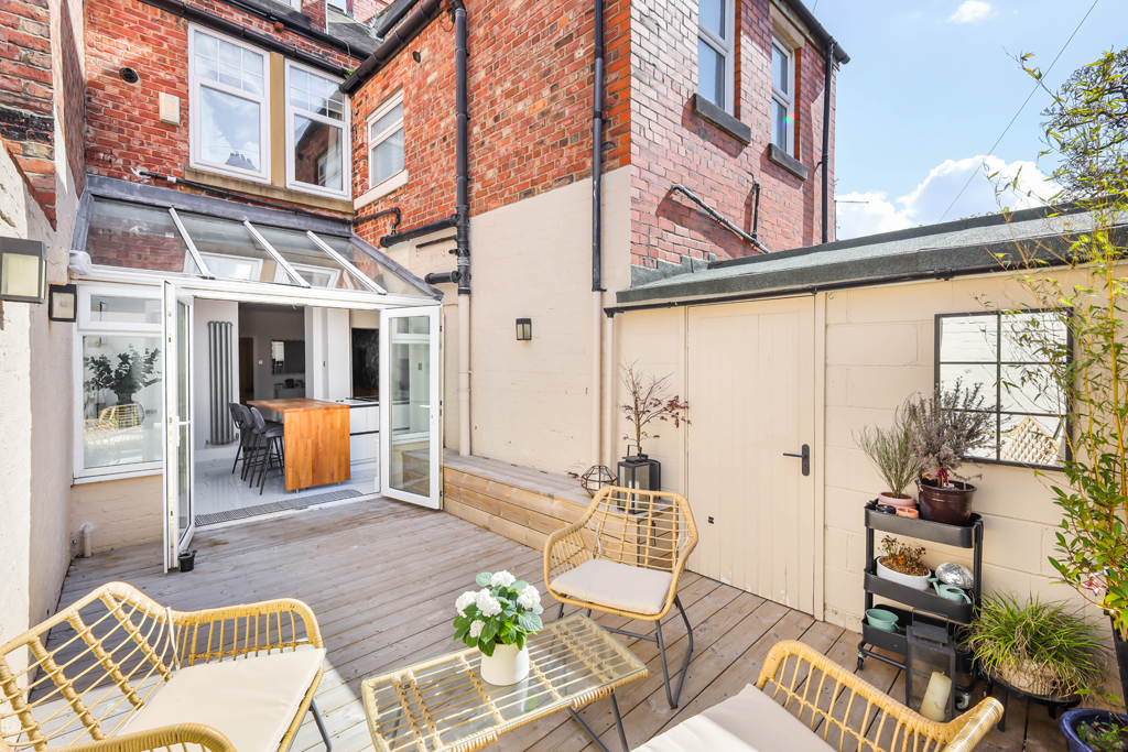 Externally, the property benefits from a front town garden | To the rear is a westerly facing decked terrace with roller door onto the service lane | Outbuilding.