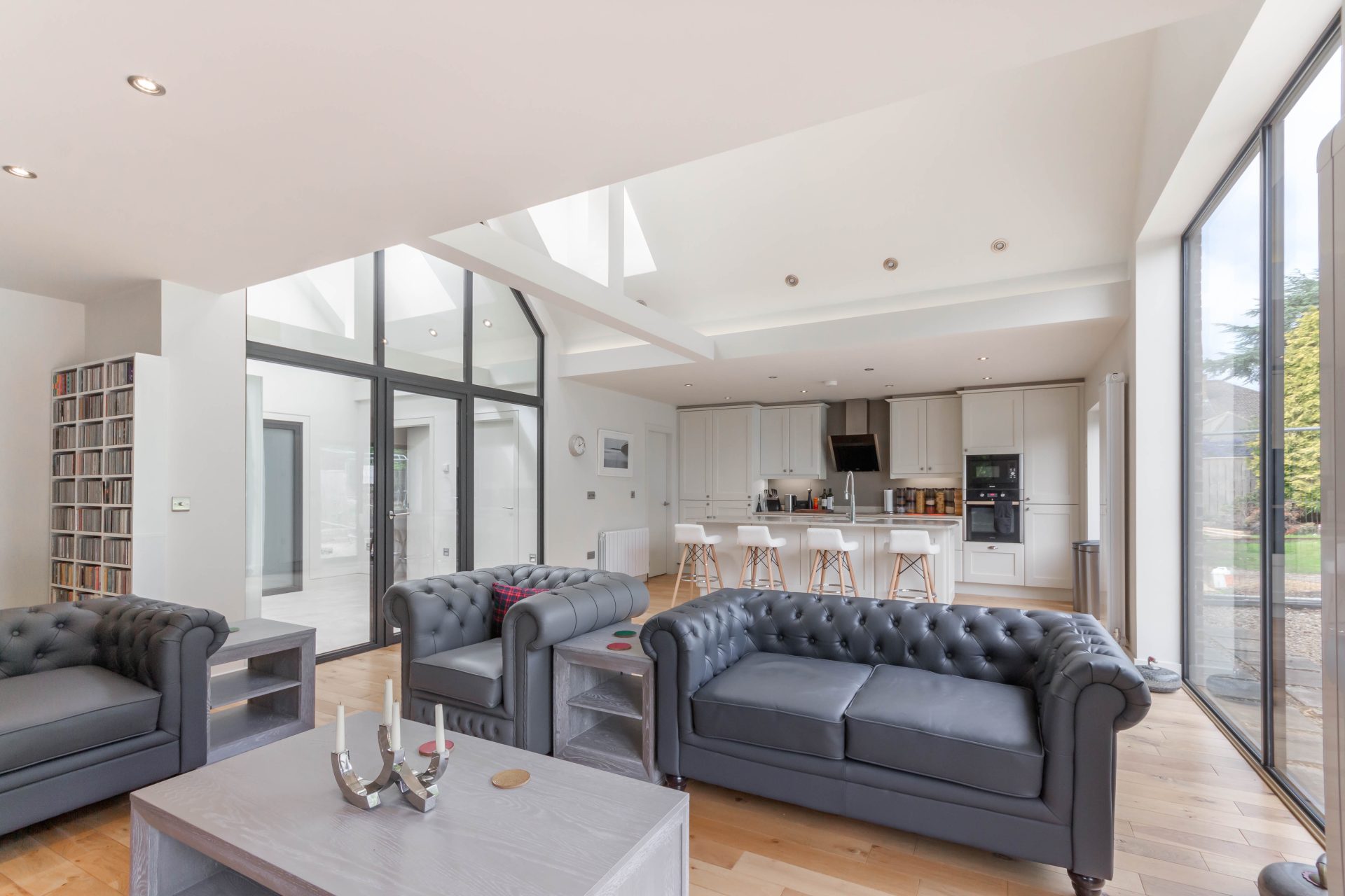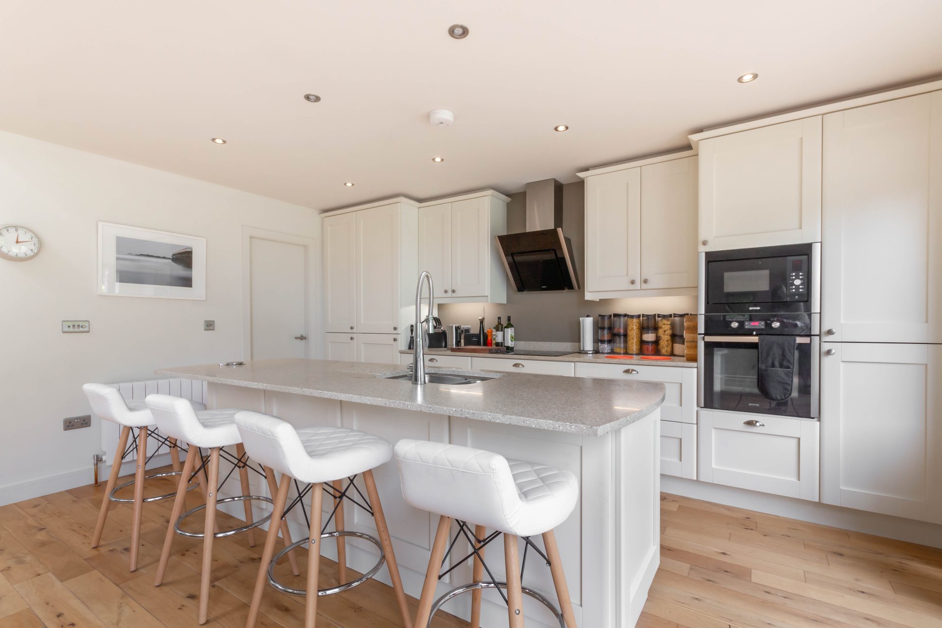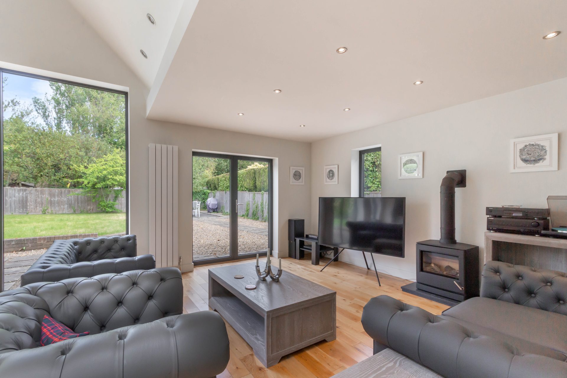 Vestibule | Winter atrium with good natural light from the double height ceiling, glazed doors to the open plan kitchen/living room and bedroom hallway | Large storage cupboard | Fabulous open plan kitchen/living room with glazed doors and windows to the garden, part vaulted ceiling, and feature fire | Modern fitted kitchen with an extensive range of cabinets, large central island/breakfast bar, and integrated appliances – hob, oven, dishwasher, fridge/freezer | Versatile living area with cast iron gas stove, and doors to the garden | Utility room with fitted cabinets and plumbing for washing machine | Bedroom hallway | Superb master bedroom with full height window and shutters | Ensuite shower/wc with double length shower, basin and wc | Guest double bedroom or separate living room, with full height windows and shutters | Double bedroom three | Bathroom/wc with separate double length shower | NO UPWARD CHAIN