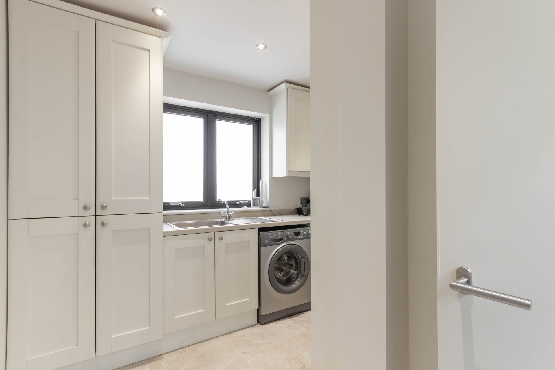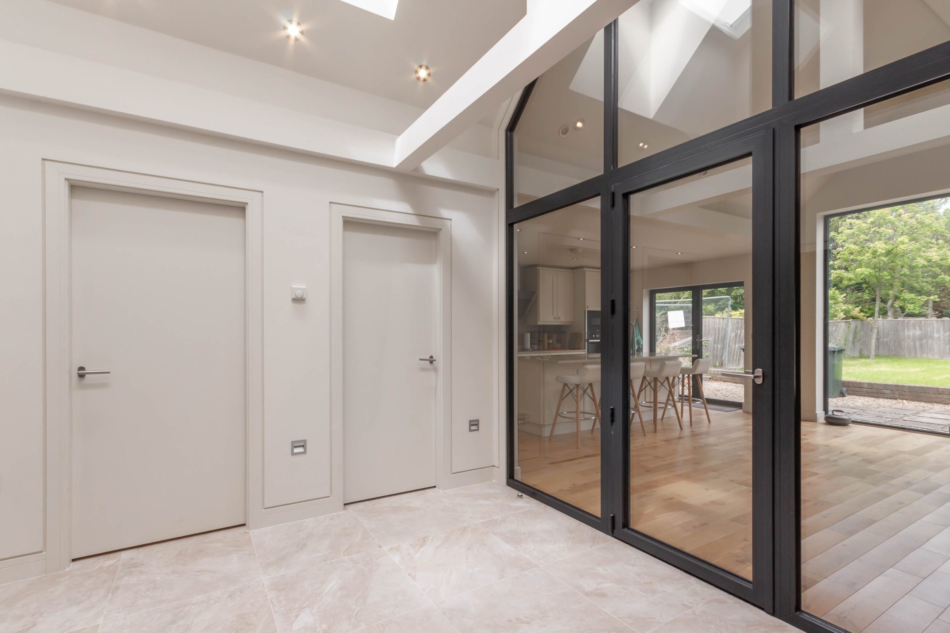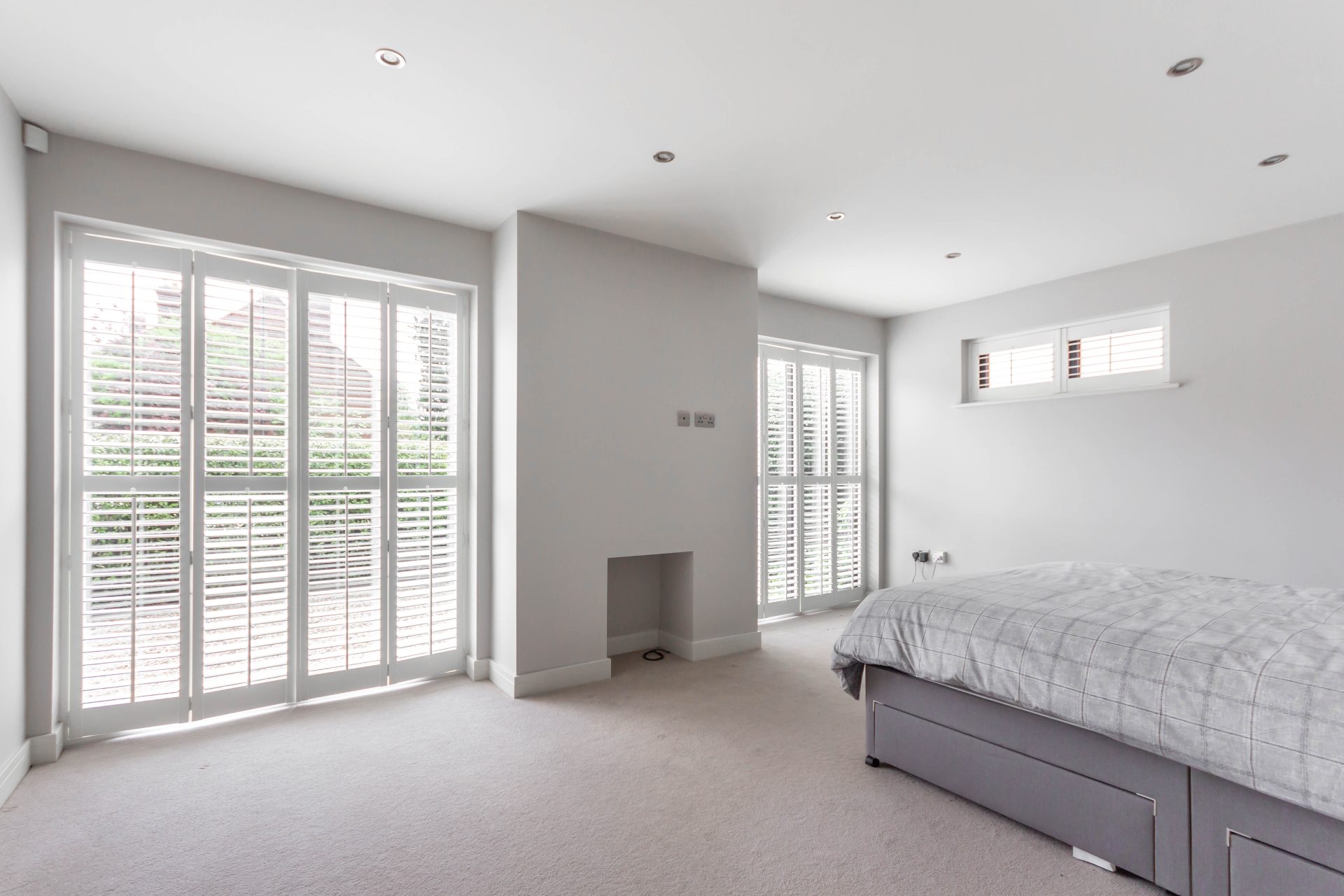 Vestibule | Winter atrium with good natural light from the double height ceiling, glazed doors to the open plan kitchen/living room and bedroom hallway | Large storage cupboard | Fabulous open plan kitchen/living room with glazed doors and windows to the garden, part vaulted ceiling, and feature fire | Modern fitted kitchen with an extensive range of cabinets, large central island/breakfast bar, and integrated appliances – hob, oven, dishwasher, fridge/freezer | Versatile living area with cast iron gas stove, and doors to the garden | Utility room with fitted cabinets and plumbing for washing machine | Bedroom hallway | Superb master bedroom with full height window and shutters | Ensuite shower/wc with double length shower, basin and wc | Guest double bedroom or separate living room, with full height windows and shutters | Double bedroom three | Bathroom/wc with separate double length shower | NO UPWARD CHAIN