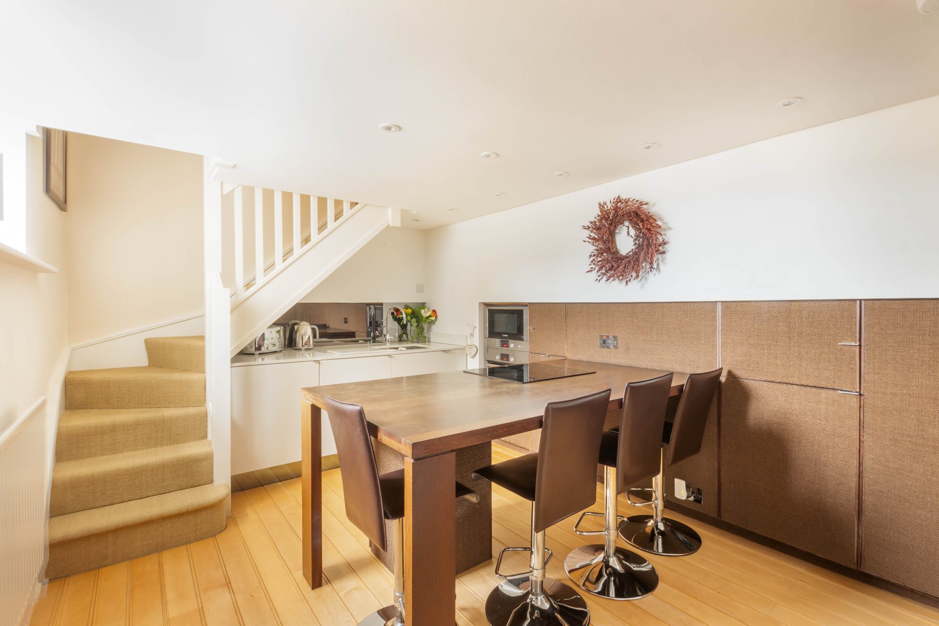 The modern kitchen/breakfast room is equipped with high quality Bosch integrated appliances, leather lined cabinetry that provides ample storage, and a convenient breakfast bar, perfect for casual dining or entertaining. A staircase leads up to a light filled open plan living area, creating a warm and inviting space for relaxation.