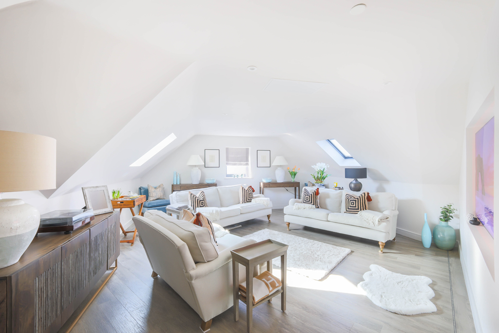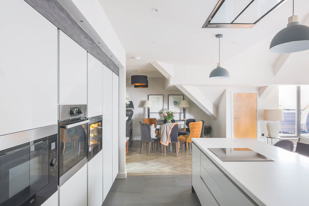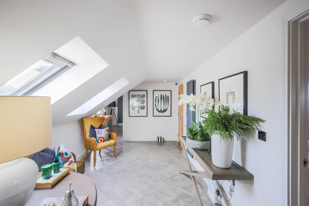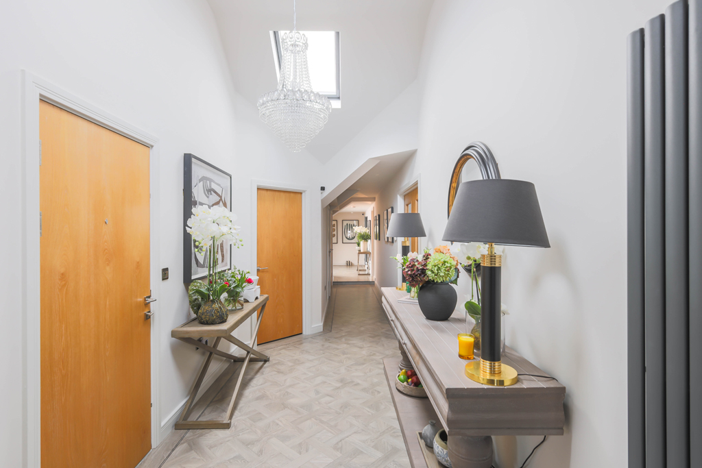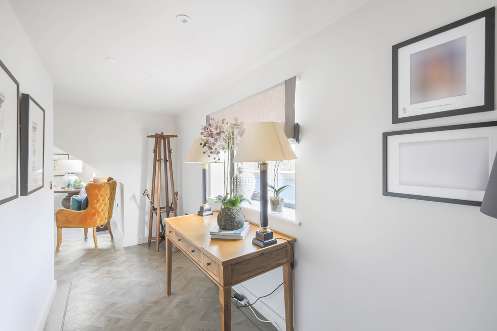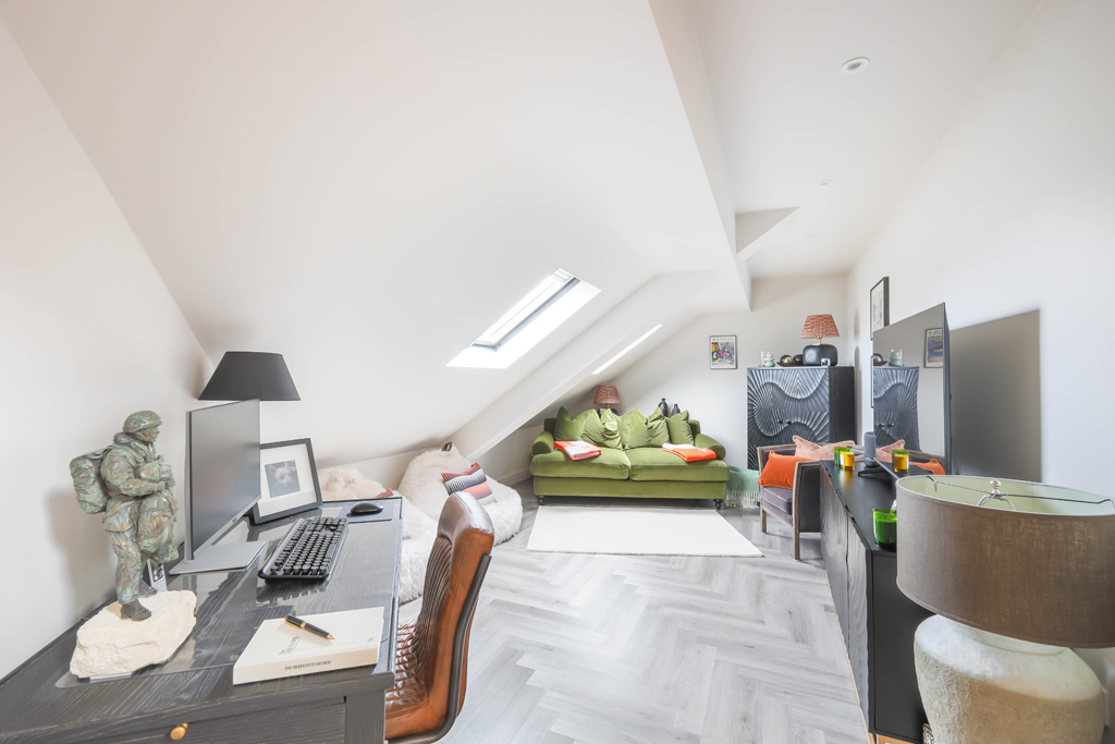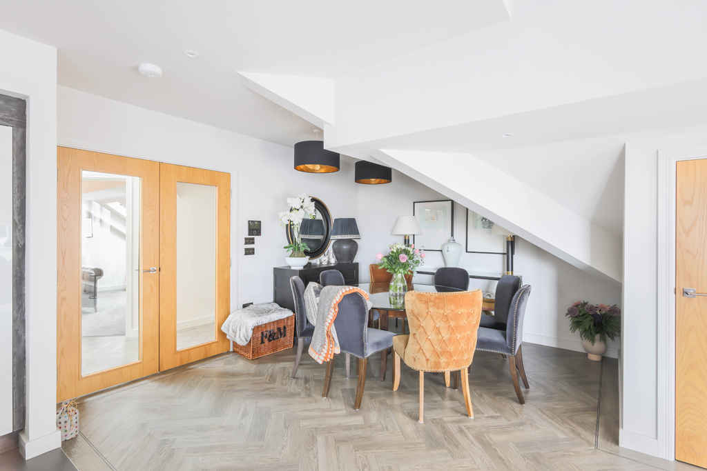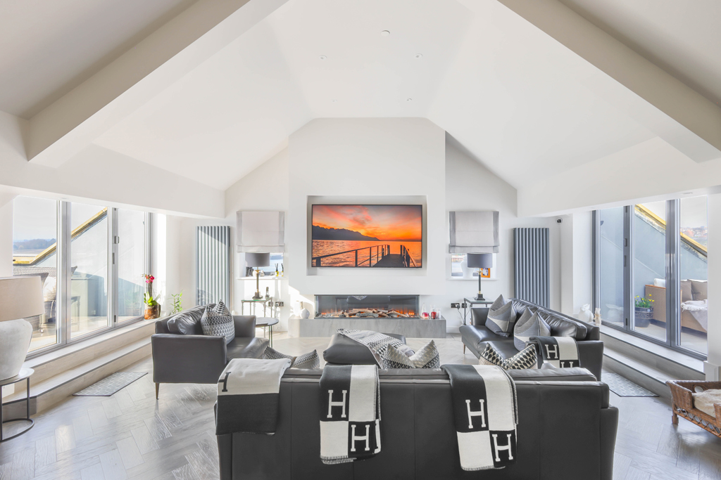 Boasting an exceptional level of internal space rarely found in modern apartments, the accommodation comprises: Secure communal entrance with stair and lift access to all floors | Private ground floor room currently utilised as a fully equipped private gym| Private entrance on the third floor | Entrance lobby with useful store cupboard | Spacious reception hallway offering Amtico flooring and Velux windows | Utility cupboard | Formal sitting room with triple aspect windows and media wall with inbuilt TV | Generous study offering versatile space, either as a study, formal dining room or fourth bedroom | Stunning open plan kitchen/diner/living room with pitched ceiling, two sets of glazed bifold doors and bespoke media wall incorporating a contemporary inset Evonic electric fire. | The kitchen is particularly impressive and boasts a range of modern cabinetry with quartz worktops, integrated appliances throughout and breakfast bar | Separate store cupboard.