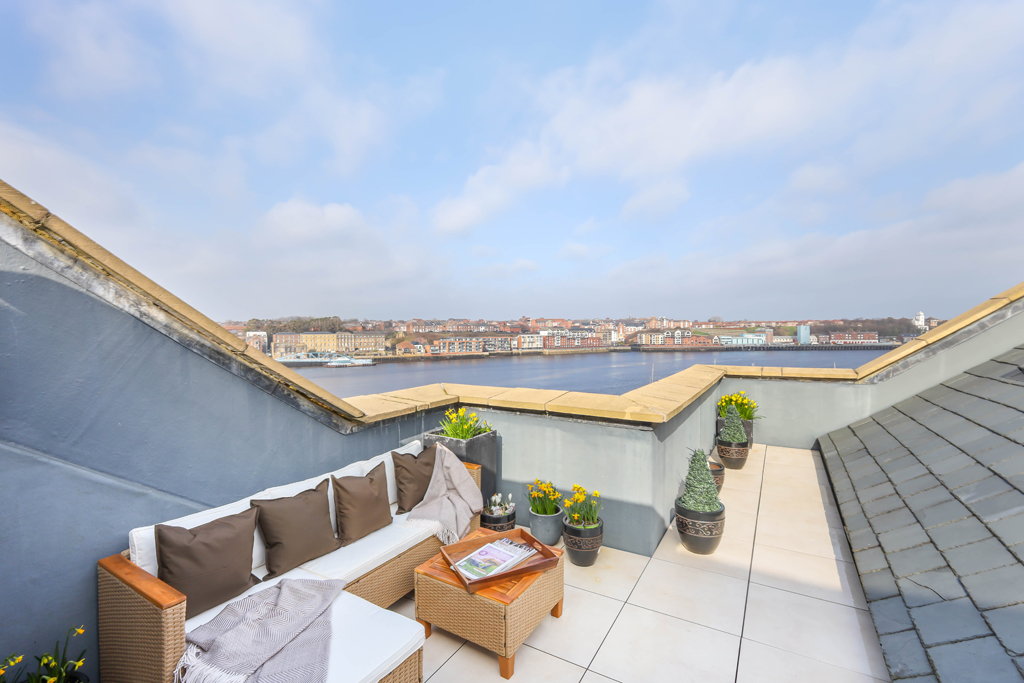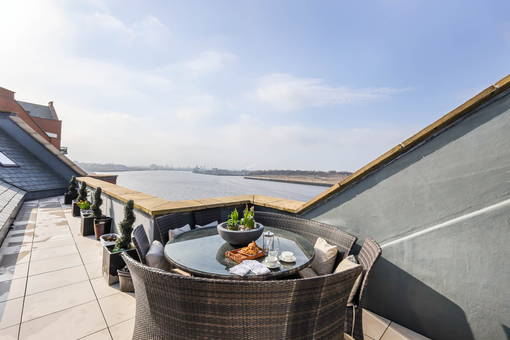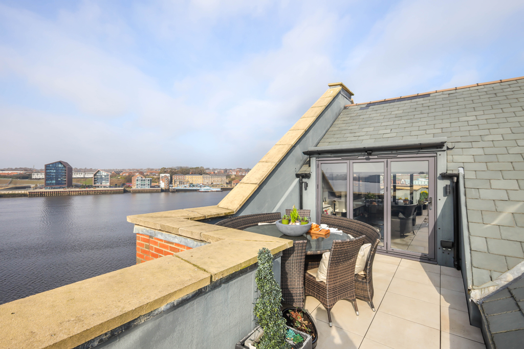 Externally, the property enjoys two allocated parking bays, as well as ample visitor parking | Access from the kitchen is granted to two substantial roof terraces, both of which benefit from non-slip Porcelain tiling and enviable westerly views over the River Tyne.