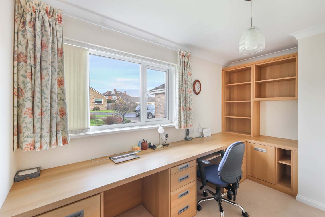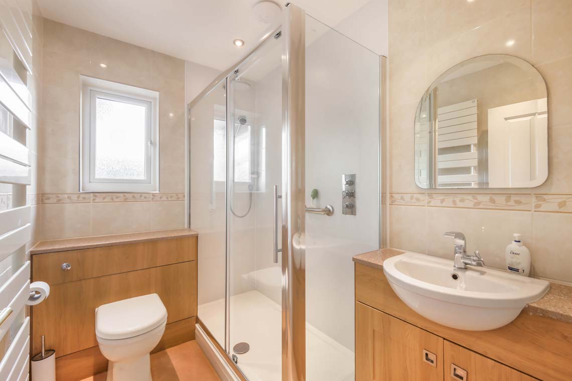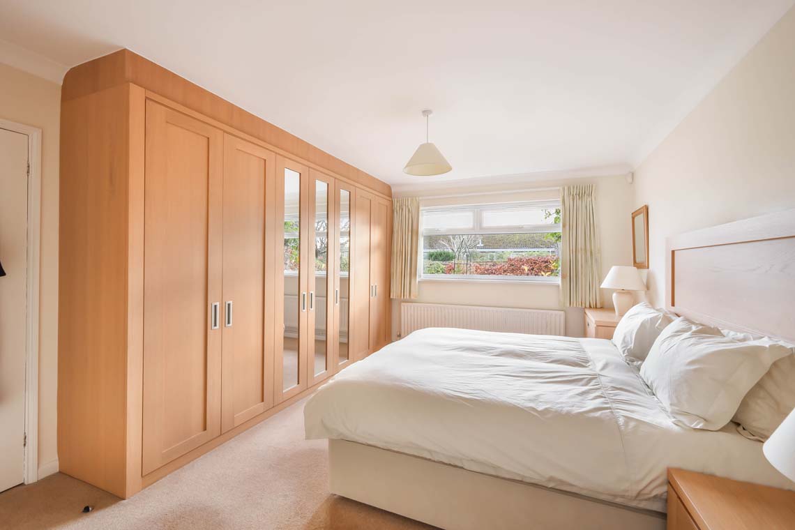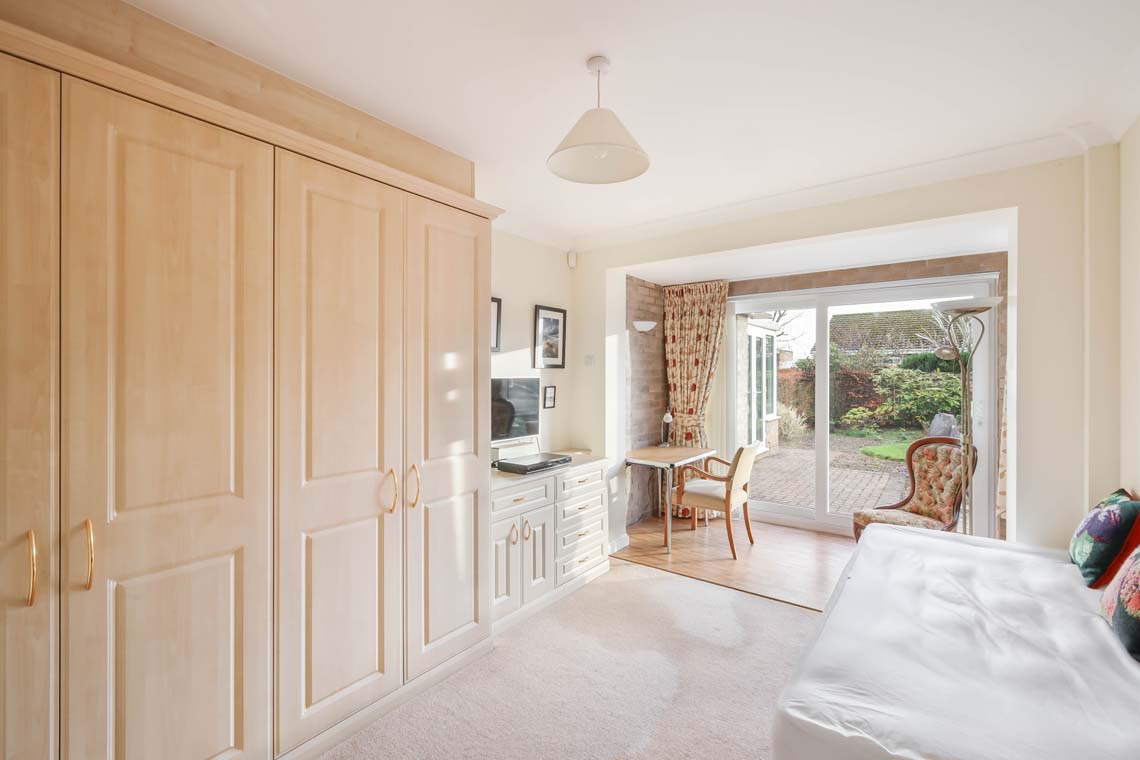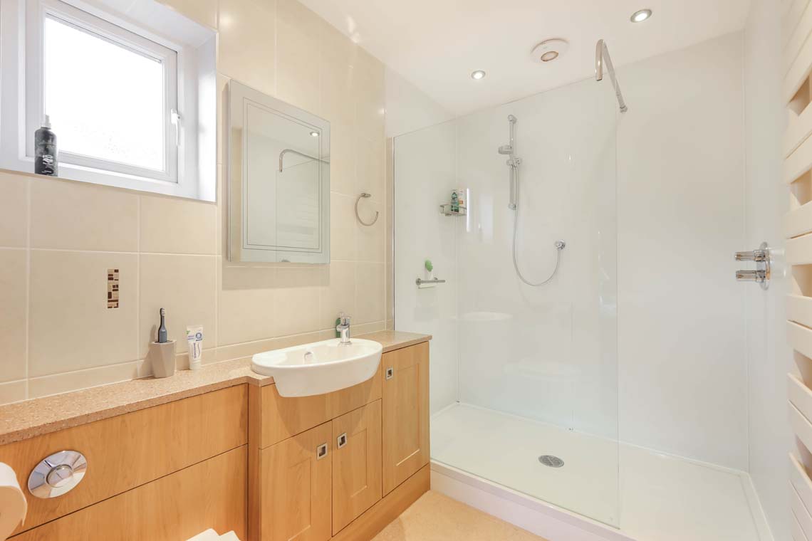 Bedrooms – Generous Master bedroom overlooking the rear garden, with an extensive range of fitted wardrobes to one wall | Ensuite with large walk in shower, WC and wash hand basin in a vanity unit, and chrome ladder radiator | Extended bedroom two, with sliding patio doors to the rear garden and built in wardrobes and drawers | Home office/bedroom three, fitted with office furniture & storage | Shower room with walk in shower with Rainfall head, WC, wash hand basin and chrome ladder radiator.