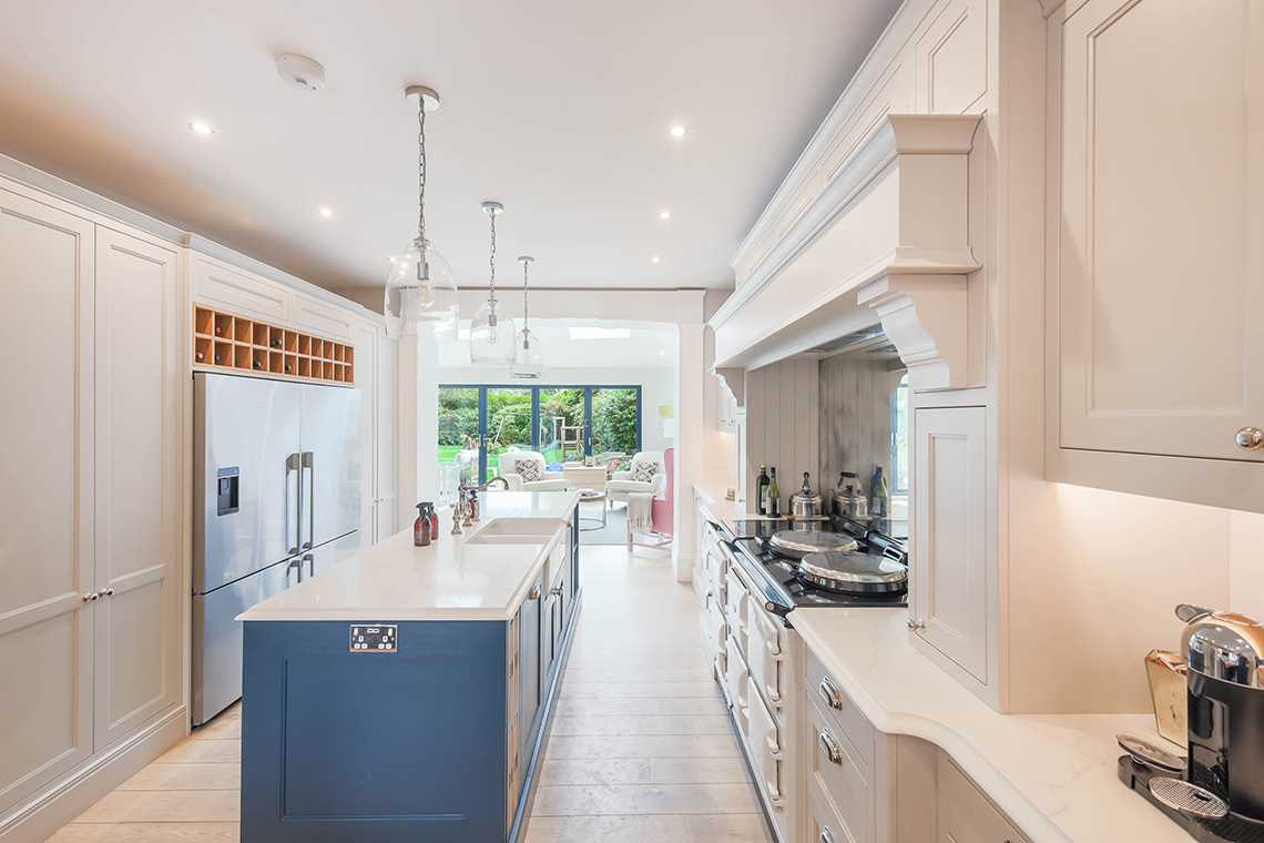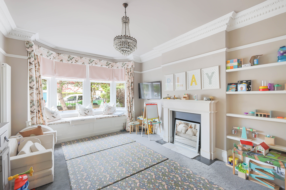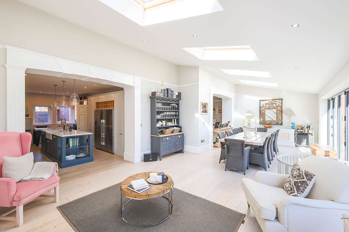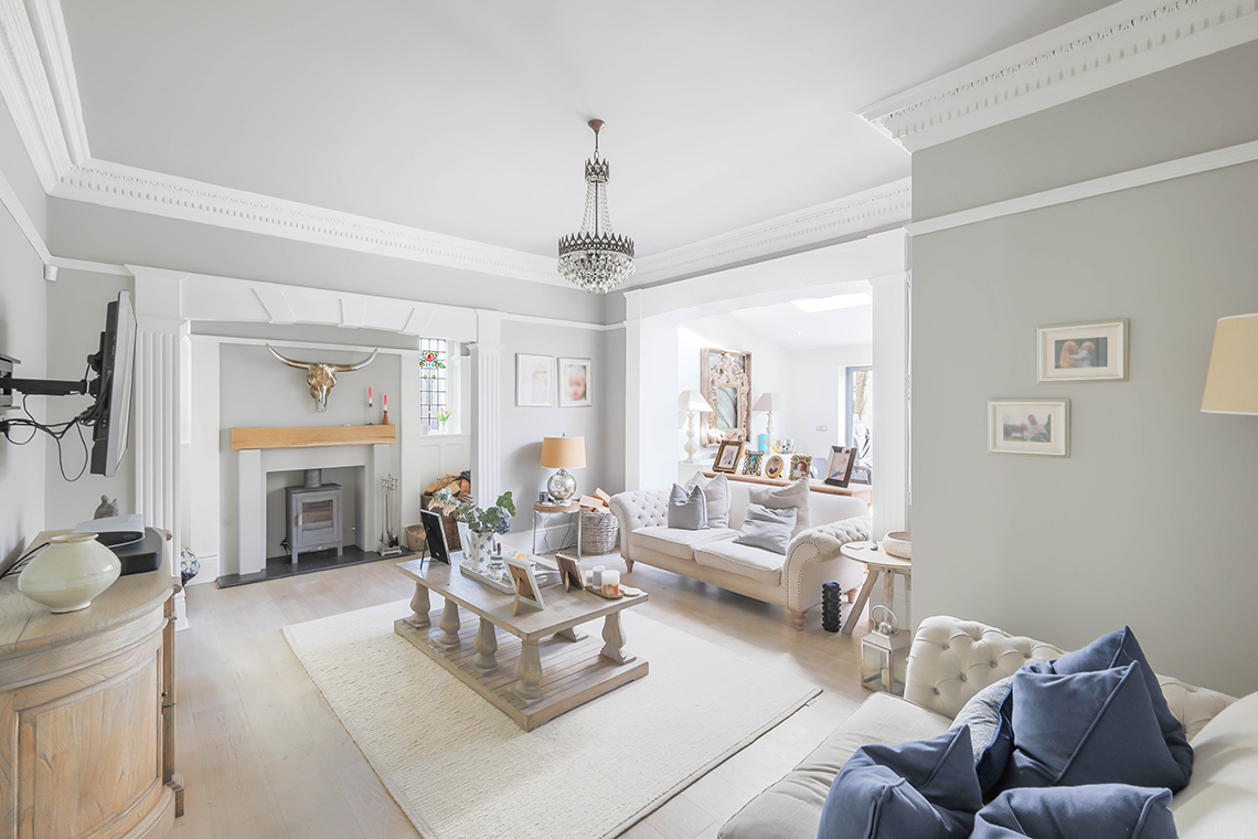 Ground Floor: Corner reception vestibule with lovely portico and seating | Reception hall with window seat and staircase to the first floor | Ground floor WC | Sitting room to the front of the house, currently utilised as a day to day playroom, with a super fireplace and a lovely bay window with bench seating | Stunning kitchen/dining/sitting area stretching the full width of the rear of the house with atrium roof providing natural light, and large windows/doors opening to the terrace | The kitchen is equipped with a range of contemporary cabinets, granite worktops, a central island and high quality appliances including Fisher & Paykel refrigeration and a gas fired AGA; there is also bench seating providing a breakfast area | Formal lounge with inglenook fireplace with log burning stove | Laundry/utility room