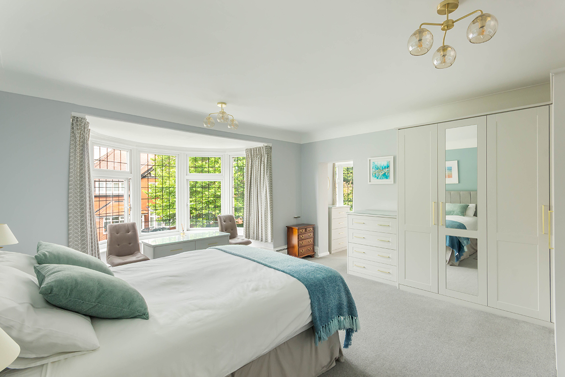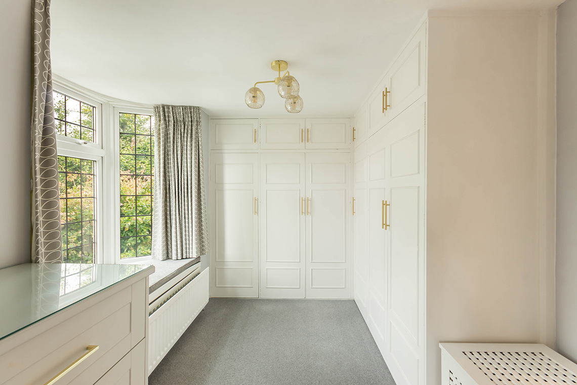 The staircase then leads up to the first floor landing and onto four bedrooms | The principal suite runs across the front of the property and benefits from a large double room leading through to a dressing room with ample bespoke fitted wardrobes and bay window with bench seat | Well presented ensuite shower room WC with double sink and bidet | Bedroom two is a further generous double room to the rear with vanity unit & basin | Bedrooms three and four are further double bedrooms, with bedroom three offering a separate study area | Family bathroom with contemporary four piece suite.