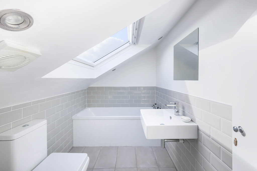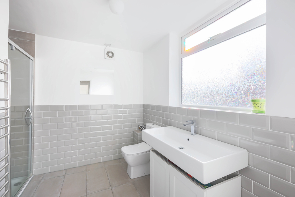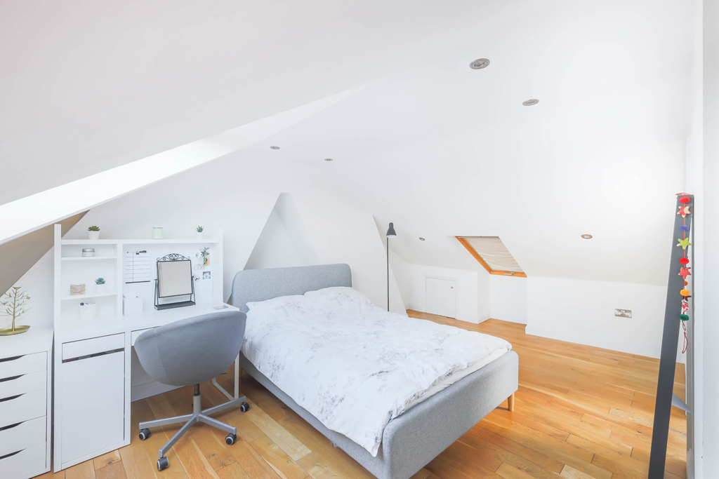 The living area is particularly impressive and offers excellent space to comfortably accommodate both living and dining furniture. The room is filled with natural light from the attractive double-glazed windows, creating a bright and inviting atmosphere added with a convenient storage cupboard. A door from the living area leads through to the contemporary fitted kitchen with wall and base units, gas hob and oven, sleek worktops with white splashback tiles. Adjacent to this is the modern, partially tiled bathroom, fitted with a walk-in shower, WC, wash hand basin, and chrome heated towel rail. The top floor provides a spacious principal suite, with ample eaves storage, Velux windows allowing natural light to fill the room and benefitting from a well-appointed en-suite with a bath, w/c and sink.
