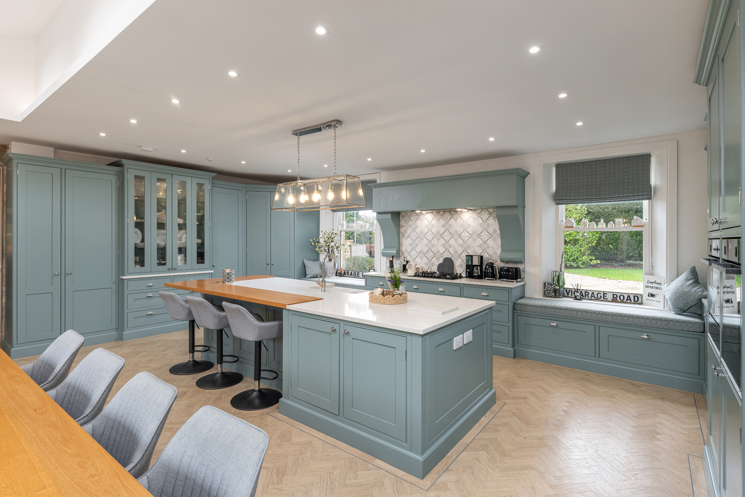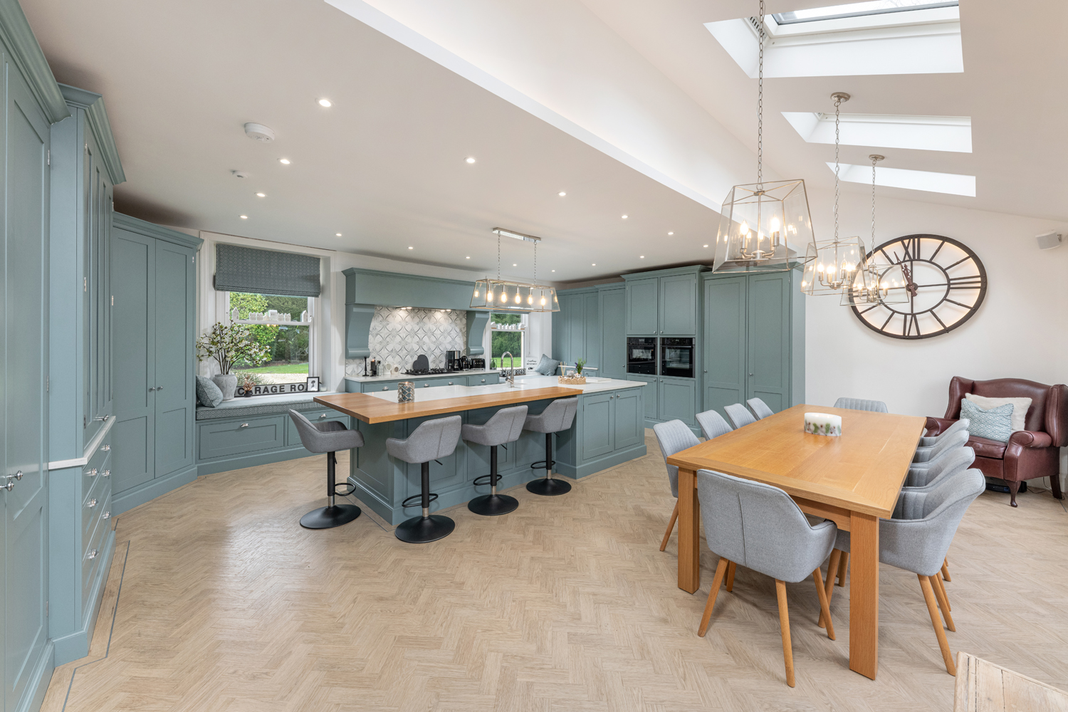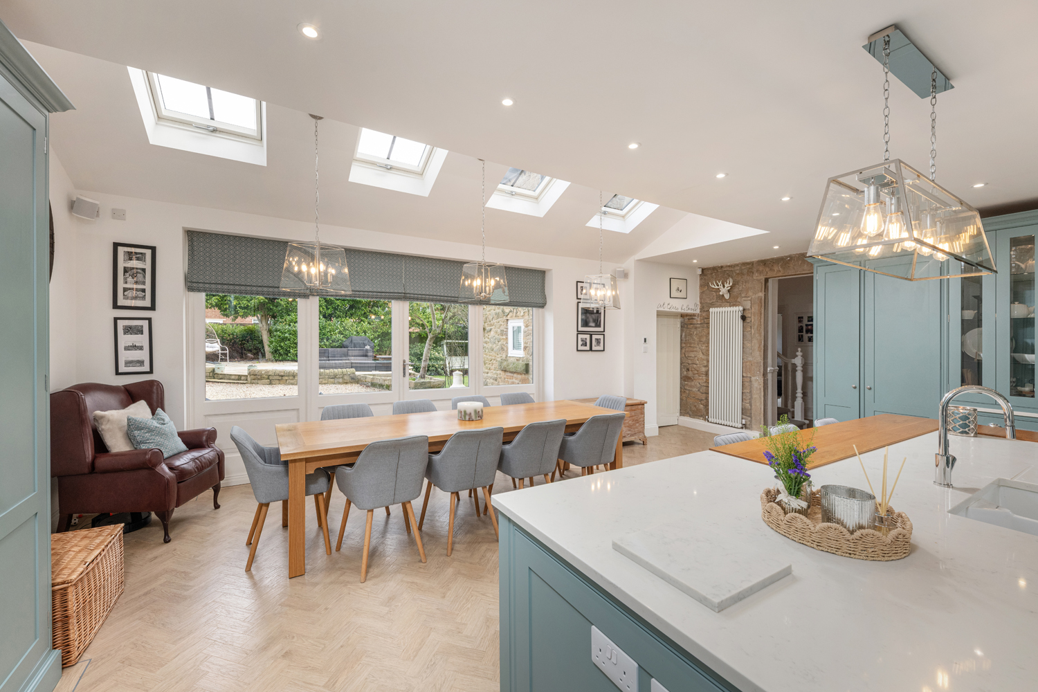 The internal accommodation comprises: Spacious entrance hallway with bespoke fitted storage staircase leading to the first floor | Stunning and extended open plan kitchen & dining room with dual aspect views and glazed French doors leading onto the rear garden. The kitchen is highly impressive and boasts a range of modern cabinetry& worktops, integrated appliances throughout and a large central island | Ground floor WC & utility room | Formal sitting room with feature log burning stove and bay window | Separate lounge, also with log burner | Understairs store.