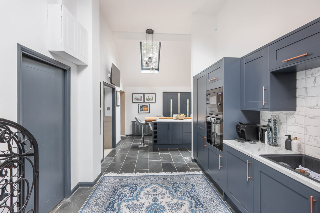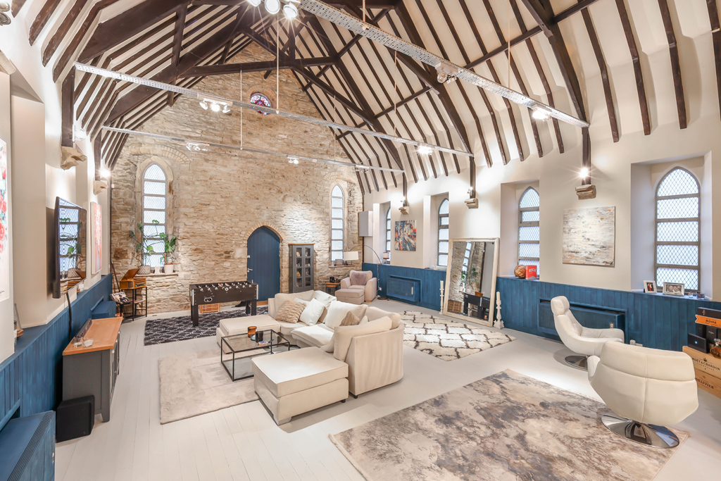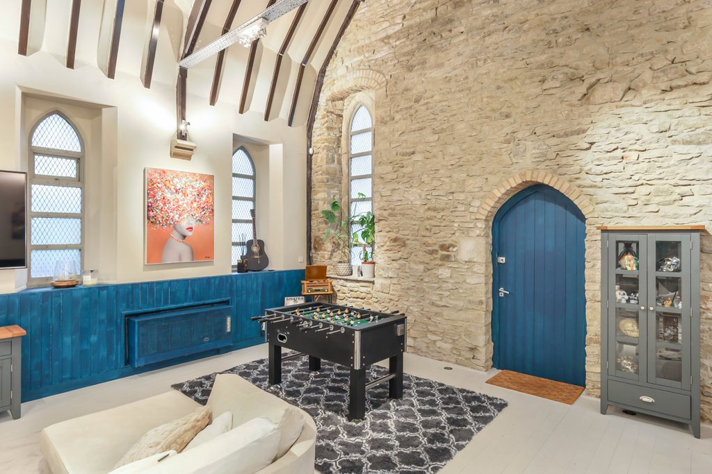 The property is accessed via an entrance vestibule, which leads into the most outstanding lounge space that immediately sets the tone for the home. This stunning area features striking vaulted ceilings, exposed beams and beautiful stained glass windows, all of which pay tribute to the building’s heritage. The space has been thoughtfully arranged to accommodate a games area, living space and dining area to the rear, creating a warm and inviting environment that forms the heart of the former church.