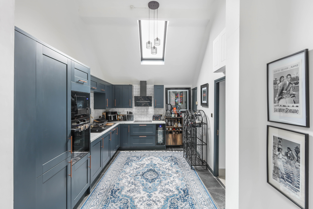 From the rear of the living space, a staircase leads up into the open plan kitchen and dining area. The kitchen is exceptionally well appointed, offering modern cabinetry, sleek work surfaces, integrated appliances and a generous central island, making it both highly functional and ideal for entertaining. From here, there is access to the family bathroom which benefits from a contemporary bathroom suite, as well as two separate guest WC facilities.