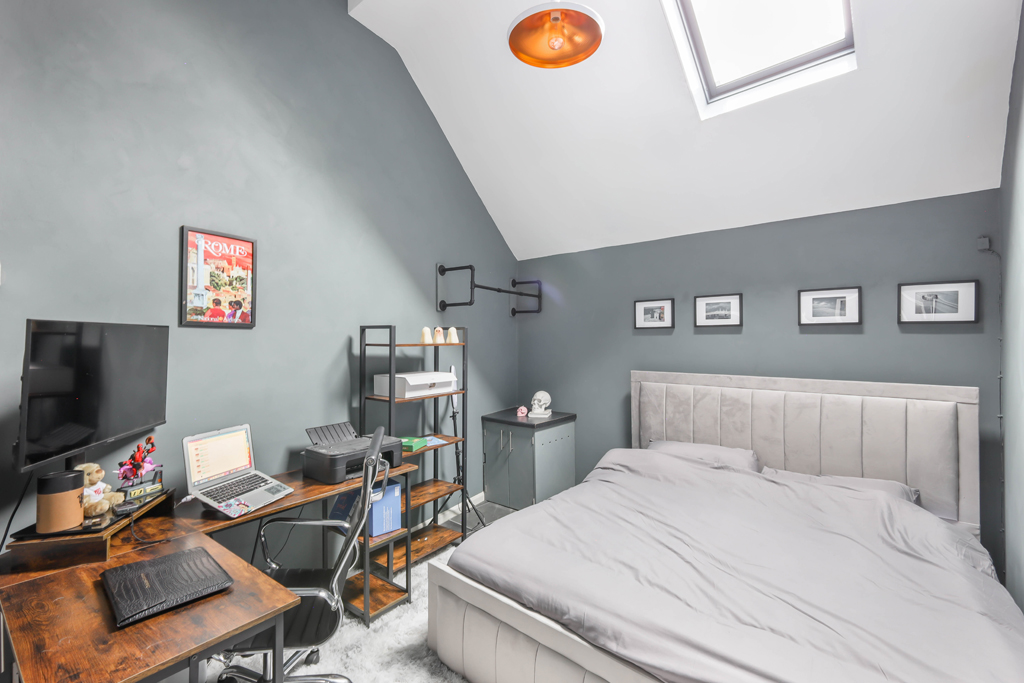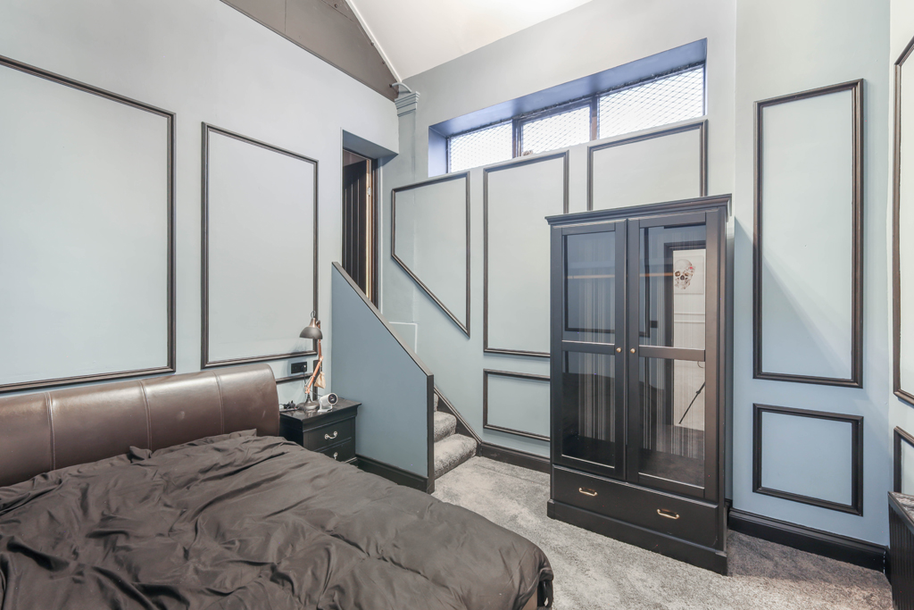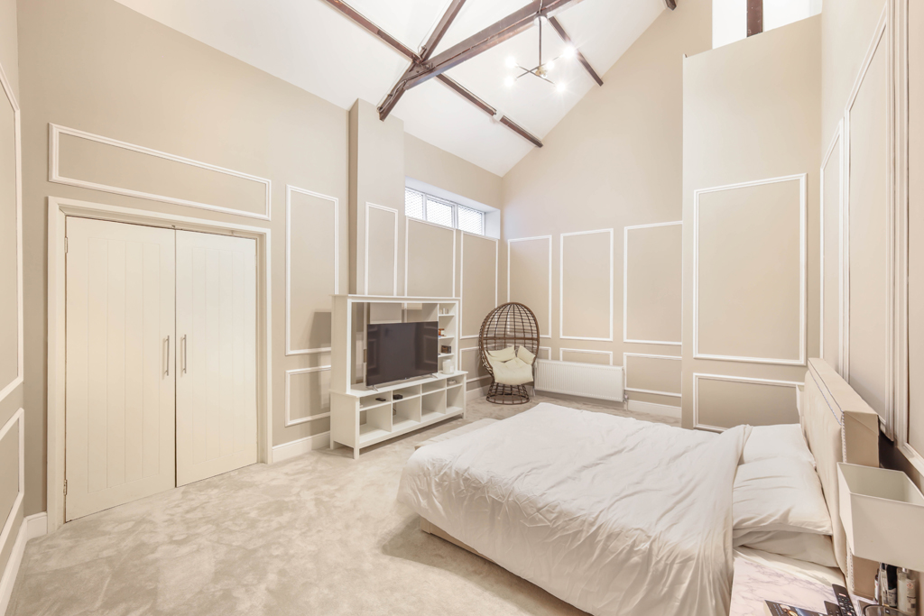 A doorway from the kitchen leads through to bedroom three, a spacious double bedroom that features a mezzanine level above, complete with a striking circular window that overlooks the main reception space below. A further staircase rises from the kitchen area to a cosy snug or additional family room which in turn, leads to three further generously sized double bedrooms, each offering excellent proportions and flexibility of use.