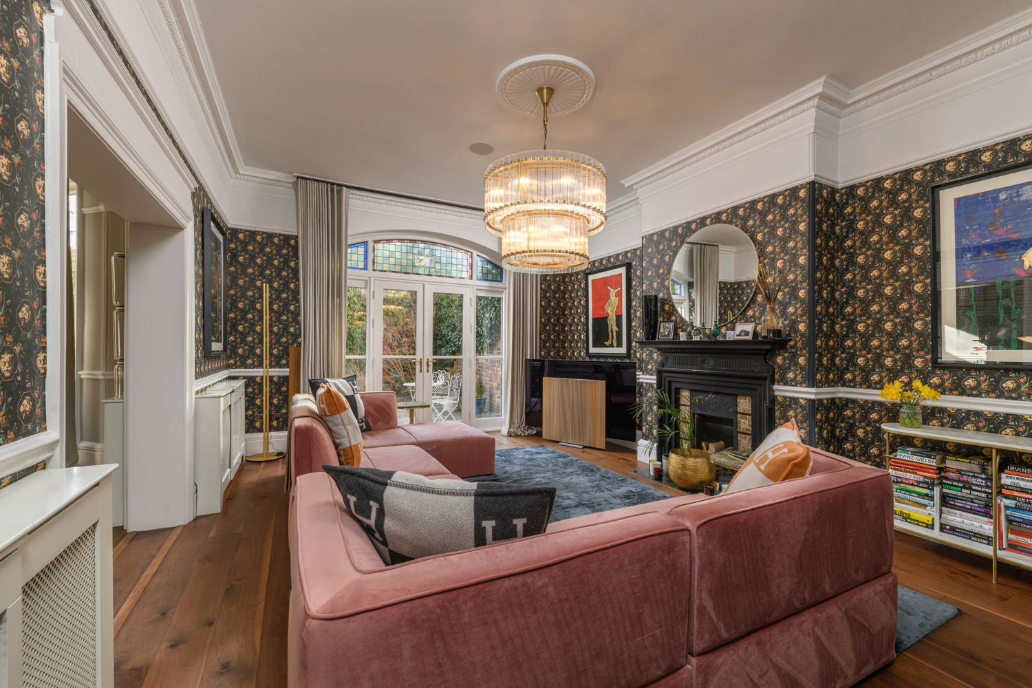 The reception hallway leads onto three principal reception rooms, to the front elevation is a formal dining room with a superb fireplace. To the rear, an elegant drawing room, also with an elegant fireplace, enjoying delightful garden views and direct access to the terrace via patio doors with the original stained glass having been reconditioned and rendered. An open doorway leads through to the expansive family living and day to day dining kitchen, extending from the front to the rear of the house.