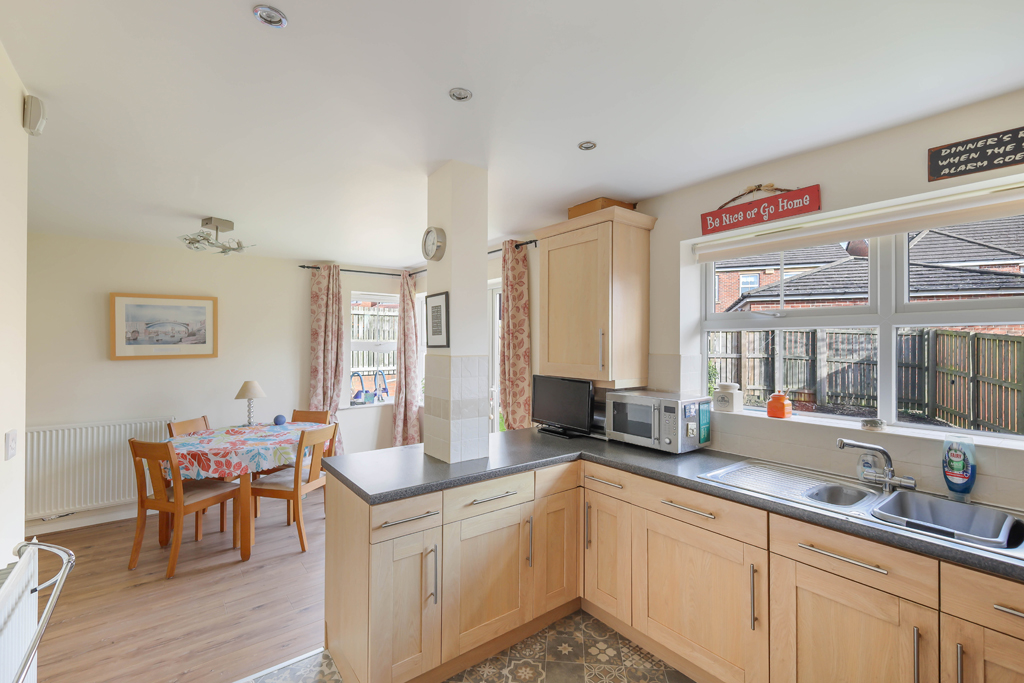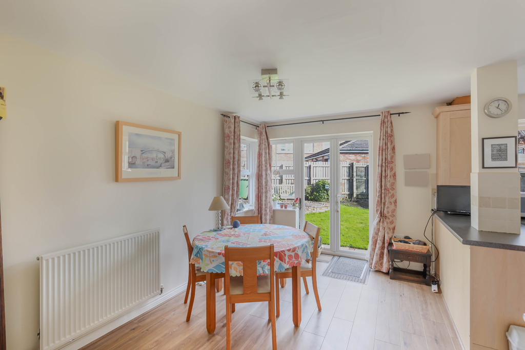 Ground floor – Reception hallway with under stairs storage cupboard | Sitting room with French doors opening to the rear garden and window to the front overlooking the green | Dining room/study | Generous family kitchen/breakfast room with French doors opening to the garden and feature corner window allowing for excellent natural light | Kitchen fitted with a range of cabinets, with an integrated gas hob, electric oven, dishwasher and fridge/freezer | Utility room with plumbing for a washing machine and space for a tumble drier | Ground floor WC.