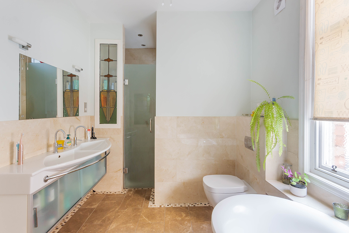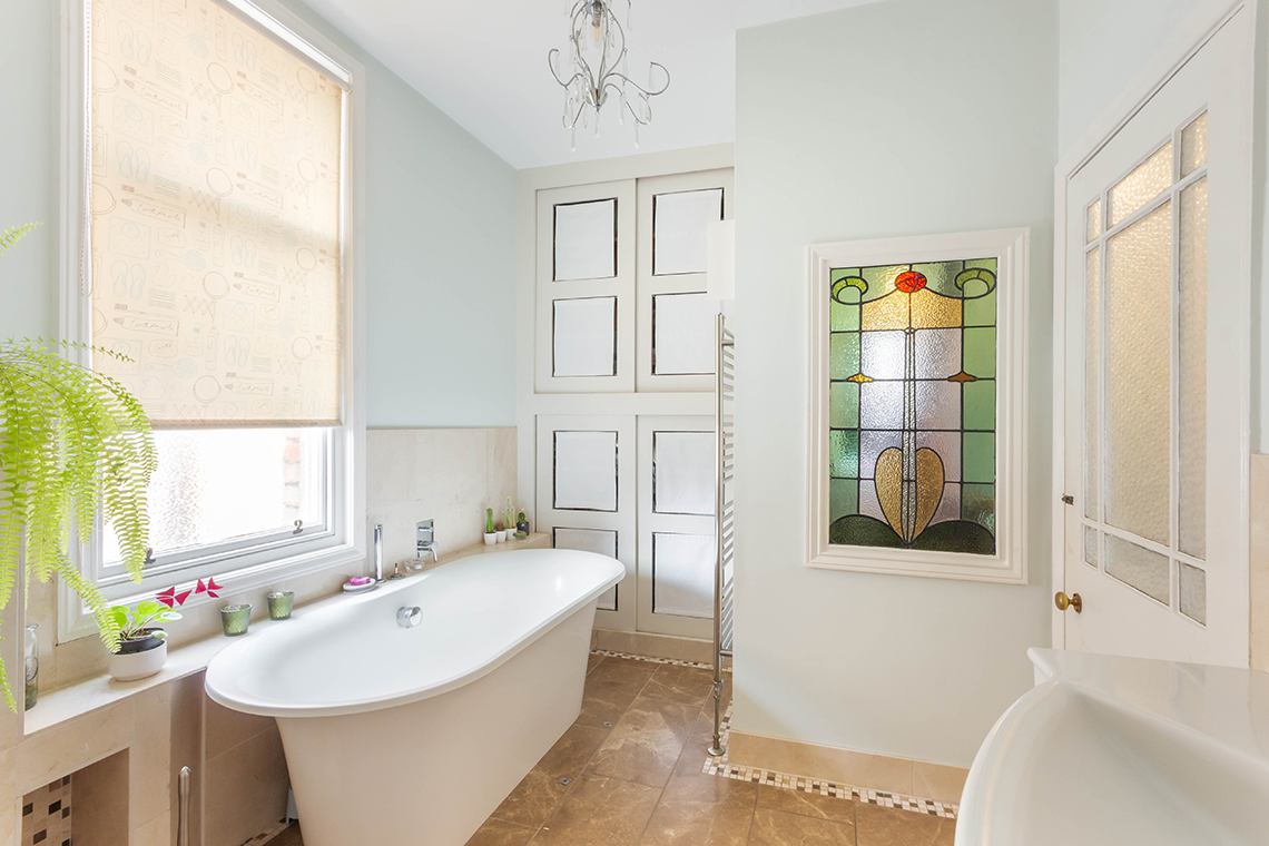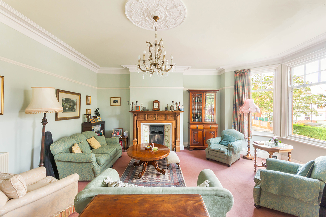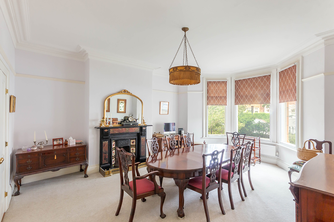 First Floor: Very impressive drawing room, stretching across the full width of the house and ideal for entertaining, with beautiful bay window and feature fireplace | Two double bedrooms, one of which has an ensuite WC | Family bathroom, recently refitted, with a feature stained and leaded glass window