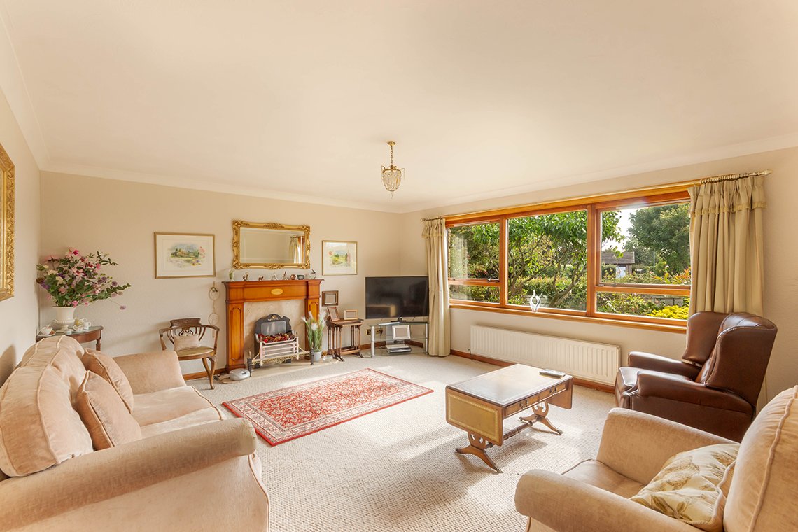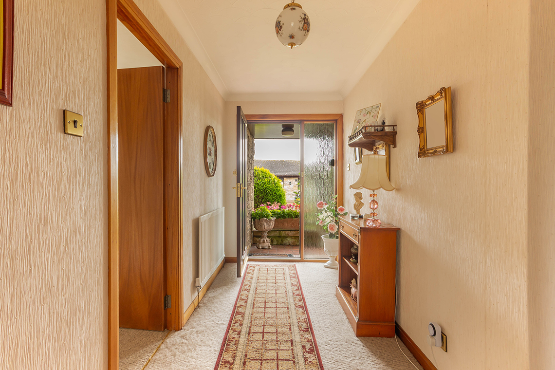 Accommodation – L-shaped entrance hallway with a built-in cloaks cupboard | Generous sitting room, with a window overlooking the front garden, and a marble